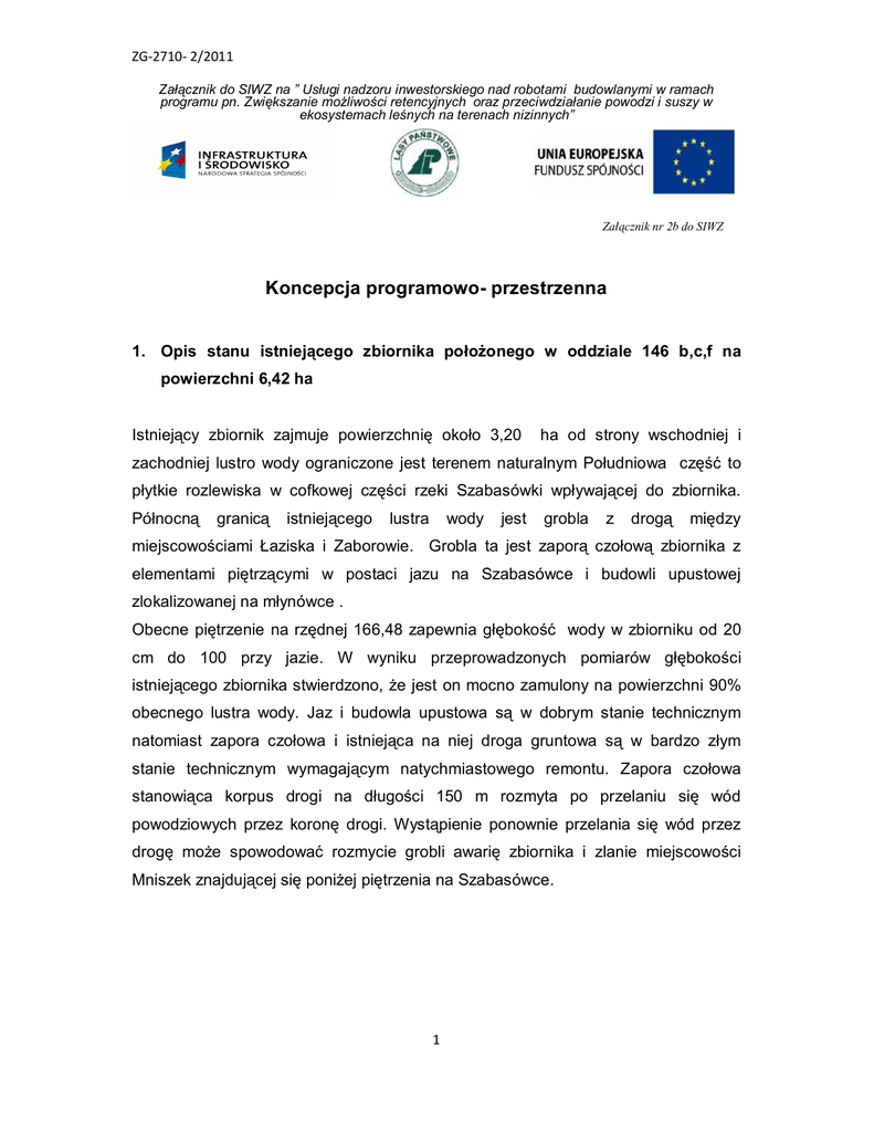 ZG-2710- 2/2011 Załącznik do SIWZ na ” Usługi nadzoru inwestorskiego nad robotami budowlanymi w ramach programu pn. Zwiększanie możliwości retencyjnych oraz przeciwdziałanie powodzi i suszy w ekosystemach leśnych na terenach nizinnych” Załącznik nr 2b do SIWZ Koncepcja programowo- przestrzenna 1. Opis stanu istniejącego zbiornika położonego w oddziale 146 b,c,f na powierzchni 6,42 ha Istniejący zbiornik zajmuje powierzchnię około 3,20 ha od strony wschodniej i zachodniej lustro wody ograniczone jest terenem naturalnym Południowa część to płytkie rozlewiska w cofkowej części rzeki Szabasówki wpływającej do zbiornika. Północną granicą istniejącego lustra wody jest grobla z drogą między miejscowościami Łaziska i Zaborowie. Grobla ta jest zaporą czołową zbiornika z elementami piętrzącymi w postaci jazu na Szabasówce i budowli upustowej zlokalizowanej na młynówce . Obecne piętrzenie na rzędnej 166,48 zapewnia głębokość wody w zbiorniku od 20 cm do 100 przy jazie. W wyniku przeprowadzonych pomiarów głębokości istniejącego zbiornika stwierdzono, że jest on mocno zamulony na powierzchni 90% obecnego lustra wody. Jaz i budowla upustowa są w dobrym stanie technicznym natomiast zapora czołowa i istniejąca na niej droga gruntowa są w bardzo złym stanie technicznym wymagającym natychmiastowego remontu. Zapora czołowa stanowiąca korpus drogi na długości 150 m rozmyta po przelaniu się wód powodziowych przez koronę drogi. Wystąpienie ponownie przelania się wód przez drogę może spowodować rozmycie grobli awarię zbiornika i zlanie miejscowości Mniszek znajdującej się poniżej piętrzenia na Szabasówce. 1 ZG-2710- 2/2011 Załącznik do SIWZ na ” Usługi nadzoru inwestorskiego nad robotami budowlanymi w ramach programu pn. Zwiększanie możliwości retencyjnych oraz przeciwdziałanie powodzi i suszy w ekosystemach leśnych na terenach nizinnych” 2. Opis terenu w miejscu lokalizacji zbiornika Lokalizacja zbiornika planowana jest na terenie istniejącego zbiornika, zamulonego w trakcie eksploatacji, który obecnie jest użytkiem ekologicznym. Obszar przeznaczony pod zalanie to lokalne obniżenie terenu będące w oddziaływaniu piętrzenia jazu na rzece Szabasówce w naturalny sposób ograniczone od wschodu zachodu lasami Nadleśnictwa Radom o od południa terenami bagiennymi doliny rzecznej. Czasza projektowanego zbiornika jest zamulona porośnięte roślinnością związaną z terenami okresowo podmokłymi i mokrymi. 3. Ocena wpływu na środowisko Wykonanie zbiornika w planowanym miejscu spowoduje jedynie pozytywny wpływ na okoliczny teren. Stworzony zostanie rezerwuar wody dla ptactwa wodnego i zwierzyny leśnej. Planowany zbiornik będzie miał zróżnicowane głębokościowo dno co pozwoli na rozwój przybrzeżnej roślinności szuwarowej oraz różnych gatunków roślin wodnych. Zwiększona zostanie retencja gruntowa i podniesie się poziom wód podskórnych co pozytywnie wpłynie na drzewostan będący w oddziaływaniu piętrzenia zbiornika 4. Charakterystyka geologiczna terenu zbiornika. Okolice Łazisk, pod względem geologicznym, zbudowane są głównie z osadów mezozoicznych okresu jurajskiego oraz utworów trzeciorzędowych. Występują tu liczne surowce mineralne, jak: ruda żelaza, wapień, margiel, piaskowiec, gliny ogniotrwałe i ceramiczne oraz żwiry i piaski. Gleby należą do średniej i niskiej jakości. Są to przeważnie bielicowe na podłożu kamiennym, piaszczystym i 2 ZG-2710- 2/2011 Załącznik do SIWZ na ” Usługi nadzoru inwestorskiego nad robotami budowlanymi w ramach programu pn. Zwiększanie możliwości retencyjnych oraz przeciwdziałanie powodzi i suszy w ekosystemach leśnych na terenach nizinnych” gliniastym. Niewiele jest gleb brunatnych i rędzin mieszanych. Na terenie planowanej inwestycji w rejonie jazu wykonano odwiert geologiczny głębokości 2,0 m w którym warstwy gruntu układały się następująco: 0,0 – 0,20 gleba 0,20 – 0,80 namuł z piaskiem 0,80- 1,50 piasek średnioziarnisty 1,50- 2,00 pospółka 5. Schemat funkcjonalno przestrzenny zagospodarowania zbiornika Północna część zbiornika ograniczona jest istniejącą zaporą czołową z drogą lokalną o nawierzchni gruntowej w której zlokalizowane są budowle piętrzące planowane jest podniesienie korony drogi do rzędnej nawierzchni mostu tj. do rzędnej 168,42 oraz utwardzenie jej tłuczniem ograniczonym krawężnikami betonowymi. Zaporę czołową od strony wody należy zabezpieczyć przed bobrami i falowaniem poprzez montaż ocynkowanej siatki stalowej i narzut kamienny o grubości 50 cm. Czasza zbiornika zostanie pogłębiona średnio o 0,90 cm a grunt w ten sposób uzyskany wbudowany zostanie w brzegi zbiornika – wschodni i zachodni do naturalnej granicy jaką stanowi warstwica terenu o rzędnej 170 m npm. Południowa część zbiornika ograniczona będzie terenem w formie płytkiego rozlewiska w cofce zbiornika wodnego o głębokości 20 – 40 cm. 6. Obliczenie kubatury robót ziemnych oraz ewentualnego podwyższenia terenu wokół zbiornika Wykonanie zbiornika na powierzchni 6,0 ha pogłębianego aby osiągnąć zamierzoną retencję wody wiąże się ze średnim wykopem o głębokości ok 90 cm i robotami 3 ZG-2710- 2/2011 Załącznik do SIWZ na ” Usługi nadzoru inwestorskiego nad robotami budowlanymi w ramach programu pn. Zwiększanie możliwości retencyjnych oraz przeciwdziałanie powodzi i suszy w ekosystemach leśnych na terenach nizinnych” ziemnymi rzędu 54 000 m 3 . Aby obniżyć koszty inwestycji konieczne jest zagospodarowanie urobku w bezpośredniej bliskości zbiornika. W tym celu należy usunąć drzewa z terenu przyległego do zbiornika na działkach nr 504 i 503/2 należących do LP . Powstała w ten sposób powierzchnia posłuży do zdeponowania gruntu z czaszy zbiornika i pozwoli na podniesienie terenu o ok. 80 cm nad projektowane lustro wody. 7. Analiza dróg dojazdowych d