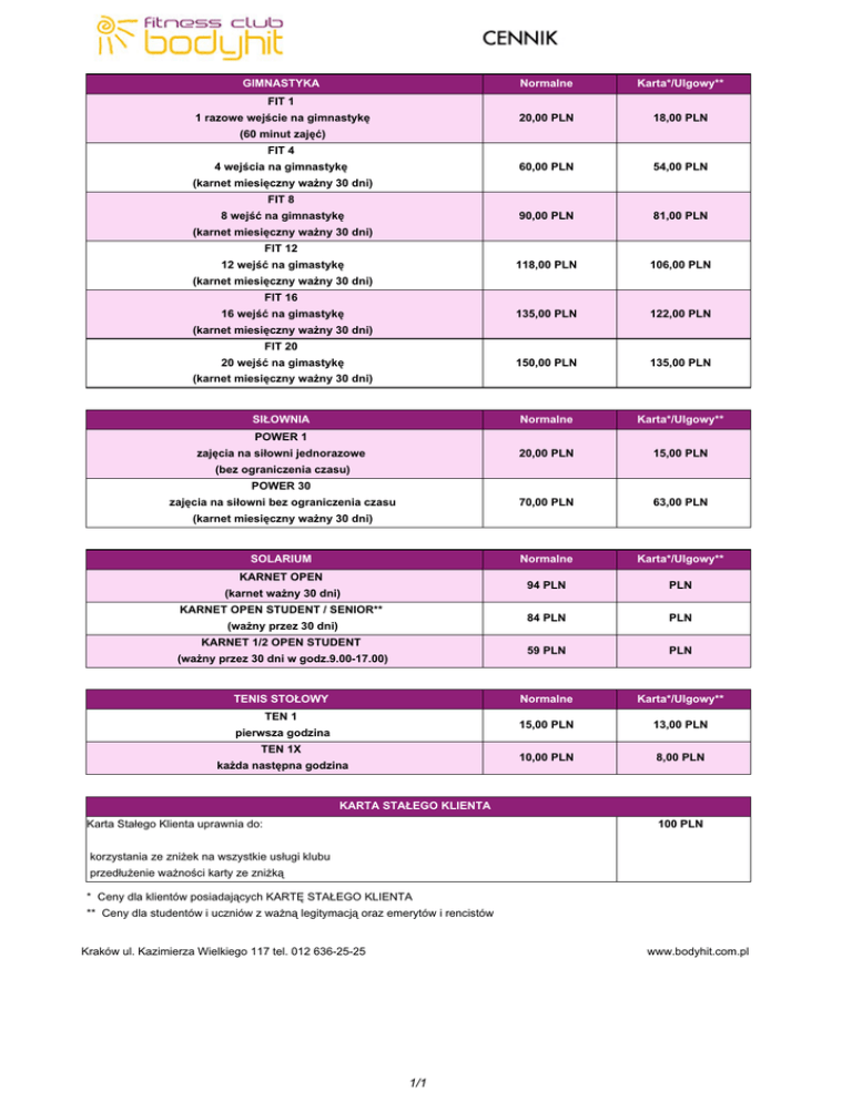 GIMNASTYKA Normalne Karta*/Ulgowy** 20,00 PLN 18,00 PLN 60,00 PLN 54,00 PLN 90,00 PLN 81,00 PLN 118,00 PLN 106,00 PLN 135,00 PLN 122,00 PLN 150,00 PLN 135,00 PLN Normalne Karta*/Ulgowy** 20,00 PLN 15,00 PLN 70,00 PLN 63,00 PLN Normalne Karta*/Ulgowy** 94 PLN PLN 84 PLN PLN 59 PLN PLN Normalne Karta*/Ulgowy** 15,00 PLN 13,00 PLN 10,00 PLN 8,00 PLN FIT 1 1 razowe wejście na gimnastykę (60 minut zajęć) FIT 4 4 wejścia na gimnastykę (karnet miesięczny ważny 30 dni) FIT 8 8 wejść na gimnastykę (karnet miesięczny ważny 30 dni) FIT 12 12 wejść na gimastykę (karnet miesięczny ważny 30 dni) FIT 16 16 wejść na gimastykę (karnet miesięczny ważny 30 dni) FIT 20 20 wejść na gimastykę (karnet miesięczny ważny 30 dni) SIŁOWNIA POWER 1 zajęcia na siłowni jednorazowe (bez ograniczenia czasu) POWER 30 zajęcia na siłowni bez ograniczenia czasu (karnet miesięczny ważny 30 dni) SOLARIUM KARNET OPEN (karnet ważny 30 dni) KARNET OPEN STUDENT / SENIOR** (ważny przez 30 dni) KARNET 1/2 OPEN STUDENT (ważny przez 30 dni w godz.9.00-17.00) TENIS STOŁOWY TEN 1 pierwsza godzina TEN 1X każda następna godzina KARTA STAŁEGO KLIENTA Karta Stałego Klienta uprawnia do: 100 PLN korzystania ze zniżek na wszystkie usługi klubu przedłużenie ważności karty ze zniżką * Ceny dla klientów posiadających KARTĘ STAŁEGO KLIENTA ** Ceny dla studentów i uczniów z ważną legitymacją oraz emerytów i rencistów Kraków ul. Kazimierza Wielkiego 117 tel. 012 636-25-25 www.bodyhit.com.pl 1/1
