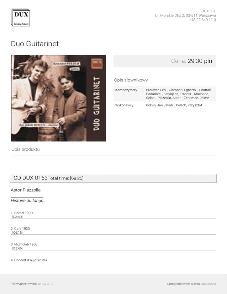 DUX S.J. Ul. Morskie Oko 2, 02-511 Warszawa +48 22 849 11 3 Duo Guitarinet Cena: 29,30 pln Opis słownikowy Kompozytorzy Brouwer, Léo ∎, Gismonti, Egberto ∎, Gnattali, Radamés ∎, Kleynjans, Francis ∎, Machado, Celso ∎, Piazzolla, Astor ∎, Zenamon, Jaime ∎ Wykonawcy Bokun, Jan Jakub ∎, Pełech, Krzysztof ∎ Opis produktu CD DUX 0163Total time: [68:25] Astor Piazzolla Histoire du tango 1. Bordel 1900 [03:49] 2. Cafe 1930 [06:15] 3. Nightclub 1960 [05:46] 4. Concert d`aujourd`hui Plik wygenerowano: 04-03-2017 Oprogramowanie sklepu: AptusShop DUX S.J. Ul. Morskie Oko 2, 02-511 Warszawa +48 22 849 11 3 [03:13] Astor Piazzolla Concierto d’ajourd hui 5. Naquele tempo [03:32] Astor Piazzolla Tango nr 2 6. Tango 2 [04:21] Astor Piazzolla Libertango 7. Libertango [03:44] Astor Piazzolla Leogo 8. Leogo [03:44] Léo Brouwer Un dia de noviembre 9. Un dia de noviembre [03:01] Plik wygenerowano: 04-03-2017 Oprogramowanie sklepu: AptusShop DUX S.J. Ul. Morskie Oko 2, 02-511 Warszawa +48 22 849 11 3 Astor Piazzolla Two Tango-Etudes for solo clarinet 10. TWO TANGO-ETUDES na klarnet solo Anxieu et rubato [03:04] 11. TWO TANGO-ETUDES na klarnet solo Molto marcato e energico [03:21] Francis Kleynjans Aria op. 92B 12. Aria op. 92b [03:36] Radamés Gnattali Sonata 13. Allegro comodo [04:12] 14. coo [04:12] 15. Adagio [03:13] 16. Con spirito [03:32] Egberto Gismonti Áqua e Vinho 17. Aqua e vinho [03:55] Plik wygenerowano: 04-03-2017 Oprogramowanie sklepu: AptusShop DUX S.J. Ul. Morskie Oko 2, 02-511 Warszawa +48 22 849 11 3 Jaime Zenamon Tango 18. Tango [03:12] Celso Machado Musique Populaires Brésilliennes 19. Algodao doce [01:58] 20. Pe de moleque [02:27] 21. Sambossa [02:12] Wykonawcy: Jan Jakub Bokun /klarnet/ Krzysztof Pełech /gitara/ Plik wygenerowano: 04-03-2017 Powered by TCPDF (www.tcpdf.org) Oprogramowanie sklepu: AptusShop