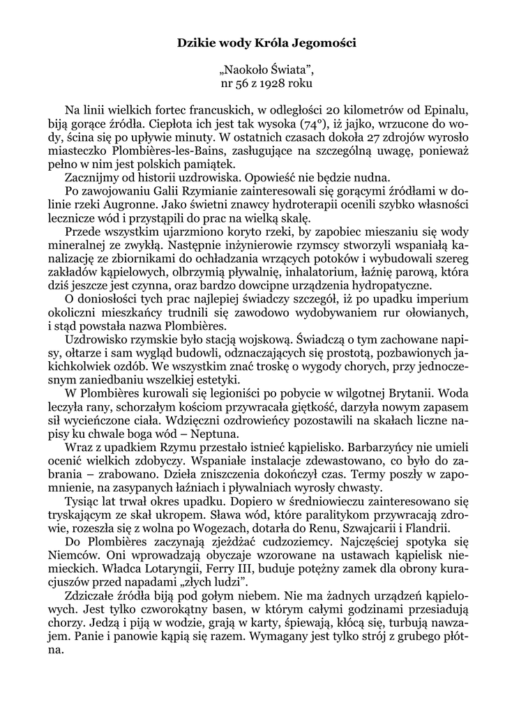 Dzikie wody Króla Jegomości „Naokoło Świata”, nr 56 z 1928 roku Na linii wielkich fortec francuskich, w odległości 20 kilometrów od Epinalu, biją gorące źródła. Ciepłota ich jest tak wysoka (74°), iż jajko, wrzucone do wody, ścina się po upływie minuty. W ostatnich czasach dokoła 27 zdrojów wyrosło miasteczko Plombières-les-Bains, zasługujące na szczególną uwagę, ponieważ pełno w nim jest polskich pamiątek. Zacznijmy od historii uzdrowiska. Opowieść nie będzie nudna. Po zawojowaniu Galii Rzymianie zainteresowali się gorącymi źródłami w dolinie rzeki Augronne. Jako świetni znawcy hydroterapii ocenili szybko własności lecznicze wód i przystąpili do prac na wielką skalę. Przede wszystkim ujarzmiono koryto rzeki, by zapobiec mieszaniu się wody mineralnej ze zwykłą. Następnie inżynierowie rzymscy stworzyli wspaniałą kanalizację ze zbiornikami do ochładzania wrzących potoków i wybudowali szereg zakładów kąpielowych, olbrzymią pływalnię, inhalatorium, łaźnię parową, która dziś jeszcze jest czynna, oraz bardzo dowcipne urządzenia hydropatyczne. O doniosłości tych prac najlepiej świadczy szczegół, iż po upadku imperium okoliczni mieszkańcy trudnili się zawodowo wydobywaniem rur ołowianych, i stąd powstała nazwa Plombières. Uzdrowisko rzymskie było stacją wojskową. Świadczą o tym zachowane napisy, ołtarze i sam wygląd budowli, odznaczających się prostotą, pozbawionych jakichkolwiek ozdób. We wszystkim znać troskę o wygody chorych, przy jednoczesnym zaniedbaniu wszelkiej estetyki. W Plombières kurowali się legioniści po pobycie w wilgotnej Brytanii. Woda leczyła rany, schorzałym kościom przywracała giętkość, darzyła nowym zapasem sił wycieńczone ciała. Wdzięczni ozdrowieńcy pozostawili na skałach liczne napisy ku chwale boga wód – Neptuna. Wraz z upadkiem Rzymu przestało istnieć kąpielisko. Barbarzyńcy nie umieli ocenić wielkich zdobyczy. Wspaniałe instalacje zdewastowano, co było do zabrania – zrabowano. Dzieła zniszczenia dokończył czas. Termy poszły w zapomnienie, na zasypanych łaźniach i pływalniach wyrosły chwasty. Tysiąc lat trwał okres upadku. Dopiero w średniowieczu zainteresowano się tryskającym ze skał ukropem. Sława wód, które paralitykom przywracają zdrowie, rozeszła się z wolna po Wogezach, dotarła do Renu, Szwajcarii i Flandrii. Do Plombières zaczynają zjeżdżać cudzoziemcy. Najczęściej spotyka się Niemców. Oni wprowadzają obyczaje wzorowane na ustawach kąpielisk niemieckich. Władca Lotaryngii, Ferry III, buduje potężny zamek dla obrony kuracjuszów przed napadami „złych ludzi”. Zdziczałe źródła biją pod gołym niebem. Nie ma żadnych urządzeń kąpielowych. Jest tylko czworokątny basen, w którym całymi godzinami przesiadują chorzy. Jedzą i piją w wodzie, grają w karty, śpiewają, kłócą się, turbują nawzajem. Panie i panowie kąpią się razem. Wymagany jest tylko strój z grubego płótna. Wody, ściekające z basenu, tworzą w odległości pięciuset kroków wstrętną sadzawkę. Wolno w niej kąpać się trędowatym oraz dziewczętom, które wskutek nieskromnych obyczajów doprowadziły siebie i innych do utraty zdrowia. Pomimo wybudowania zamku bezpieczeństwo publiczne w Plombières wiele pozostawia do życzenia. W okolicznych lasach grasują zbóje. Wpadają od czasu do czasu na rynek miasteczka i grabią bogatych gości. Zatrwożeni właściciele gospód i domów noclegowych postanawiają wprowadzić własną siłę zbrojną. Milicja jest zorganizowana na sposób niemiecki. Instruktorami są Niemcy, jak również niemieckie obowiązują prawa. Z lokalnych obyczajów przechowuje się kara „la Briche”, polegająca na chłoście w kąpieli. Surowe przepisy przewidywały zachowanie się wobec dam i wiele postępków, uchodzących w owe czasy za nieprzyzwoite. Stosowano karę chłosty bardzo często i, jak twierdzi jeden z naocznych świadków, było to widowisko tak zabawne, iż sam biskup z Colmaru nie mógł pohamować śmiechu. Zbiegała się wtedy cała ludność. Oprawców zachęcano krzykami, wręczano im też podarki za zręczne wywiązanie się z zadania. Za co groziła chłosta? Przede wszystkim za zanieczyszczenie wody, następnie za niebaczne słowa. Nie wolno było używać w kąpieli zwrotów, przypominających cierpienia ludzkie. Pacjent musiał nauczyć się zawczasu specjalnego słownika. Do basenu nie wchodził o kulach, lecz „wjeżdżał na koniu”. Nie pijał wody, lecz „nektar”. Zwracając się do oprawcy, przemawiał z szacunkiem: „Mistrzu...”. Poza tym karany był nadmiar kokieterii wobec kobiet. Kawaler, towarzyszący pannie z przyzwoitego domu, wdziewał futrzane rękawice, aby nie dotknąć dłonią jej ramion. Surowo też było wzbronione wyszydzać obcą mowę oraz drażnić sąsiadów w kąpieli, udając picie wina z pustego gąsiorka. Za wszystkie te przewinienia groziła „la Briche” z trzykrotnym pogrążeniem w wodzie. Co wieczór dokoła basenu odbywała się parada z trąbieniem i biciem w bębny. Brali w niej udział kuracjusze, notable miejscowi, a w uroczyste dni – i duchowieństwo. Kąpielisko zdobywa coraz większą sławę. Zaczynają zjeżdżać książęta, uczeni, magnaci. Powstają poematy ku chwale Plombières. Montaigne, wyleczony z uporczywej choroby, pisze wspomnienia, skarżąc się przy tym na drożyznę w gospodzie „Pod aniołem”. W początkach XVIII wieku zaczyna się rozkwit uzdrowiska. Nowy władca Lotaryngii, Stanisław Leszczyński, zwiedza Plombières i, zachwycony okolicą oraz skutecznością kuracji, obiera miasteczko na letnią rezydencję. W gorączkowym tempie pracują kielnie i kilofy. Wyrasta pałac królewski, dziś zwany domem „Pod arkadami”, następnie drugi pałacyk dla wnuczek, cór Ludwika XV, Adelajdy i Wiktorii (dziś Maison des Dames de France). Regulowane są ulice, trakty spacerowe, zakładane park