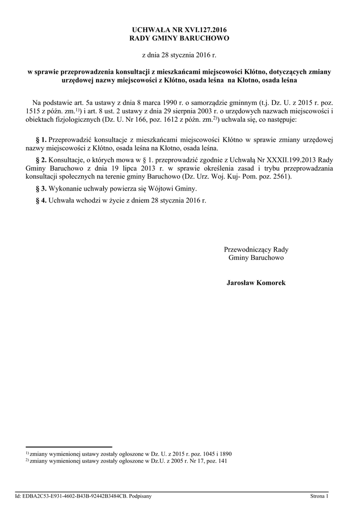 UCHWAŁA NR XVI.127.2016 RADY GMINY BARUCHOWO z dnia 28 stycznia 2016 r. w sprawie przeprowadzenia konsultacji z mieszkańcami miejscowości Kłótno, dotyczących zmiany urzędowej nazwy miejscowości z Kłótno, osada leśna na Kłotno, osada leśna Na podstawie art. 5a ustawy z dnia 8 marca 1990 r. o samorządzie gminnym (t.j. Dz. U. z 2015 r. poz. 1515 z późn. zm.1)) i art. 8 ust. 2 ustawy z dnia 29 sierpnia 2003 r. o urzędowych nazwach miejscowości i obiektach fizjologicznych (Dz. U. Nr 166, poz. 1612 z późn. zm.2)) uchwala się, co następuje: § 1. Przeprowadzić konsultacje z mieszkańcami miejscowości Kłótno w sprawie zmiany urzędowej nazwy miejscowości z Kłótno, osada leśna na Kłotno, osada leśna. § 2. Konsultacje, o których mowa w § 1. przeprowadzić zgodnie z Uchwałą Nr XXXII.199.2013 Rady Gminy Baruchowo z dnia 19 lipca 2013 r. w sprawie określenia zasad i trybu przeprowadzania konsultacji społecznych na terenie gminy Baruchowo (Dz. Urz. Woj. Kuj- Pom. poz. 2561). § 3. Wykonanie uchwały powierza się Wójtowi Gminy. § 4. Uchwała wchodzi w życie z dniem 28 stycznia 2016 r. Przewodniczący Rady Gminy Baruchowo Jarosław Komorek 1) zmiany 2) zmiany wymienionej ustawy zostały ogłoszone w Dz. U. z 2015 r. poz. 1045 i 1890 wymienionej ustawy zostały ogłoszone w Dz.U. z 2005 r. Nr 17, poz. 141 Id: EDBA2C53-E931-4602-B43B-92442B3484CB. Podpisany Strona 1 UZASADNIENIE Mieszkańcy wsi Kłótno w 2015 r. zwrócili się z wnioskiem do Wójta Gminy Baruchowo o dokonanie zmiany nazwy wsi z Kłótno na Kłotno. Wniosek z załączoną listą osób popierających złożył w imieniu mieszkańców Pan Włodzimierz Lenartowski. W uzasadnieniu wniosku wskazano, że nazwa Kłotno funkcjonowała od 1945 r. do końca 1972 r. w ówczesnej Gromadzie Kłotno, powiecie, jak i w województwie, zarówno w mowie potocznej, jak i w urzędach. Jedynie w Ministerstwie Administracji i Cyfryzacji nazwa Kłótno figuruje nieprzerwanie od 1928 r. Nazwy Kłotno używa też Kuria Rzymsko-Katolicka i parafia co najmniej od XIX w. Ponadto, nazwa Kłótno fonetycznie zbliżona jest do nazwy pobliskiego miasta Kutno, dlatego, aby uniknąć pomyłki musi być niejednokrotnie przeliterowana. Przychylając sie do wniosku mieszkańców została uruchomiona procedura zmierzająca do zmiany nazwy miejscowości i po przeprowadzeniu konsultacji, pismem z dnia 14 maja 2015 r. został złożony wniosek o przedmiotową zmianę do Ministra Administracji i Cyfryzacji. Komisja Nazw Miejscowości i Obiektów Fizjograficznych rozpatrzyła negatywnie wniosek. Przedmiotowa zmiana będzie mogła być wprowadzona w przypadku zmiany urzędowej nazwy miejscowości Kłótno, osada leśna na Kłotno, osada leśna. Dlatego, wypełniając wolę mieszkańców Kłótna zostaje uruchomiona procedura zmierzająca do zmiany urzędowej nazwy miejscowości Kłótno, osada leśna na Kłotno, osada leśna, a w konsekwencji do zmiany nazwy wsi z Kłótno na Kłotno. Przewodniczący Rady Gminy Baruchowo Jarosław Komorek Id: EDBA2C53-E931-4602-B43B-92442B3484CB. Podpisany Strona 1