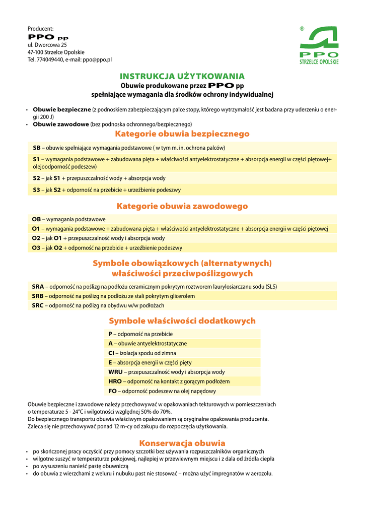 Producent: PPO pp ul. Dworcowa 25 47-100 Strzelce Opolskie Tel. 774049440, e-mail: [email protected] Instrukcja użytkowania Obuwie produkowane przez PPO pp spełniające wymagania dla środków ochrony indywidualnej • Obuwie bezpieczne (z podnoskiem zabezpieczającym palce stopy, którego wytrzymałość jest badana przy uderzeniu o energii 200 J) • Obuwie zawodowe (bez podnoska ochronnego/bezpiecznego) Kategorie obuwia bezpiecznego SB – obuwie spełniające wymagania podstawowe ( w tym m. in. ochrona palców) S1 – wymagania podstawowe + zabudowana pięta + właściwości antyelektrostatyczne + absorpcja energii w części piętowej+ olejoodporność podeszew) S2 – jak S1 + przepuszczalność wody + absorpcja wody S3 – jak S2 + odporność na przebicie + urzeźbienie podeszwy Kategorie obuwia zawodowego OB – wymagania podstawowe O1 – wymagania podstawowe + zabudowana pięta + właściwości antyelektrostatyczne + absorpcja energii w części piętowej O2 – jak O1 + przepuszczalność wody i absorpcja wody O3 – jak O2 + odporność na przebicie + urzeźbienie podeszwy Symbole obowiązkowych (alternatywnych) właściwości przeciwpoślizgowych SRA – odporność na poślizg na podłożu ceramicznym pokrytym roztworem laurylosiarczanu sodu (SLS) SRB – odporność na poślizg na podłożu ze stali pokrytym glicerolem SRC – odporność na poślizg na obydwu w/w podłożach Symbole właściwości dodatkowych P – odporność na przebicie A – obuwie antyelektrostatyczne CI – izolacja spodu od zimna E – absorpcja energii w części pięty WRU – przepuszczalność wody i absorpcja wody HRO – odporność na kontakt z gorącym podłożem FO – odporność podeszew na olej napędowy Obuwie bezpieczne i zawodowe należy przechowywać w opakowaniach tekturowych w pomieszczeniach o temperaturze 5 - 24°C i wilgotności względnej 50% do 70%. Do bezpiecznego transportu obuwia właściwym opakowaniem są oryginalne opakowania producenta. Zaleca się nie przechowywać ponad 12 m-cy od zakupu do rozpoczęcia użytkowania. • • • • Konserwacja obuwia po skończonej pracy oczyścić przy pomocy szczotki bez używania rozpuszczalników organicznych wilgotne suszyć w temperaturze pokojowej, najlepiej w przewiewnym miejscu i z dala od źródła ciepła po wysuszeniu nanieść pastę obuwniczą do obuwia z wierzchami z weluru i nubuku past nie stosować – można użyć impregnatów w aerozolu. Środki ochrony indywidualnej w tym obuwie bezpieczne i zawodowe podlegają procesowi starzenia. Najczęściej przyczyną utraty parametrów ochrony na skutek starzenia się obuwia są czynniki: mechaniczne, chemiczne oraz promieniowanie nadfioletowe (promieniowanie słoneczne). Objawami utraty właściwości użytkowych i ochronnych obuwia są w szczególności: oddzielenie się podeszwy od wierzchu lub warstwy bieżnika od zasadniczej części podeszwy, uszkodzenie połączeń szytych, uszkodzenie zapięć, przetarcie materiału wierzchowego, starcie występów urzeźbienia spodu, uszkodzenia mechaniczne części składowych. Obuwie antyelektrostatyczne Zaleca się, aby obuwie antyelektrostatyczne było stosowane wtedy, gdy zachodzi konieczność zmniejszenia możliwości naładowania elektrostatycznego, poprzez odprowadzenie ładunków elektrostatycznych tak, aby wykluczyć niebezpieczeństwo zapłonu od iskry, np. palnych substancji i par oraz gdy nie jest całkowicie wykluczone ryzyko porażenia elektrycznego spowodowanego przez urządzenia elektryczne lub elementy znajdujące się pod napięciem. Zaleca się jednak zwrócenie uwagi na to, że obuwie antyelektrostatyczne nie może zapewnić wystarczającej ochrony przed porażeniem elektrycznym, gdyż wprowadza jedynie pewną rezystancję elektryczną miedzy stopą a podłożem. Jeżeli niebezpieczeństwo porażenia elektrycznego nie zostało całkowicie wyeliminowane, niezbędne są dalsze środki w celu uniknięcia ryzyka. Zaleca się, aby takie środki oraz wymienione niżej badania były częścią programu zapobiegania wypadkom na stanowisku pracy. Zaleca się, aby zgodnie z doświadczeniami rezystancja elektryczna wyrobu zapewniająca pożądany efekt antyelektrostatyczny w okresie użytkowania była niższa niż 1 000 MΩ. Dla nowego wyrobu dolną granicę rezystancji elektrycznej określono na poziomie 100 kΩ, aby zapewnić ograniczoną ochronę przed niebezpiecznym porażeniem elektrycznym lub przed zapłonem w sytuacji uszkodzenia urządzenia elektrycznego pracującego przy napięciu do 250 V. Jednak użytkownicy powinni być świadomi tego, że w określonych warunkach obuwie może nie stanowić dostatecznej ochrony i dla ochrony użytkownika powinny być zawsze podjęte dodatkowe środki ostrożności. Rezystancja elektryczna tego typu obuwia może ulec znacznym zmianom w wyniku zginania, zanieczyszczenia lub pod wpływem wilgoci. Obuwie to nie będzie spełniało swojej założonej funkcji podczas użytkowania w warunkach mokrych. Jest więc niezbędne dążenie do tego, aby obuwie spełniało swoją założoną funkcję odprowadzania ładunków i zapewniało ochronę przez cały czas eksploatacji. Zaleca się użytkownikom ustalenie wewnątrzzakładowych badań rezystancji elektrycznej i prowadzenie ich w regularnych i częstych odstępach czasu. Obuwie klasyfikacji I może absorbować wilgoć, jeśli jest noszone przez długi czas, a w wilgotnych i mokrych warunkach może stać się obuwiem przewodzącym. Jeśli obuwie jest użytkowane w warunkach, w których materiał podeszwowy ulega zanieczyszczeniu, zaleca się, aby użytkownik zawsze sprawdzał właściwości elektryczne obuwia przed wejściem w obszar niebezpieczny. Zaleca się, aby w miejscach, gdzie używane jest obuwie antyelektrostatyczne, rezystancja podłoża nie była w stanie zniwelować ochrony zapewnianej przez obuwie. Zaleca się także, aby w czasie użytkowania obuwia żadne elementy izolujące, z wyjątkiem dziewiarskich wyrobów pońc