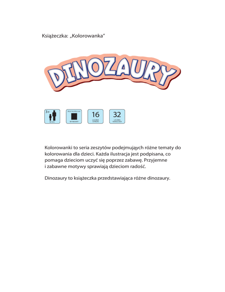 Książeczka: „Kolorowanka” 3+ WIEK 20,5/14,3/0,2 cm WYMIARY 16 LICZBA STRON 32 LICZBA NAKLEJEK Kolorowanki to seria zeszytów podejmująych różne tematy do kolorowania dla dzieci. Każda ilustracja jest podpisana, co pomaga dzieciom uczyć się poprzez zabawę. Przyjemne i zabawne motywy sprawiają dzieciom radość. Dinozaury to książeczka przedstawiająca różne dinozaury.