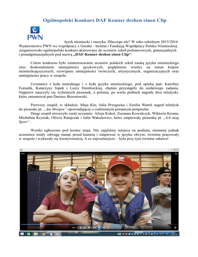 Ogólnopolski Konkurs DAF Kenner drehen einen Clip Język niemiecki i muzyka. Dlaczego nie? W roku szkolnym 2015/2016 Wydawnictwo PWN we współpracy z Goethe - Institut i Fundacją Współpracy Polsko-Niemieckiej zorganizowało ogólnopolski konkurs skierowany do uczniów szkół podstawowych, gimnazjalnych i ponadgimnazjalnych pod nazwą „DAF-Kenner drehen einen Clip“. Celem konkursu było zainteresowanie uczniów polskich szkół nauką języka niemieckiego oraz doskonaleniem umiejętności językowych, pogłębienie wiedzy na temat krajów niemieckojęzycznych, rozwijanie umiejętności twórczych, artystycznych, organizacyjnych oraz umiejętności pracy w zespole. Uczennice z koła teatralnego i z koła języka niemieckiego, pod opieką pań: Karoliny Fornalik, Katarzyny Jopek i Luizy Dembieckiej, chętnie przystąpiły do niełatwego zadania. Najpierw nauczyły się wybranych piosenek, a później, po wielu próbach nagrały dwa teledyski, które zmontował pan Dariusz Brzostowski. Pierwszy zespół, w składzie: Maja Kin, Julia Przygocka i Emilia Wartel nagrał teledysk do piosenki pt. „Am Morgen“ opowiadającej o codziennym porannym pośpiechu. Drugi zespół stworzyło sześć uczennic: Alicja Kokot, Zuzanna Kowalczyk, Wiktoria Kroma, Michalina Krysiak, Oliwia Ratajczak i Julia Wakulewicz, które zaśpiewały piosenkę pt. „Ich mag Sport“. Wyniki ogłoszono pod koniec maja. Nie zajęliśmy miejsca na podium, niemniej jednak uczennice miały odwagę stanąć przed kamerą i zaśpiewać w języku obcym, świetnie pracowały w zespole i wykazały się kreatywnością. A co najważniejsze – była przy tym świetna zabawa!