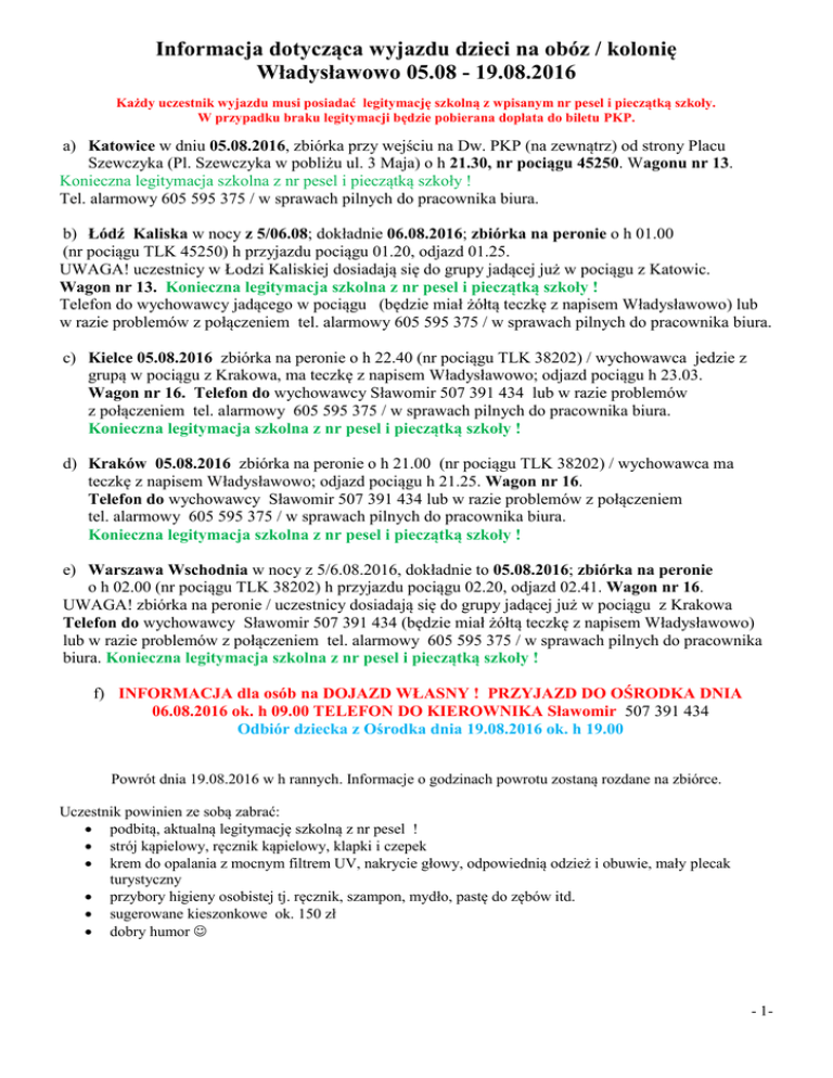 Informacja dotycząca wyjazdu dzieci na obóz / kolonię Władysławowo 05.08 - 19.08.2016 Każdy uczestnik wyjazdu musi posiadać legitymację szkolną z wpisanym nr pesel i pieczątką szkoły. W przypadku braku legitymacji będzie pobierana dopłata do biletu PKP. a) Katowice w dniu 05.08.2016, zbiórka przy wejściu na Dw. PKP (na zewnątrz) od strony Placu Szewczyka (Pl. Szewczyka w pobliżu ul. 3 Maja) o h 21.30, nr pociągu 45250. Wagonu nr 13. Konieczna legitymacja szkolna z nr pesel i pieczątką szkoły ! Tel. alarmowy 605 595 375 / w sprawach pilnych do pracownika biura. b) Łódź Kaliska w nocy z 5/06.08; dokładnie 06.08.2016; zbiórka na peronie o h 01.00 (nr pociągu TLK 45250) h przyjazdu pociągu 01.20, odjazd 01.25. UWAGA! uczestnicy w Łodzi Kaliskiej dosiadają się do grupy jadącej już w pociągu z Katowic. Wagon nr 13. Konieczna legitymacja szkolna z nr pesel i pieczątką szkoły ! Telefon do wychowawcy jadącego w pociągu (będzie miał żółtą teczkę z napisem Władysławowo) lub w razie problemów z połączeniem tel. alarmowy 605 595 375 / w sprawach pilnych do pracownika biura. c) Kielce 05.08.2016 zbiórka na peronie o h 22.40 (nr pociągu TLK 38202) / wychowawca jedzie z grupą w pociągu z Krakowa, ma teczkę z napisem Władysławowo; odjazd pociągu h 23.03. Wagon nr 16. Telefon do wychowawcy Sławomir 507 391 434 lub w razie problemów z połączeniem tel. alarmowy 605 595 375 / w sprawach pilnych do pracownika biura. Konieczna legitymacja szkolna z nr pesel i pieczątką szkoły ! d) Kraków 05.08.2016 zbiórka na peronie o h 21.00 (nr pociągu TLK 38202) / wychowawca ma teczkę z napisem Władysławowo; odjazd pociągu h 21.25. Wagon nr 16. Telefon do wychowawcy Sławomir 507 391 434 lub w razie problemów z połączeniem tel. alarmowy 605 595 375 / w sprawach pilnych do pracownika biura. Konieczna legitymacja szkolna z nr pesel i pieczątką szkoły ! e) Warszawa Wschodnia w nocy z 5/6.08.2016, dokładnie to 05.08.2016; zbiórka na peronie o h 02.00 (nr pociągu TLK 38202) h przyjazdu pociągu 02.20, odjazd 02.41. Wagon nr 16. UWAGA! zbiórka na peronie / uczestnicy dosiadają się do grupy jadącej już w pociągu z Krakowa Telefon do wychowawcy Sławomir 507 391 434 (będzie miał żółtą teczkę z napisem Władysławowo) lub w razie problemów z połączeniem tel. alarmowy 605 595 375 / w sprawach pilnych do pracownika biura. Konieczna legitymacja szkolna z nr pesel i pieczątką szkoły ! f) INFORMACJA dla osób na DOJAZD WŁASNY ! PRZYJAZD DO OŚRODKA DNIA 06.08.2016 ok. h 09.00 TELEFON DO KIEROWNIKA Sławomir 507 391 434 Odbiór dziecka z Ośrodka dnia 19.08.2016 ok. h 19.00 Powrót dnia 19.08.2016 w h rannych. Informacje o godzinach powrotu zostaną rozdane na zbiórce. Uczestnik powinien ze sobą zabrać: podbitą, aktualną legitymację szkolną z nr pesel ! strój kąpielowy, ręcznik kąpielowy, klapki i czepek krem do opalania z mocnym filtrem UV, nakrycie głowy, odpowiednią odzież i obuwie, mały plecak turystyczny przybory higieny osobistej tj. ręcznik, szampon, mydło, pastę do zębów itd. sugerowane kieszonkowe ok. 150 zł dobry humor - 1- Prosimy rodziców o zabezpieczenie dzieci źle znoszących podróż w odpowiednie środki oraz leki, które zażywają na stałe, a także w środki na poparzenia słoneczne. Podział na grupy nastąpi po przyjeździe do ośrodka. Uwaga: Jeżeli mają Państwo jakieś uwagi odnośnie dziecka (stanu zdrowia, zachowania itp.), które mogłyby być istotne dla wychowawców, a nie zostały zapisane w karcie kolonijnej prosimy o spisanie wszelkich niezbędnych informacji oraz przekazanie ich na zbiórce wychowawcy. Adres Ośrodka: Pensjonat JUNIOR Bohaterów Kaszubskich 4a, 84-120 Władysławowo 0512 459 804, (58) 674 19 54 ŻYCZYMY UDANEGO POBYTU ! - 2-