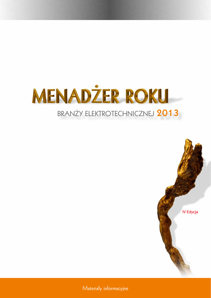 BRANŻY ELEKTROTECHNICZNEJ 2013 IV Edycja Materiały informacyjne Laureaci Konkursu Menadżer Roku Branży Elektrotechnicznej Klub Menadżera III Edycja 2012 Kategoria Hurtownia Paweł Jarmużek – prezes P.H. A-T S.A.Pomysłem na rozwój A-T jest zbudowanie własnej sieci punktów sprzedaży detalicznej oraz duża dywersyfikacja. Firma ma ogromnie rozdrobnione portfolio klientów oraz potężny asortyment produktów. Celem strategicznym spółki jest otwarcie 250 sklepów pod logo A-T na terenie całego kraju. Głównym obszarem zainteresowania są miasta powiatowe o liczbie mieszkańców pow. 20 tys. Firma chce stworzyć największą w kraju sieć detaliczną branży elektrotechnicznej. W ocenie partnerów biznesowych prezes aktywnie uczestniczy w rozwoju firmy, tworzy strategię i pilnuje jej realizacji. Reprezentuje rzadkie połączenie konsekwencji w działaniu i otwartości. Kategoria Producent Krzysztof Wieczorkowski – prezes Zarządu SONEL SA. Wizja i cele Krzysztofa Wieczorkowskiego sprawiły, że Sonel jest obecnie największym producentem przyrządów pomiarowych w Europie Środkowo-Wschodniej. Wyniki finansowe z ostatnich lat świadczą o stabilnym wzroście w dłuższym okresie. W zakresie sprzedaży 2012 rok należał do najlepszych w historii spółki. Spółka realizuje program działań strategicznych opracowanych na lata 2012-2015 pod hasłem „Wszyscy wpływamy na sukces”. Ma ono uświadomić pracownikom, że na każdym etapie realizacji zadań cząstkowych, lepszą i efektywniejszą pracą można zbliżyć się do poprawy wyników finansowych. II Edycja 2011 Kategoria Hurtownia Wiesław Romańczuk – prezes Zarządu Alfa Elektro Sp.z o.o. W momencie objęcia stanowiska w 2007 r. podjął konkretne działania oszczędnościowe oraz zwiększające sprzedaż i marżę. Przygotowane koncepcje rozwoju pozwoliły na zajęcie przez firmę pozycji lidera hurtu elektrycznego. W rankingach za 2009 r. była na drugim miejscu, a od 2010 r. zajmuje 1 miejsce w branży, dystansując konkurencję. Dostawcy chwalą powstałą strukturę handlową, dzięki której procesy decyzyjne przebiegają sprawniej niż w innych hurtowniach. Pracownicy cenią politykę personalną prezesa: tworzenie otwartego i przyjaznego środowiska pracy. Kategoria Producent Janusz Niedźwiecki – prezes Zarządu Apator SA. Cieszy się dużym uznaniem wśród pracowników, klientów, dostawców, inwestorów, analityków oraz lokalnej społeczności. Obejmując stanowisko prezesa w 2000 roku, posiadał jasną wizję rozwoju spółki. Sukcesem zakończyły się akwizycje, które wzmocniły Grupę Apator. W 2010 roku rozpoczęła się budowa nowoczesnego Zakładu w Pomorskiej Specjalnej Strefie Ekonomicznej, gdzie spółka przeniosła swoją działalność. Polityka prezesa sprawiła, że Apator należy do najbardziej innowacyjnych przedsiębiorstw w Europie Centralnej i Wschodniej. I Edycja 2010 Kategoria Hurtownia Andrzej Jurczak – prezes hurtowni elektrotechnicznej Grodno SA. Absolwent Szkoły Głównej Handlowej w Warszawie. Uczestniczył od początku w tworzeniu i rozwoju firmy, czyli od 1990 roku. „Mam wizje, określone cele, często idę pod prąd, nigdy się nie poddaję” – to jego własna zasada działania. Grodno SA z hurtowni lokalnej stała się w krótkim czasie znaczącą ogólnopolską siecią sprzedaży artykułów elektrotechnicznych. Na początku maja 2011 r. firma zadebiutowała na NewConnect, a w październiku uruchomiła magazyn centralny w Radzyminie pod Warszawą. Liczy 30 punktów handlowych. Zatrudnia 270 pracowników. Kategoria Producent Damian Wojnarowski – prezes Zarządu Wojnarowscy Sp. z o.o. Angażuje się w budowanie firmy od rozpoczęcia jej działalności w 1990 roku. Jego strategia oparta jest na założeniu: „Chodzi o to, aby tworzyć, nie naśladować”. Jest prekursorem nowoczesnych trendów w oświetleniu. Firma Wojnarowscy oferuje największy wybór źródeł światła, w tym własnej marki Spectrum. W 2011 roku stała się dystrybutorem renomowanego producenta Toshiba. Dysponuje własną siedzibą wraz z magazynem i laboratorium badawczym. Zatrudnia 70 osób. Powszechnie mówi się, że „jeśli nie możesz kupić jakieś żarówki, to na pewno kupisz ją u Wojnarowskich”. Finał 3. edycji Konkursu Menadżer Roku Branży Elektrotechnicznej Osoby nominowane w 3. Edycji Konkursu Menadżer Roku Branży Elektrotechnicznej (od lewej): Bostjan Leban – prezes zarządu Eti Polam, Janusz Nowak – wiceprezes zarządu Manex, Marek Huzarewicz – prezes zarządu Philips Lighting Poland, Sławomir Dębowski – prezes zarządu ElektroUnion, Roman Ostrowski – prezes zarządu Ostrowski-biz, Paweł Jarmużek – prezes zarządu AT, Michał Twerd – właściciel Twerd, Krzysztof Wieczorkowski – prezes zarządu Sonel Nagroda Główna Nagroda Specjalna Kategoria Producent KRZYSZTOF WIECZORKOWSKI prezes zarządu Sonel SA MICHAŁ TWERD właściciel firmy Twerd Wyróżnienie Kategoria Hurtownia PAWEŁ JARMUŻEK prezes zarządu A-T SA Kategoria Hurtownia ROMAN OSTROWSKI prezes zarządu Ostrowski-biz.pl Sp. z o.o. Kategoria Usługi SŁAWOMIR DĘBOWSKI prezes zarządu Elektro-Union Sp. z o.o. Menadżer Roku Branży Elektrotechnicznej 2013 IV Edycja Konkursu Regulamin Konkursu 1. Kandydatem do Konkursu Menadżer Roku Branży Elektrotechnicznej może być każda osoba, która aktywnie uczestniczy od co najmniej pięciu lat w zarządzaniu przedsiębiorstwem branży elektrotechnicznej na polskim rynku. 2. Zgłoszenia do Konkursu przyjmowane są w następujących kategoriach: –PRODUCENT, –HURTOWNIA, –USŁUGI. „Producent” oznacza podmiot zajmujący się produkcją wyrobów elektrotechnicznych lub ich dystrybucją jako przedstawicielstwo handlowe producenta zagranicznego. „Hurtownia” oznacza podmiot zajmujący się handlem wyrobami elektrotechnicznymi dysponujący siecią sprzedaży. „Usługi” oznacza wykonywanie lub projektowanie instalacji energoelektr