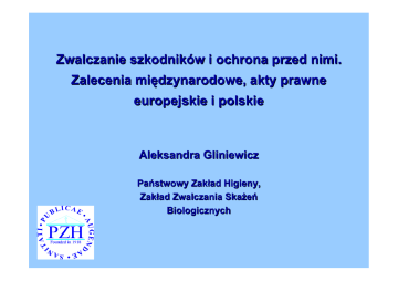 Zwalczanie szkodników i ochrona przed nimi. Zalecenia międzynarodowe, akty prawne europejskie i polskie Aleksandra Gliniewicz Państwowy Zakład Higieny, Zakład Zwalczania Skażeń Biologicznych Zwalczanie szkodników i ochrona przed nimi..... • Bezpieczeństwo i jakość zdrowotna żywności • Miejsce ochrony przed szkodnikami w systemach jakości • Zalecenia FAO/WHO • Organizacja kontroli żywności w Polsce • Akty prawne europejskie, w których poruszane są zagadnienia ochrony przed szkodnikami • Podstawy prawne kontroli sprawowanej przez Państwową Inspekcję Sanitarną • Podstawy prawne kontroli sprawowanej przez Inspekcję Weterynaryjną • Zwalczanie szkodników w obiektach niezwiązanych z produkcją żywności Bezpieczeństwo żywności Zespół warunków, które muszą być spełnione na wszystkich etapach produkcji i transportu tak, aby nie spowodować zagrożenia dla życia i zdrowia konsumenta. Bezpieczeństwo żywności • Zatrucia i zakażenia pokarmowe - ok.. 10% populacji krajów uprzemysłowionych rocznie • 400 mln przypadków chorób spowodowanych zatruciami pokarmowymi w ciągu roku • Dalles (Oregon, USA), 1984: 751 osób zachorowało po konsumpcji sałatki skażonej Salmonella typhimurium - przypadek uważany za atak bioterrorystyczny (wspólnota Rajneesha) Bezpieczeństwo żywności - Polska • Bakteryjne zatrucia pokarmowe w roku 2003: 16496 • Wirusowe i inne zakażenia jelitowe w roku 2003: 8049 • 15% zatruć, których przyczyną są pałeczki Salmonella jest powodowanych przez wyroby z ciastkarni Aktualne problemy związane ze spełnieniem w europejskich norm Polsce bezpieczeństwa żywności (kwiecień 2004) 1006 placówek w 10 nowych państwach członkowskich, z tego 721 w Polsce (dotyczy zakładów produkujących żywność pochodzenia zwierzęcego) dostało dodatkowo 1 rok na dostosowanie; z z Ale: 1000 polskich zakładów będzie mogło produkować na unijny rynek (pieczęć owalna - produkt europejski); z Produkty z zakładów, które uzyskały okresy przejściowe – oznaczone pieczęcią kwadratową (produkt krajowy); Sposób zapewnienia dobrej jakości produktu* * J. Kośka „Problemy kontroli jakości produkowanej żywności”, Przegl. Piek. Cuk., 10, 2001, Systemy zapewnienia jakości W USA i krajach europejskich wysoką jakość produktu osiąga się poprzez stosowanie w przemyśle odpowiednich systemów, technik, metod i procedur w procesach produkcyjnych, zapewniających bezpieczeństwa odpowiedni produkowanej systemy zapewnienia jakości stopień żywności = Systemy zapewnienia jakości • GMP - Dobra Praktyka Produkcyjna; • GHP – Dobra Praktyka Higieniczna; • HACCP – System Analizy Zagrożeń i Krytycznych Punktów Kontroli; • Normy z serii ISO 9000 •TQM Jakością – Kompleksowe Zarządzanie Systemy zapewnienia jakości • Systemy zapewnienia jakości odnoszą się do mikrobiologicznych, chemicznych, fizycznych zagrożeń dla zdrowia, które potencjalnie mogą występować w żywności. • Systemy te uzupełniają się, niekiedy nakładają, obejmują większy lub mniejszy zakres działań. Systemy zapewnienia jakości: GMP – Dobra Praktyka Produkcyjna GMP odnosi się do: • otoczenia zakładu; • obszaru produkcji; • obszaru pomocniczego przy produkcji Systemy zapewnienia jakości: GMP – Dobra Praktyka Produkcyjna Powinny być opracowane pisemne procedury i instrukcje dotyczące całego procesu produkcji oraz spełnione wymagania dotyczące: • Zapewnienia bezpieczeństwa i jakości stosowanych w produkcji surowców; • Założeń konstrukcyjnych i budowlanych; • Doboru odpowiedniego wyposażenia technicznego i technologicznego; • Procesów mycia, dezynfekcji i konserwacji maszyn, urządzeń, aparatury; • Stosowania odpowiednich z higienicznego punktu widzenia procesów i operacji technologicznych; • Przechowywania i obrotu surowcami i gotowymi produktami; • Szkoleń i higieny osobistej personelu; Systemy zapewnienia jakości: GMP, GHP Higieniczne aspekty GMP GHP. Dobra Praktyka Higieniczna jest pojęciem węższym niż Dobra Praktyka Produkcyjna. Systemy zapewnienia jakości: HACCP • System HACCP jest specyficznie i bezpośrednio ukierunkowany na bezpieczeństwo żywności. • HACCP – przenosi ogólne wymagania higieniczne przedstawiane w dokumentach GMP na szczegółowe, dające się kontrolować lub monitorować punkty lub etapy procesu technologicznego, dotyczące bezpieczeństwa produkcji żywności. • HACCP – charakteryzuje się wysoką specyficznością; nie można go bez dokładnej analizy przenosić do różnych zakładów produkcyjnych, nawet tej samej branży. Systemy zapewnienia jakości: HACCP • Identyfikacja zagrożeń jakości zdrowotnej, ocena wagi tych zagrożeń, ryzyka ich wystąpienia; ustalenie środków kontroli tych zagrożeń; • Określenie krytycznych punktów kontroli (CCP) w celu wyeliminowania lub zminimalizowania zagrożeń; • Ustalenie dla każdego CCP wartości krytycznych; • Wprowadzenie systemu monitorowania wartości krytycznych w CCP; • Ustalenie działań korygujących w CCP; • Ustalenie procedur weryfikacji systemu; • Opracowanie dokumentacji systemowej i operacyjnej dla HACCP w zakładzie. A gdzie jest miejsce ochrony przed szkodnikami? Dokumenty międzynarodowe FAO/WHO Codex Alimentarius - Recommended International Code of Practice General Principles of Food Hygiene, CAC/RCP 11969, Rev. 2 (1985) (Międzynarodowy Kodeks Praktyki Generalnych Zasad Higieny Żywności Kodeksu Żywnościowego): z - Podaje definicję szkodnika: każde zwierzę mogące w sposób bezpośredni lub pośredni zanieczyścić żywność; - Postuluje konieczność prowadzenia w Zakładach produkujących żywność skutecznego, ciągłego systemu rejestracji występowania i zwalczania szkodników. Dokumenty międzynarodowe FAO/WHO z Codex Alimentarius - Alinorm 97/13 (1): celem dobrej praktyki higienicznej przy produkcji żywności jest stworzenie 