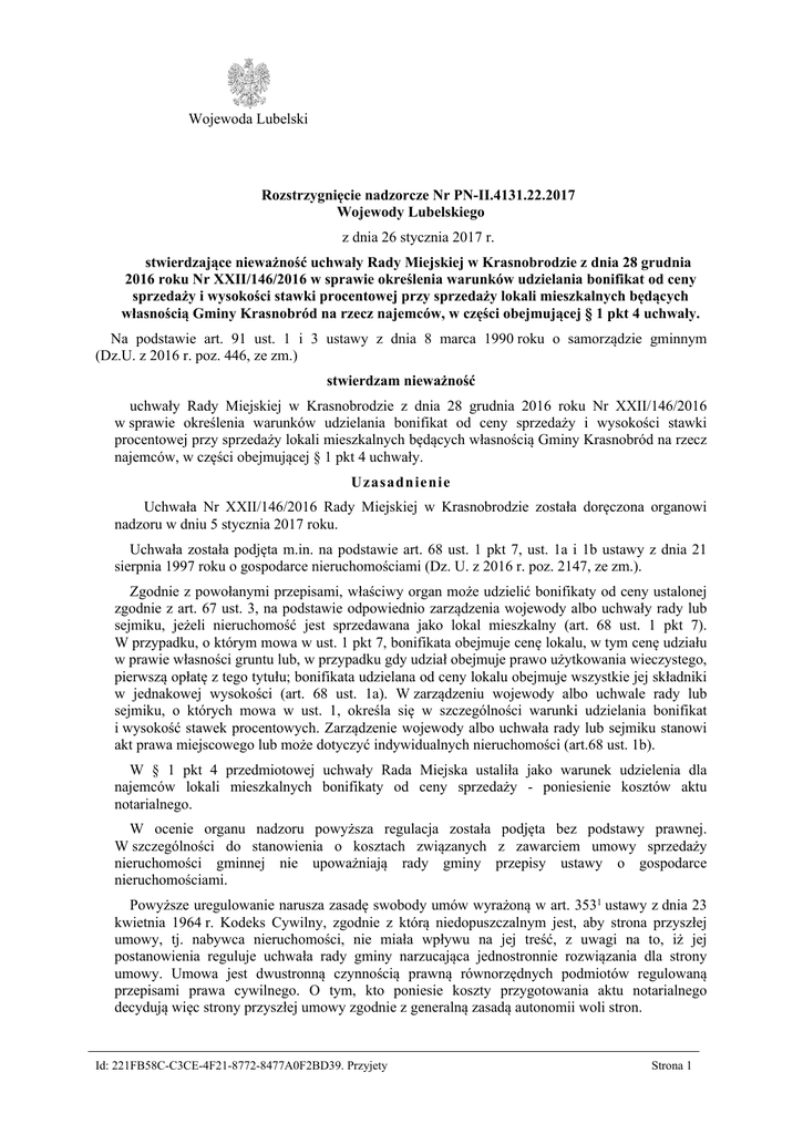 Wojewoda Lubelski Rozstrzygnięcie nadzorcze Nr PN-II.4131.22.2017 Wojewody Lubelskiego z dnia 26 stycznia 2017 r. stwierdzające nieważność uchwały Rady Miejskiej w Krasnobrodzie z dnia 28 grudnia 2016 roku Nr XXII/146/2016 w sprawie określenia warunków udzielania bonifikat od ceny sprzedaży i wysokości stawki procentowej przy sprzedaży lokali mieszkalnych będących własnością Gminy Krasnobród na rzecz najemców, w części obejmującej § 1 pkt 4 uchwały. Na podstawie art. 91 ust. 1 i 3 ustawy z dnia 8 marca 1990 roku o samorządzie gminnym (Dz.U. z 2016 r. poz. 446, ze zm.) stwierdzam nieważność uchwały Rady Miejskiej w Krasnobrodzie z dnia 28 grudnia 2016 roku Nr XXII/146/2016 w sprawie określenia warunków udzielania bonifikat od ceny sprzedaży i wysokości stawki procentowej przy sprzedaży lokali mieszkalnych będących własnością Gminy Krasnobród na rzecz najemców, w części obejmującej § 1 pkt 4 uchwały. Uzasadnienie Uchwała Nr XXII/146/2016 Rady Miejskiej w Krasnobrodzie została doręczona organowi nadzoru w dniu 5 stycznia 2017 roku. Uchwała została podjęta m.in. na podstawie art. 68 ust. 1 pkt 7, ust. 1a i 1b ustawy z dnia 21 sierpnia 1997 roku o gospodarce nieruchomościami (Dz. U. z 2016 r. poz. 2147, ze zm.). Zgodnie z powołanymi przepisami, właściwy organ może udzielić bonifikaty od ceny ustalonej zgodnie z art. 67 ust. 3, na podstawie odpowiednio zarządzenia wojewody albo uchwały rady lub sejmiku, jeżeli nieruchomość jest sprzedawana jako lokal mieszkalny (art. 68 ust. 1 pkt 7). W przypadku, o którym mowa w ust. 1 pkt 7, bonifikata obejmuje cenę lokalu, w tym cenę udziału w prawie własności gruntu lub, w przypadku gdy udział obejmuje prawo użytkowania wieczystego, pierwszą opłatę z tego tytułu; bonifikata udzielana od ceny lokalu obejmuje wszystkie jej składniki w jednakowej wysokości (art. 68 ust. 1a). W zarządzeniu wojewody albo uchwale rady lub sejmiku, o których mowa w ust. 1, określa się w szczególności warunki udzielania bonifikat i wysokość stawek procentowych. Zarządzenie wojewody albo uchwała rady lub sejmiku stanowi akt prawa miejscowego lub może dotyczyć indywidualnych nieruchomości (art.68 ust. 1b). W § 1 pkt 4 przedmiotowej uchwały Rada Miejska ustaliła jako warunek udzielenia dla najemców lokali mieszkalnych bonifikaty od ceny sprzedaży - poniesienie kosztów aktu notarialnego. W ocenie organu nadzoru powyższa regulacja została podjęta bez podstawy prawnej. W szczególności do stanowienia o kosztach związanych z zawarciem umowy sprzedaży nieruchomości gminnej nie upoważniają rady gminy przepisy ustawy o gospodarce nieruchomościami. Powyższe uregulowanie narusza zasadę swobody umów wyrażoną w art. 3531 ustawy z dnia 23 kwietnia 1964 r. Kodeks Cywilny, zgodnie z którą niedopuszczalnym jest, aby strona przyszłej umowy, tj. nabywca nieruchomości, nie miała wpływu na jej treść, z uwagi na to, iż jej postanowienia reguluje uchwała rady gminy narzucająca jednostronnie rozwiązania dla strony umowy. Umowa jest dwustronną czynnością prawną równorzędnych podmiotów regulowaną przepisami prawa cywilnego. O tym, kto poniesie koszty przygotowania aktu notarialnego decydują więc strony przyszłej umowy zgodnie z generalną zasadą autonomii woli stron. Id: 221FB58C-C3CE-4F21-8772-8477A0F2BD39. Przyjety Strona 1 Zawarcie umowy sprzedaży nieruchomości należy do organu wykonawczego gminy, czyli do wójta (burmistrza, prezydenta miasta) i jest czynnością mieszczącą się w pojęciu "gospodarowania mieniem gminy", która to materia z mocy prawa stanowi samodzielne kompetencje organu wykonawczego gminy. Zgodnie bowiem z art. 30 ust. 2 pkt 3 ustawy o samorządzie gminnym do zadań organu wykonawczego gminy należy gospodarowanie mieniem komunalnym. Analogiczne rozwiązanie zawiera również ustawa o gospodarce nieruchomościami, która w art. 25 ust. 1 stwierdza, że gminnym zasobem nieruchomości gospodaruje wójt. Organ stanowiący gminy nie jest więc uprawniony do jednostronnego kształtowania treści umowy w zakresie obowiązku poniesienia kosztów związanych z zawarciem aktu notarialnego lub uzależniania możliwości udzielenia bonifikaty od nałożenia obowiązku w tym zakresie na nabywcę. Kształtowanie postanowień umowy powinno bowiem mieć miejsce przy jej zawieraniu, a nie w uchwale określającej w sposób generalny warunki udzielania bonifikaty od ceny sprzedaży. Powyższe stanowisko organu nadzoru potwierdza orzecznictwo sądowe, m.in. wyrok WSA we Wrocławiu z dnia 21 maja 2008 r. sygn. akt II SA/Wr 139/08 (baza orzeczeń LEX nr 519139), w którym Sąd wywiódł, że: „Zapisy dotyczące obciążenia nabywcy nieruchomości kosztami przygotowania tej nieruchomości do sprzedaży (opłaty notarialne, sądowe, skarbowe, założenia księgi wieczystej, wycena nieruchomości, podział i inne), określające obowiązek nabywcy nieruchomości utrzymania obiektu w należytym stanie oraz obowiązek wpłacenia zaliczki przed nabyciem nieruchomości, również należą do postanowień (i to postanowień przedmiotowo nieistotnych), które powinny być konkretyzowane w umowie sprzedaży nieruchomości. Nie można zaś ich kwalifikować jako podstawowych reguł postępowania w zakresie gospodarowania nieruchomościami.". Biorąc pod uwagę powyższe, stwierdzenie nieważności uchwały Nr XXII/146/2016 we wskazanym zakresie jest uzasadnione. Na niniejsze rozstrzygnięcie nadzorcze przysługuje skarga do Wojewódzkiego Sądu Administracyjnego w Lublinie, złożona za moim pośrednictwem w terminie 30 dni od dnia doręczenia rozstrzygnięcia nadzorczego. w/z WOJEWODY LUBELSKIEGO Robert Gmitruczuk WICEWOJEWODA Otrzymują: 1) Przewodniczący Rady Miejskiej w Krasnobrodzie 2) Burmistrz Krasnobrodu Id: 221FB58C-C3CE-4F21-8772-8477A0F2BD39. Przyjety Strona 2 Potwierdzam zgodność kopii wydruku z dokumentem elektronicznym: Identyfikator dokumentu 1312098.2644408