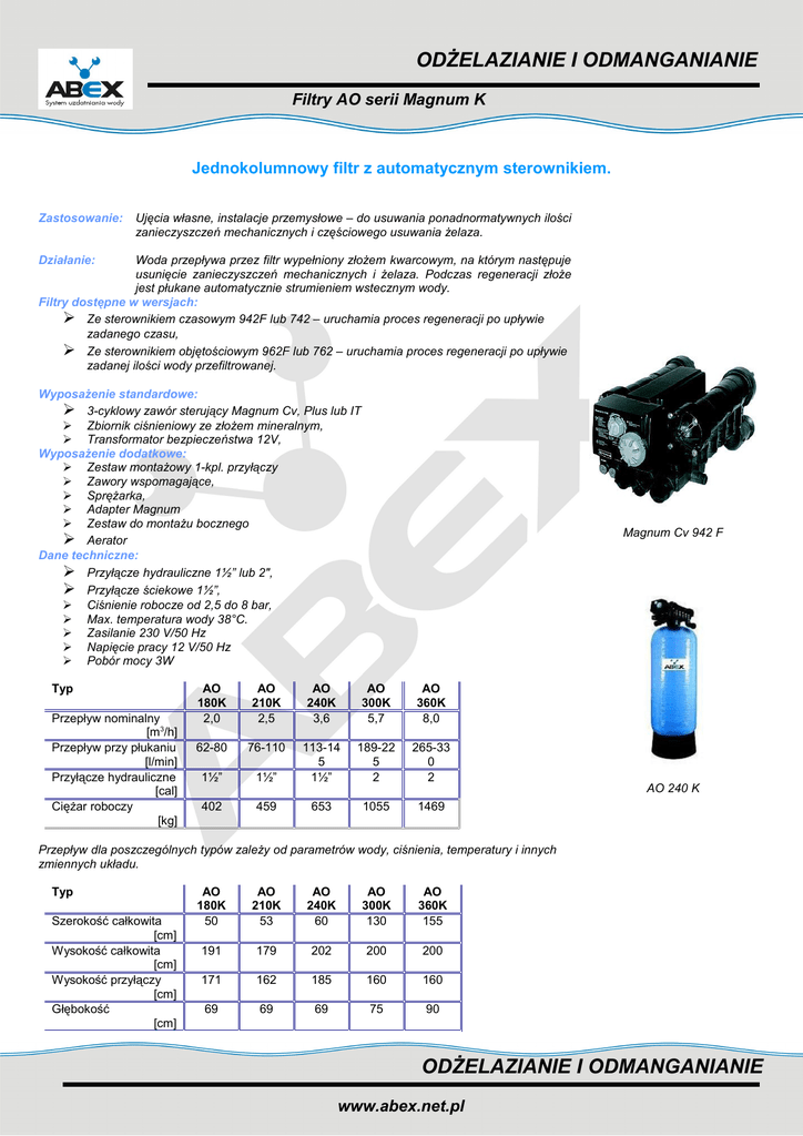 ODŻELAZIANIE I ODMANGANIANIE Filtry AO serii Magnum K Jednokolumnowy filtr z automatycznym sterownikiem. Zastosowanie: Ujęcia własne, instalacje przemysłowe – do usuwania ponadnormatywnych ilości zanieczyszczeń mechanicznych i częściowego usuwania żelaza. Działanie: Woda przepływa przez filtr wypełniony złożem kwarcowym, na którym następuje usunięcie zanieczyszczeń mechanicznych i żelaza. Podczas regeneracji złoże jest płukane automatycznie strumieniem wstecznym wody. Filtry dostępne w wersjach: Ze sterownikiem czasowym 942F lub 742 – uruchamia proces regeneracji po upływie zadanego czasu, Ze sterownikiem objętościowym 962F lub 762 – uruchamia proces regeneracji po upływie zadanej ilości wody przefiltrowanej. Wyposażenie standardowe: 3-cyklowy zawór sterujący Magnum Cv, Plus lub IT Zbiornik ciśnieniowy ze złożem mineralnym, Transformator bezpieczeństwa 12V, Wyposażenie dodatkowe: Zestaw montażowy 1-kpl. przyłączy Zawory wspomagające, Sprężarka, Adapter Magnum Zestaw do montażu bocznego Aerator Dane techniczne: Przyłącze hydrauliczne 1½” lub 2", Przyłącze ściekowe 1½”, Ciśnienie robocze od 2,5 do 8 bar, Max. temperatura wody 38°C. Zasilanie 230 V/50 Hz Napięcie pracy 12 V/50 Hz Pobór mocy 3W Typ Przepływ nominalny [m3/h] Przepływ przy płukaniu [l/min] Przyłącze hydrauliczne [cal] Ciężar roboczy [kg] Magnum Cv 942 F AO 180K 2,0 AO 210K 2,5 AO 240K 3,6 AO 300K 5,7 AO 360K 8,0 62-80 76-110 1½” 1½” 113-14 5 1½” 189-22 5 2 265-33 0 2 402 459 653 1055 1469 AO 240 K Przepływ dla poszczególnych typów zależy od parametrów wody, ciśnienia, temperatury i innych zmiennych układu. Typ Szerokość całkowita [cm] Wysokość całkowita [cm] Wysokość przyłączy [cm] Głębokość [cm] AO 180K 50 AO 210K 53 AO 240K 60 AO 300K 130 AO 360K 155 191 179 202 200 200 171 162 185 160 160 69 69 69 75 90 ODŻELAZIANIE I ODMANGANIANIE www.abex.net.pl