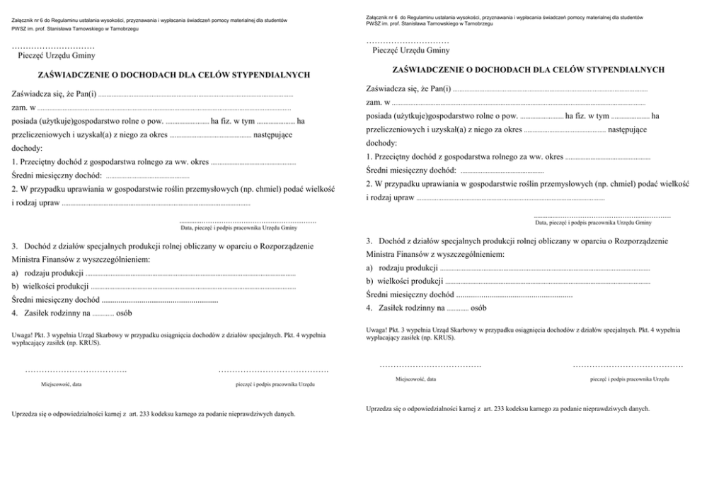 Załącznik nr 6 do Regulaminu ustalania wysokości, przyznawania i wypłacania świadczeń pomocy materialnej dla studentów Załącznik nr 6 do Regulaminu ustalania wysokości, przyznawania i wypłacania świadczeń pomocy materialnej dla studentów PWSZ im. prof. Stanisława Tarnowskiego w Tarnobrzegu PWSZ im. prof. Stanisława Tarnowskiego w Tarnobrzegu ………………………… Pieczęć Urzędu Gminy ………………………… Pieczęć Urzędu Gminy ZAŚWIADCZENIE O DOCHODACH DLA CELÓW STYPENDIALNYCH Zaświadcza się, że Pan(i) ..................................................................................................................... zam. w ........................................................................................................................................................ posiada (użytkuje)gospodarstwo rolne o pow. .......................... ha fiz. w tym ....................... ha przeliczeniowych i uzyskał(a) z niego za okres ................................................. następujące ZAŚWIADCZENIE O DOCHODACH DLA CELÓW STYPENDIALNYCH Zaświadcza się, że Pan(i) ..................................................................................................................... zam. w ........................................................................................................................................................ posiada (użytkuje)gospodarstwo rolne o pow. .......................... ha fiz. w tym ....................... ha przeliczeniowych i uzyskał(a) z niego za okres ................................................. następujące dochody: dochody: 1. Przeciętny dochód z gospodarstwa rolnego za ww. okres ................................................... 1. Przeciętny dochód z gospodarstwa rolnego za ww. okres ................................................... Średni miesięczny dochód: .................................................. Średni miesięczny dochód: .................................................. 2. W przypadku uprawiania w gospodarstwie roślin przemysłowych (np. chmiel) podać wielkość i rodzaj upraw ................................................................................................................. 2. W przypadku uprawiania w gospodarstwie roślin przemysłowych (np. chmiel) podać wielkość i rodzaj upraw ................................................................................................................. .............……………………………………………. .............……………………………………………. Data, pieczęć i podpis pracownika Urzędu Gminy Data, pieczęć i podpis pracownika Urzędu Gminy 3. Dochód z działów specjalnych produkcji rolnej obliczany w oparciu o Rozporządzenie Ministra Finansów z wyszczególnieniem: Ministra Finansów z wyszczególnieniem: a) rodzaju produkcji .............................................................................................................................. b) wielkości produkcji ........................................................................................................................... a) rodzaju produkcji .............................................................................................................................. b) wielkości produkcji ........................................................................................................................... Średni miesięczny dochód ........................................................ Średni miesięczny dochód ........................................................ 4. Zasiłek rodzinny na ............. osób 4. Zasiłek rodzinny na ............. osób Uwaga! Pkt. 3 wypełnia Urząd Skarbowy w przypadku osiągnięcia dochodów z działów specjalnych. Pkt. 4 wypełnia wypłacający zasiłek (np. KRUS). ………………………………. 3. Dochód z działów specjalnych produkcji rolnej obliczany w oparciu o Rozporządzenie …………………………………. Uwaga! Pkt. 3 wypełnia Urząd Skarbowy w przypadku osiągnięcia dochodów z działów specjalnych. Pkt. 4 wypełnia wypłacający zasiłek (np. KRUS). ………………………………. Miejscowość, data Miejscowość, data …………………………………. pieczęć i podpis pracownika Urzędu pieczęć i podpis pracownika Urzędu Uprzedza się o odpowiedzialności karnej z art. 233 kodeksu karnego za podanie nieprawdziwych danych. Uprzedza się o odpowiedzialności karnej z art. 233 kodeksu karnego za podanie nieprawdziwych danych.
