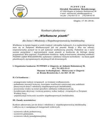 PCPPP i DN Ośrodek Doradztwa Metodycznego 67-200 Głogów ul. Jedności Robotniczej 38 e-mail: [email protected] tel./fax (76) 833 32 11 (76) 838 42 93 Głogów, 17. 03. 2014r. Konkurs plastyczny „Wielkanocne pisanki” dla Dzieci i Młodzieży z Niepełnosprawnością Intelektualną Wielkanoc to święta bogate w wiele tradycji i obrzędów ludowych. A co najbardziej kojarzy nam się ze Świętami Wielkanocnymi jak nie pisanki. Każdy z Was ma własny, niepowtarzalny pomysł na to jak wykonać wielkanocną pisankę. Podzielcie się z nami swoimi pomysłami i zaprezentujcie swoje pisanki w konkursie, do którego mamy przyjemność Was zaprosić. Przedmiotem konkursu będą przestrzenne, dowolnej wielkości PISANKI i JAJKA WIELKANOCNE, wykonane i zdobione różnymi technikami – na bazie jajek plastikowych, styropianowych, akrylowych lub drewnianych. I. Organizator konkursu: PCPPPiDN w Głogowie, ul. Jedności Robotniczej 38, tel. ( 76 ) 833-32-11 Muzeum Archeologiczno – Historyczne w Głogowie ul. Brama Brzostowska 1, tel. 843 -10 -81 II. Cel konkursu : - propagowanie tradycji związanych ze świętami wielkanocnymi, - pobudzenie inwencji twórczej, rozwijanie wrażliwości estetycznej oraz uzdolnień plastycznych dzieci i młodzieży niepełnosprawnych intelektualnie, - poszerzenia wiedzy na temat sposobów zdobienia wielkanocnych jaj, - kształtowanie aktywnej i twórczej postawy wobec tradycji związanych ze Świętami Wielkiej Nocy, – popularyzacja twórczości uczniów niepełnosprawnych intelektualnie. III. Zasady uczestnictwa: Konkurs adresowany jest do dzieci i młodzieży z niepełnosprawnością intelektualną i odbywa się w następujących kategoriach wiekowych: - uczniowie szkoły podstawowej, - uczniowie gimnazjum, - uczniowie szkoły ponadgimnazjalnej. IV. Kryteria oceny: - oryginalność pomysłu, inwencja twórcza dzieci, - dobór i wykorzystanie materiałów i technik plastycznych, - walory plastyczne (kompozycja, kolorystyka), - zgodność z tematem i regulaminem. V. Uwagi techniczne : - uczestnik (jedna osoba) zgłasza do konkursu jedną samodzielnie wykonaną pracę, - wystawiane w konkursie pisanki nie mogą być surowym jajem ani wydmuszką, - prace powinny być zabezpieczone przed uszkodzeniem, - każda praca powinna być zaopatrzona w karteczkę z danymi autora: imię i nazwisko, nazwa i adres szkoły, kategoria wiekowa,( szkoła podstawowa, gimnazjum, szkoła ponadgimnazjalna, szkoła przysposabiająca do pracy lub szkoła zawodowa), klasa, - do pracy powinna być załączona karta zgłoszenia uczestnictwa w konkursie, - pisemne zgłoszenie jest równoznaczne z wyrażeniem zgody przez uczestnika na przetwarzanie danych osobowych wyłącznie do celów konkursu (w tym publikacji prasowej, relacji telewizyjnej), - organizator zastrzega sobie prawo do eksponowania nagrodzonych prac na wystawie pokonkursowej ( podpisanych imieniem i nazwiskiem autora oraz nazwą placówki, którą reprezentuje), - jeżeli jest to możliwe prosimy o wykonanie zdjęć uczestników podczas powstawania prac na konkurs (i przesłanie ich z danymi ucznia na adres: beata_ [email protected] ). Zdjęcia te będą zamieszczone w prezentacji multimedialnej, która będzie przedstawiona podczas podsumowania konkursu i wręczenia nagród. VI. Założenia organizacyjne 1. Prace prosimy dostarczyć do 28 marca 2014 r. na adres: PCPPP i DN Ośrodek Doradztwa Metodycznego ul. Jedności Robotniczej 38 67-200 Głogów lub ZPSW, ul. Perseusza 7, 67 -200 Głogów. 2. O wynikach konkursu uczestnicy zostaną powiadomieni telefonicznie lub pisemnie. 3. Podsumowanie konkursu i uroczyste wręczenie nagród laureatom połączone z otwarciem wystawy pokonkursowej odbędzie się 9 kwietnia ( środa) 2014 roku o godz. 10.00. w sali edukacyjnej Muzeum Archeologiczno – Historycznego w Głogowie. Serdecznie zapraszamy do udziału w konkursie! Telefon kontaktowy w sprawie konkursu: Beata Cześniuk 665 703 318 KARTA ZGŁOSZENIA UCZESTNICTWA W KONKURSIE PLASTYCZNYM WIELKANOCNA PISANKA Imię i nazwisko uczestnika . . . . . . . . . . . . . . . . . . . . . . . . . . . . . . . . . . . . . . . . . .. .............................................................. Kategoria wiekowa ( szkoła podstawowa, gimnazjum, szkoła ponadgimnazjalna, szkoła zawodowa lub przysposabiająca do pracy), klasa, wiek. ................................................................. ................................................................. Nazwa szkoły/placówki . . . . . . . . . . . . . . . . . . . . . . . . . . . . . . . . . . . . . . . . . . . . . ................................................................ Adres szkoły/placówki . . . . . . . . . . . . . . . . . . . . . . . . . . . . . . . . . . . . . . . . . . . . . ................................................................. Imię i nazwisko nauczyciela opiekuna : ................................................................ Krótki opis pracy/ techniki plastyczne: . . . . . . . . . . . . . . . . . . . . . . . . . . . . . . . . . . . . . . . . . . . . .. . . . . . . . . . . . . . . . . .. . . . . . . .. . . . . . . . . . . . . . . . . . . . . . . . . . . . ................................................................ Telefon kontaktowy: . . . . . . . . . . . . . . . . . . . . . . . . . . . .
