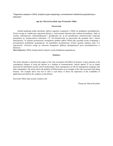 "Zagrożenia związane z DDoS, przykład ryzyka związanego z prowadzeniem działalności gospodarczej w Internecie.” mgr inż. Marcin Krysiński, mgr Przemysław Miller Streszczenie Artykuł podejmuje próbę określenia wpływu zagrożeń związanych z DDoS na działalność przedsiębiorstw. Zwraca uwagę na współczesne zagrożenia płynące z wykorzystania Internetu jako medium komunikacji. Ataki na systemy informatyczne, telekomunikacyjne i produkcyjne nie są już przedmiotem zainteresowania wyłącznie specjalistów ds. bezpieczeństwa informacji i IT. Ich konsekwencje są odczuwalne dla zarządów firm i innych interesariuszy. W artykule przestawiono szczegółowo problem ataków DDoS jako przykład ryzyka związanego z prowadzeniem działalności gospodarczej. Na przykładzie przedstawiono również sposoby radzenia sobie w/w zagrożeniem. Zwrócono uwagę na znaczenie dostępności aplikacji udostępnianych przez przedsiębiorstwa w Internecie. Słowa kluczowe: DDoS, bezpieczeństwo danych, ryzyka działalności gospodarczej Summary The article attempts to determine the impact of the risks associated with DDoS on business. It puts attention to the contemporary dangers of using the Internet as a medium of communication. Attacks against IT are no longer interested for Information security and IT professionals. Their consequences are felt for management companies and other stakeholders. The article shows the problem of DDoS attacks as an example of the risks associated with doing business. The example shows also how to deal w such threat. It shows the importance of the availability of applications provided by the company on the Internet. Keywords: DDoS, data security, business risk. Tłumaczył: Marcin Krysiński