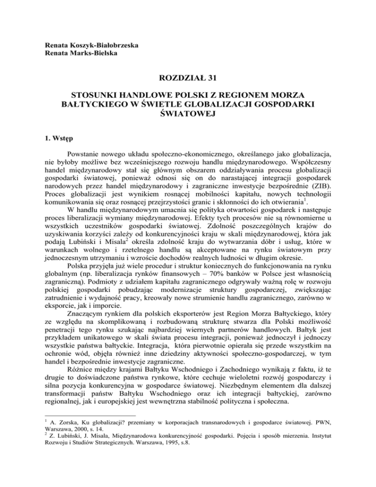 Renata Koszyk-Białobrzeska Renata Marks-Bielska ROZDZIAŁ 31 STOSUNKI HANDLOWE POLSKI Z REGIONEM MORZA BAŁTYCKIEGO W ŚWIETLE GLOBALIZACJI GOSPODARKI ŚWIATOWEJ 1. Wstęp Powstanie nowego układu społeczno-ekonomicznego, określanego jako globalizacja, nie byłoby możliwe bez wcześniejszego rozwoju handlu międzynarodowego. Współczesny handel międzynarodowy stał się głównym obszarem oddziaływania procesu globalizacji gospodarki światowej, ponieważ odnosi się on do narastającej integracji gospodarek narodowych przez handel międzynarodowy i zagraniczne inwestycje bezpośrednie (ZIB). Proces globalizacji jest wynikiem rosnącej mobilności kapitału, nowych technologii komunikowania się oraz rosnącej przejrzystości granic i skłonności do ich otwierania1. W handlu międzynarodowym umacnia się polityka otwartości gospodarek i następuje proces liberalizacji wymiany międzynarodowej. Efekty tych procesów nie są równomierne u wszystkich uczestników gospodarki światowej. Zdolność poszczególnych krajów do uzyskiwania korzyści zależy od konkurencyjności kraju w skali międzynarodowej, która jak podają Lubiński i Misala2 określa zdolność kraju do wytwarzania dóbr i usług, które w warunkach wolnego i rzetelnego handlu są akceptowane na rynku światowym przy jednoczesnym utrzymaniu i wzroście dochodów realnych ludności w długim okresie. Polska przyjęła już wiele procedur i struktur koniecznych do funkcjonowania na rynku globalnym (np. liberalizacja rynków finansowych – 70% banków w Polsce jest własnością zagraniczną). Podmioty z udziałem kapitału zagranicznego odgrywały ważną rolę w rozwoju polskiej gospodarki pobudzając modernizacje struktury gospodarczej, zwiększając zatrudnienie i wydajność pracy, kreowały nowe strumienie handlu zagranicznego, zarówno w eksporcie, jak i imporcie. Znaczącym rynkiem dla polskich eksporterów jest Region Morza Bałtyckiego, który ze względu na skomplikowaną i rozbudowaną strukturę stwarza dla Polski możliwość penetracji tego rynku szukając najbardziej wiernych partnerów handlowych. Bałtyk jest przykładem unikatowego w skali świata procesu integracji, ponieważ jednoczył i jednoczy wszystkie państwa bałtyckie. Integracja, która pierwotnie opierała się przede wszystkim na ochronie wód, objęła również inne dziedziny aktywności społeczno-gospodarczej, w tym handel i bezpośrednie inwestycje zagraniczne. Różnice między krajami Bałtyku Wschodniego i Zachodniego wynikają z faktu, iż te drugie to doświadczone państwa rynkowe, które cechuje wieloletni rozwój gospodarczy i silna pozycja konkurencyjna w gospodarce światowej. Niezbędnym elementem dla dalszej transformacji państw Bałtyku Wschodniego oraz ich integracji bałtyckiej, zarówno regionalnej, jak i europejskiej jest wewnętrzna stabilność polityczna i społeczna. 1 A. Zorska, Ku globalizacji? przemiany w korporacjach transnarodowych i gospodarce światowej. PWN, Warszawa, 2000, s. 14. 2 Z. Lubiński, J. Misala, Międzynarodowa konkurencyjność gospodarki. Pojęcia i sposób mierzenia. Instytut Rozwoju i Studiów Strategicznych. Warszawa, 1995, s.8. 320 Renata Koszyk-Białobrzeska, Renata Marks-Bielska 2. Cel i zakres pracy Celem opracowania jest przedstawienie związków handlowych między Polską a pozostałymi krajami Regionu Morza Bałtyckiego. Szczególną uwagę zwrócono na poznanie powiązań Polski z systemami globalnymi oraz poznanie przyczyn wzrostu lub spadku wymiany z Regionem Bałtyckim. Zakres przedmiotowy opracowania obejmuje wartość obrotów handlowych i ich dynamikę. Zakres czasowy pracy dotyczy okresu 1989-2002. Przyjęty zakres pozwala na określenie tendencji i tempa zmian badanych zjawisk, jakie zaszły w RMB od początku lat 90. W niniejszych rozważaniach jako technikę badawczą zastosowano analizę danych statystycznych, zaczerpniętych z roczników statystycznych za lata 1990-2003. 3. Powiązanie Polski z rynkami globalnymi Najbardziej widocznym przejawem globalizacji jest upowszechnienie systemu wolnorynkowego i zniesienie najważniejszych ograniczeń przestrzennych, czy też politycznych dla prowadzenia działalności gospodarczej w skali ogólnoświatowej. Zanik tych ograniczeń wraz z postępującą liberalizacją handlu światowego i narastaniem międzynarodowych przepływów finansowych ułatwia wytwarzanie towarów i usług w skali globalnej przy wykorzystaniu znacznie mniejszych nakładów niż w ramach bardziej ograniczonych obszarów gospodarczych. Zdolność kraju do czerpania korzyści z globalizacji zależy od tego, w jaki sposób zorganizowane są przedsiębiorstwa, jak pozyskują i udoskonalają dostępne im zasoby środków produkcji i jak harmonizują postęp techniczno-technologiczny z zasobami siły roboczej, oraz jak układają relacje z kooperantami i odbiorcami. Perspektywicznie kluczowym zagadnieniem staje się innowacyjność działania i rozwój eksportu.3 Europa należy do głównych światowych uczestników procesu globalizacji. Jednak polską gospodarkę charakteryzuje nadal słabe powiązanie z otoczeniem zewnętrznym. Jak podaje Liberska (2000)4 mimo postępów w procesie transformacji gospodarka polska nadal ma słabo rozwinięte instytucje rynkowe, brak jest wielu odpowiednich regulacji prawnych, co skłania do posądzania o niską jakość i skuteczność oraz brak wiarygodności wielu instytucji. Brak rozwiniętej infrastruktury globalizacyjnej uniemożliwia wzrost globalnych przepływów i powiązań. Dodatkowym obciążeniem dla Polski jest potrzeba napływu dużej ilości kapitału zagranicznego, co jest dosyć niebezpieczne ze względu na ryzyko „zarażenia” polskiej gospodarki np. kryzysem walutowym. Dopływ kapitału zagranicznego potrzebny jest do restrukturyzacji wielu sektorów polskiego przemysłu, zwiększenia konkurencyjności przedsiębiorstw, zwiększenia zdolności eksportowych oraz do zachęty innych inwestorów do inwes
