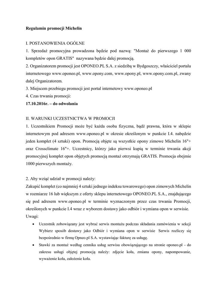 Regulamin promocji Michelin I. POSTANOWIENIA OGÓLNE 1. Sprzedaż promocyjna prowadzona będzie pod nazwą: "Montaż do pierwszego 1 000 kompletów opon GRATIS" nazywana będzie dalej promocją. 2. Organizatorem promocji jest OPONEO.PL S.A. z siedzibą w Bydgoszczy, właściciel portalu internetowego www.oponeo.pl, www.opony.com, www.opony.pl, www.opony.com.pl, zwany dalej Organizatorem. 3. Miejscem przebiegu promocji jest portal internetowy www.oponeo.pl 4. Czas trwania promocji: 17.10.2016r. – do odwołania II. WARUNKI UCZESTNICTWA W PROMOCJI 1. Uczestnikiem Promocji może być każda osoba fizyczna, bądź prawna, która w sklepie internetowym pod adresem www.oponeo.pl w okresie określonym w punkcie I.4. nabędzie jeden komplet (4 sztuki) opon. Promocją objęte są wszystkie opony zimowe Michelin 16"+ oraz Crossclimate 16"+. Uczestnicy, którzy jako pierwsi kupią w terminie trwania akcji promocyjnej komplet opon objętych promocją montaż otrzymają GRATIS. Promocja obejmie 1000 pierwszych montaży. 2. Aby wziąć udział w promocji należy: Zakupić komplet (co najmniej 4 sztuki jednego indeksu towarowego) opon zimowych Michelin w rozmiarze 16 lub większym z oferty sklepu internetowego OPONEO.PL S.A., znajdującego się pod adresem www.oponeo.pl w terminie wyznaczonym przez czas trwania Promocji, określonych w punkcie I.4 wraz z wyborem dostawy jako odbiór i wymiana opon w serwisie. Uwagi: Uczestnik zobowiązany jest wybrać serwis montażu podczas składania zamówienia w sekcji Wybierz sposób dostawy jako Odbiór i wymiana opon w serwisie Serwis rozliczy się bezpośrednio w firmą Opneo.pl S.A. wystawiając fakturę za usługę. Stawki za montaż według cennika usług serwisu obowiązującego na stronie oponeo.pl - do zakresu usługi objętej promocją należy: zdjęcie koła, zmiana opony, napompowanie, wyważenie koła, założenie koła. Wszystkie inne usługi takie jak wymiana wentyli pompowanie azotem, czyszczenie piasty, prostowanie i czyszczenie felgi są usługami nie objętymi promocją i płatne są według stawek serwisu. Z możliwości montażu można skorzystać maksymalnie w ciągu dwóch tygodni od daty zakupu.