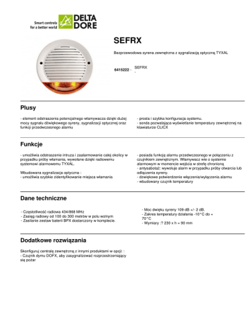 SEFRX Bezprzewodowa syrena zewnętrzna z sygnalizacją optyczną TYXAL 6415222 - SEFRX - Plusy - element odstraszenia potencjalnego włamywacza dzięki dużej mocy sygnału dźwiękowego syreny, sygnalizacji optycznej oraz funkcji przedwczesnego alarmu - prosta i szybka konfiguracja systemu. - sonda pozwalająca wyświetlanie temperatury zewnętrznej na klawiaturze CLICX Funkcje - umożliwia odstraszenie intruza i zaalarmowanie całej okolicy w przypadku próby włamania, wywołane dzięki radiowemu systemowi alarmowemu TYXAL. Wbudowana sygnalizacja optyczna : - umożliwia szybkie zidentyfikowanie miejsca włamania - posiada funkcję alarmu przedwczesnego w połączeniu z czujnikiem zewnętrznym. Włamywacz wie o systemie alarmowym w momencie wejścia w strefę chronioną - antysabotaż: wywołuje alarm w przypadku próby otwarcia lub odłączenia syreny. - dzwiękowe potwierdzenie włączenia/wyłączenia alarmu - wbudowany czujnik temperatury Dane techniczne - Częstotliwość radiowa 434/868 MHz - Zasięg radiowy od 100 do 300 metrów w polu wolnym - Zasilanie zestaw baterii BPX dostarczony w komplecie. Dodatkowe rozwiązania Skonfiguruj centralę zewnętrzną z innymi produktami w opcji: : - Czujnik dymu DOFX, aby zasygnalizować rozprzestrzeniający się pożar - Moc dwięku syreny 109 dB +/- 2 dB. - Zakres temperatury działania -10°C do + 70°C - Wymiary :? 230 x h = 90 mm