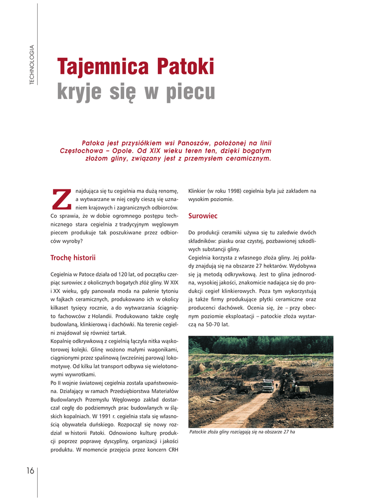 TECHNOLOGIA Tajemnica Patoki kryje się w piecu Patoka jest przysiółkiem wsi Panoszów, położonej na linii Częstochowa – Opole. Od XIX wieku teren ten, dzięki bogatym złożom gliny, związany jest z przemysłem ceramicznym. Z najdująca się tu cegielnia ma dużą renomę, Klinkier (w roku 1998) cegielnia była już zakładem na a wytwarzane w niej cegły cieszą się uzna- wysokim poziomie. niem krajowych i zagranicznych odbiorców. Co sprawia, że w dobie ogromnego postępu tech- Surowiec nicznego stara cegielnia z tradycyjnym węglowym piecem produkuje tak poszukiwane przez odbior- Do produkcji ceramiki używa się tu zaledwie dwóch ców wyroby? składników: piasku oraz czystej, pozbawionej szkodliwych substancji gliny. Trochę historii Cegielnia korzysta z własnego złoża gliny. Jej pokłady znajdują się na obszarze 27 hektarów. Wydobywa Cegielnia w Patoce działa od 120 lat, od początku czer- się ją metodą odkrywkową. Jest to glina jednorod- piąc surowiec z okolicznych bogatych złóż gliny. W XIX na, wysokiej jakości, znakomicie nadająca się do pro- i XX wieku, gdy panowała moda na palenie tytoniu dukcji cegieł klinkierowych. Poza tym wykorzystują w fajkach ceramicznych, produkowano ich w okolicy ją także firmy produkujące płytki ceramiczne oraz kilkaset tysięcy rocznie, a do wytwarzania ściągnię- producenci dachówek. Ocenia się, że – przy obec- to fachowców z Holandii. Produkowano także cegłę nym poziomie eksploatacji – patockie złoża wystar- budowlaną, klinkierową i dachówki. Na terenie cegiel- czą na 50-70 lat. ni znajdował się również tartak. Kopalnię odkrywkową z cegielnią łączyła nitka wąskotorowej kolejki. Glinę wożono małymi wagonikami, ciągnionymi przez spalinową (wcześniej parową) lokomotywę. Od kilku lat transport odbywa się wielotonowymi wywrotkami. Po II wojnie światowej cegielnia została upaństwowiona. Działający w ramach Przedsiębiorstwa Materiałów Budowlanych Przemysłu Węglowego zakład dostarczał cegłę do podziemnych prac budowlanych w śląskich kopalniach. W 1991 r. cegielnia stała się własnością obywatela duńskiego. Rozpoczął się nowy rozdział w historii Patoki. Odnowiono kulturę produkcji poprzez poprawę dyscypliny, organizacji i jakości produktu. W momencie przejęcia przez koncern CRH 16 Patockie złoża gliny rozciągają się na obszarze 27 ha TECHNOLOGIA Produkcja Przywieziona z kopalni glina trafia na składowisko w obrębie cegielni (fot. 1). Przed produkcją glina musi leżakować Formownia Stąd pobierana jest do wstępnej mechanicznej obróbki. Dwa rodzaje gliny: wierchowa i czerwona mieszane są z dodatkiem schudzającym, czyli piaskiem (20% mieszanki). W gniotowniku niszczona jest struktura gliny, potem mieszanka przechodzi przez zestaw dwóch gniotowników walcowych. Ostatni walec przepuszcza mieszankę przez szczelinę szerokości ok. 1 mm. Ustniki Gniotowniki walcowe przepychają glinę przez 1-milimetrową szczelinę Przerobiony surowiec leżakuje przez 2-3 tygodnie, aby po tym czasie trafić do hali z zestawem formującym złożonym z zasilacza, mieszadła i układu formującego. Glina jest tu mielona i doprowadzona do postaci plastycznej jednorodnej masy. Masa ta (w końcówce zestawu formującego odpowietrzana i prasowana) przechodzi przez wymienną końcówkę zwaną „ustnikiem”. Schnące cegły w suszarni 17 TECHNOLOGIA Uformowane pasmo trafia na zestaw tnący, skąd pocię- na plac magazynowy. Tu oczekują na załadunek i wy- te elementy, uzyskawszy swój ostateczny kształt (czyli wiezienie do punktów sprzedaży. kształt przyszłej cegły), zostają załadowane na wózki i odtransportowane do suszarni. Tajemnica Cegły opuszczają suszarnię po uzyskaniu odpowiednio niskiej wilgotności. Ich transport na obszarze cegiel- Tajemnica jakości klinkieru z Patoki związana jest z pie- ni odbywa się tak jak od dziesięcioleci – na wózkach, cem i technologią wypalania. pchanych ręcznie po wąskich torach. Sercem cegielni jest tradycyjny, kręgowy piec Hoffmana opalany węglem. Historia pieca kręgowego sięga roku 1858, gdy Fryderyk Hofmann zbudował piec pierścieniowy. Udoskonalona przez lata konstrukcja tego pieca doprowadziła do powstania pieca kręgowego. Współczesne piece składają się z dwóch równoległych, wielokomorowych kanałów, połączonych na końcach komorami półkolistymi. Każda komora ma swoją bramkę, przez którą odbywa się załadunek i wyładunek wsadu, w sklepieniu znajdują się dymniki odprowadzające spaliny do komina poprzez kanał dymowy. Zasyp paliwa odbywa się przez otwory w sklepieniu pieca. Obmurze pieca kręgowego o grubości 1,5-2,8 m składa się z ogniotrwałej ściany wewnętrz- Piec Hoffmana – na zdjęciu oczywiście w wersji współczesnej nej (cegła szamotowa na zaprawie ogniotrwałej) i zewnętrznej (cegła na zaprawie cementowej). Wypalanie w piecu kręgowym podobne jest do wypalania w pie- Na takich wózkach osuszone cegły docierają do wnę- cach wielokomorowych. Wyróżnia się tu strefy: dosusza- trza pieca. nia (kurzawkowania), podgrzewania, wypalania (ognio- Tu są one ręcznie układane, a po zakończeniu wypala- wą) i studzenia (poogniową). Oprócz tego część komór nia również ręcznie ładowane na wózki i wywożone do zarezerwowanych jest do załadunku i wyładunku wsadu, sortowni. Potem trafiają na palety, a po zafoliowaniu a także dla bieżących prac konserwatorskich. Wysuszone cegły ułożone w jednej z komór pieca gotowe do wypału 18 TECHNOLOGIA Nad właściwym przebiegiem wypalania cegły czuwa czterech palaczy pracujących w systemie zmianowym. Proces wypalania trwa 8 dni i odbywa się w temperaturze 1100°C. Uzyskuje się ją przez odpowiednie dozowanie (ręczno-mechaniczne) miału węglowego. Palenisko stanowi odpowiednio ułożona cegła, a dozowniki umieszczone są w „suficie” paleniska. Przez odpowiednie otwory odbywa się dozowanie miału 