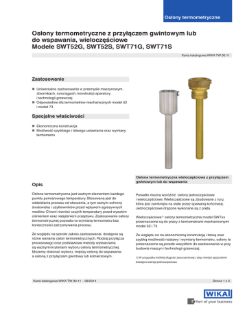 Osłony termometryczne Osłony termometryczne z przyłączem gwintowym lub do wspawania, wieloczęściowe Modele SWT52G, SWT52S, SWT71G, SWT71S Karta katalogowa WIKA TW 90.11 Zastosowanie Uniwersalne zastosowanie w przemyśle maszynowym, zbiornikach, rurociągach, konstrukcji aparatury i technologii grzewczej Odpowiednie dla termometrów mechanicznych model 52 i model 73 Specjalne właściwości Ekonomiczna konstrukcja Możliwość szybkiego i łatwego ustawiania oraz wymiany termometru Opis Osłona termometryczna wieloczęściowa z przyłączem gwintowym lub do wspawania Osłona termometryczna jest ważnym elementem każdego punktu pomiarowego temperatury. Stosowana jest do oddzielania procesu od otoczenia, a tym samym ochrony środowiska i użytkowników przed wpływem agresywnych mediów. Chroni również czujnik temperatury przed wysokim ciśnieniem oraz natężeniem przepływu. Zastosowanie osłony termometrycznej pozwala na wymianę termometru bez konieczności zatrzymywania procesu. Ponadto można wyróżnić osłony jednoczęściowe i wieloczęściowe. Wieloczęściowe są zbudowane z rury, która jest zamknięta na stałe przez spawaną końcówkę. Jednoczęściowe drążone wykonane są z pręta. Ze względu na szeroki zakres zastosowania dostępne są różne warianty osłon termometrycznych. Rodzaj przyłącza procesowego oraz podstawowe metody wytwarzania są ważnymi kryteriami wyboru osłony termometrycznej. Możemy dokonać wyboru, między osłoną do wspawania a osłoną z przyłączem gwintowy lub kołnierzowym. Ze względu na na ekonomiczną konstrukcję i łatwą oraz szybką możliwość nastawy i wymiany termometru, osłony te przeznaczone są przede wszystkim do zastosowania w przy budowie maszyn i technologii grzewczej. Wieloczęściowe1) osłony termometryczne model SWTxx przeznaczone są do pracy z termometrami mechanicznymi model 52 i 73 1) W przypadku krótkiej długości zanurzeniowej ( stop miedzi) opcjonalnie dostępna wersja jednoczęściowa Karta katalogowa WIKA TW 90.11 ∙ 08/2014 Strona 1 z 3 Materiał osłony termometrycznej Stop miedzi , stal 352) lub stal CrNi Przyłącze procesowe Model SWT52G i SWT71G: G ½ B Model SWT52S i SWT71S: przyłącze do wspawania Przyłącze do termometru Odpowiednie do termometrów z czujnikiem gładkim (bez gwintu), średnica Ø 18 mm; Mocowanie za pomocą śruby ustalającej M4 Średnica otworu Odpowiednia dla czujnika o średnicy 8 mm (termometr model 52) lub 13 mm (termometr model 73) Długość zanurzeniowa U1 Odpowiednie do różnych termometrów standardowych długość czujnika l1 dla termometrów model 52 i 73 Maksymalne temperatura i ciśnienie procesowe 160 °C dla osłon termometrycznych ze stopu miedzi (ciśnienie statyczne 6 bar) 500 °C dla osłon termometrycznych ze stali 35 i stali CrNi: max. 25 bar Zależne od: Konstrukcji osłony - Wymiaru - Materiału Warunków procesowych - Przepływu - Gęstości medium 2) Materiał zanurzeniowy rury: stal CrNi 3073041.02 Wymiary w mm Legenda: l 1 Długość zanurzeniowa (przyłącze gwintowe) I2 Długość zanurzeniowa (przyłącze do wspawania) Ø d5 Średnica przyłącza do wspawania E Przyłącze procesowe Ø D 1 Średnica powierzchni uszczelniania SW Pod klucz Ø F1 Średnica zew. osłony Strona 2 z 3 Karta katalogowa WIKA TW 90.11 ∙ 08/2014 Przyłącze procesowe - gwint (Stop Cu, stal 35 lub stal CrNi) Termometr Wymiary w mm Model 52 45 63 100 160 200 63 100 160 200 Model 73 l1 E G½B G½B G½B G½B G½B G½B G½B G½B G½B Przyłącze procesowe do wspawania (St35 lub stal CrNi) SW 27 27 27 27 27 27 27 27 27 Ø F1 10 10 10 10 10 16 16 16 16 Ø D1 26 26 26 26 26 26 26 26 26 Termometr Wymiary w mm Model 52 43 80 140 180 43 80 140 180 l2 Model 73 Ø d5 24 24 24 24 24 24 24 24 Ø F1 10 10 10 10 16 16 16 16 Odpowiednie długości zanurzeniowe dla termometru model 52 i 73 Przyłącze procesowe Gwint Do wspawania Długość zanurzeniowa termometru l1 l1 = długość zanurzeniowa osłony termometrycznej l1 l1 = długość zanurzeniowa osłony termometrycznej l2 + 20 mm Odpowiednie długości zanurzeniowe dla termometru model 52 i 73 Gwint Do wspawania Długość zanurzeniowa l1 l 1 = U1 l1 = U1 + 20 mm Dane do zamówienia Model / Materiał / Przyłącze procesowe / Długość zanurzeniowa U1 / Opcjonalnie © 2005 WIKA Alexander Wiegand SE & Co. KG, wszystkie prawa zastrzeżone. Specyfikacje i wymiary podane w niniejszej karcie przedstawiają stan konstrukcyjny aktualny w momencie wydruku. Istnieje możliwość wprowadzenia modyfikacji i zmian specyfikacji materiałowej bez wcześniejszego powiadomienia. Strona 3 z 3 Karta katalogowa WIKA TW 90.11 ∙ 08/2014 WIKA Polska spółka z ograniczoną odpowiedzialnością sp. k. Ul. Łęgska 29/35, 87-800 Włocławek Tel.: (+48) 54 23 01 100 Fax: (+48) 54 23 01 101 E-mail: [email protected] www.wikapolska.pl 08/2014 PL based on 09/2012 GB Przyłącze procesowe