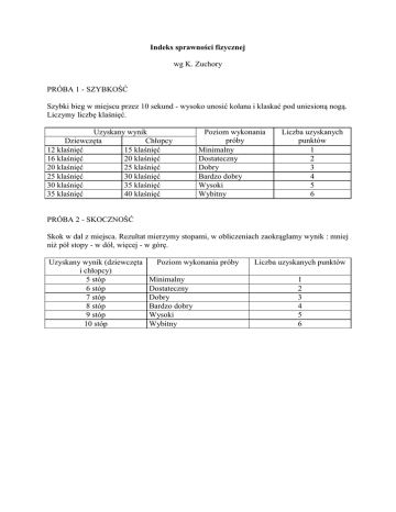 Indeks sprawności fizycznej wg K. Zuchory PRÓBA 1 - SZYBKOŚĆ Szybki bieg w miejscu przez 10 sekund - wysoko unosić kolana i klaskać pod uniesioną nogą. Liczymy liczbę klaśnięć. Uzyskany wynik Dziewczęta Chłopcy 12 klaśnięć 15 klaśnięć 16 klaśnięć 20 klaśnięć 20 klaśnięć 25 klaśnięć 25 klaśnięć 30 klaśnięć 30 klaśnięć 35 klaśnięć 35 klaśnięć 40 klaśnięć Poziom wykonania próby Minimalny Dostateczny Dobry Bardzo dobry Wysoki Wybitny Liczba uzyskanych punktów 1 2 3 4 5 6 PRÓBA 2 - SKOCZNOŚĆ Skok w dal z miejsca. Rezultat mierzymy stopami, w obliczeniach zaokrąglamy wynik : mniej niż pół stopy - w dół, więcej - w górę. Uzyskany wynik (dziewczęta i chłopcy) 5 stóp 6 stóp 7 stóp 8 stóp 9 stóp 10 stóp Poziom wykonania próby Minimalny Dostateczny Dobry Bardzo dobry Wysoki Wybitny Liczba uzyskanych punktów 1 2 3 4 5 6 PRÓBA 3 - SIŁA RAMION Uchwycić się drążka, tak, aby swobodnie zawisnąć, nie dotykając nogami podłoża. Wykonujemy kolejne ćwiczenia o wzrastającej trudności. Uzyskany wynik Dziewczęta Chłopcy Zwis na wyprostowanych rękach, wytrzymać 3 sek. Zwis na wyprostowanych rękach, wytrzymać 10 sek. Zwis na jednej ręce, wytrzymać 3 sek. Zwis na wyprostowanych rękach, wytrzymać 10 sek. Zwis na jednej ręce, wytrzymać 10 sek. Poziom wykonania próby Minimalny Liczba uzyskanych punktów 1 Dostateczny 2 Zwis na wyprostowanych rękach, podciągnąć się oburącz tak, aby głowa Dobry była wyżej niż drążek, wytrzymać 3 sek. Zwis na jednej ręce, Zwis na wyprostowanych wytrzymać rękach, podciągnąć się oburącz tak, aby głowa Bardzo dobry była wyżej niż drążek, 10 sek. wytrzymać 10 sek. Zwis na wyprostowanych Zwis, podciągnąć się rękach, podciągnąć się oburącz, jedną rękę wolno oburącz tak, aby głowa opuścić, wytrzymać 10 sek. Wysoki była wyżej niż drążek, wytrzymać 3 sek. Zwis na wyprostowanych rękach, podciągnąć się oburącz tak, aby głowa była wyżej niż drążek, wytrzymać 10 sek. Zwis, podciągnąć się oburącz, jedną rękę wolno opuścić, wytrzymać kolejno na prawej i lewej ręce po 10 sek. Wybitny 3 4 5 6 PRÓBA 4 - GIBKOŚĆ Z pozycji "na baczność", nie zginając nóg w kolanach, wykonać ruchem ciągłym powolny skłon w przód. Uzyskany wynik (dziewczęta i chłopcy) Chwyt oburącz za kostki Palcami obu rąk dotknięcie palców stóp Palcami obu rąk dotknięcie podłoża Wszystkimi palcami obu rąk dotknięcie podłoża Dotknięcie dłońmi podłoża Dotknięcie głową kolan Poziom wykonania próby Minimalny Dostateczny Liczba uzyskanych punktów 1 2 Dobry Bardzo dobry 3 4 Wysoki Wybitny 5 6 PRÓBA 5 - WYTRZYMAŁOŚĆ A) bieg w miejscu w tempie ok. 120 kroków na minutę - liczymy czas biegu lub B) bieg na odległość - oceniamy pokonany dystans Uzyskany wynik Dziewczęta Chłopcy 1 min. / 200 m. 2 min / 400 m 3 min. / 500 m. 5 min. / 1000 m. 6 min. / 1000 m. 10 min. / 2000 m. 10 min. / 1500 m. 15 min. / 2500 m. 15 min. / 2000 m. 20 min. / 3000 m. 25 min. / 2500 m. 30 min. / 4000 m. Poziom wykonania próby Minimalny Dostateczny Dobry Bardzo dobry Wysoki Wybitny Liczba uzyskanych punktów 1 2 3 4 5 6 PRÓBA 6 - SIŁA MIĘŚNI BRZUCHA W leżeniu na plecach (ręce ułożone dowolnie) unosimy nogi tuż nad podłogą i wykonujemy "nożyce poprzeczne" tak długo, jak możemy. Uzyskany wynik Dziewczęta Chłopcy 10 sek. 30 sek. 30 sek. 1 min. 1 min. 1,5 min 1,5 min. 2 min. 2 min. 3 min. 3 min. 4 min. Poziom wykonania próby Minimalny Dostateczny Dobry Bardzo dobry Wysoki Wybitny Liczba uzyskanych punktów 1 2 3 4 5 6 NORMY OCENY SPRAWNOŚCI Wiek Minimalna 9 - 10 11 - 12 13 - 15 6 6 6 Ocena sprawności w punktach Dostateczna Dobra Bardzo Wysoka dobra 11 15 19 23 11 16 20 25 12 17 22 27 Wybitna 27 29 31