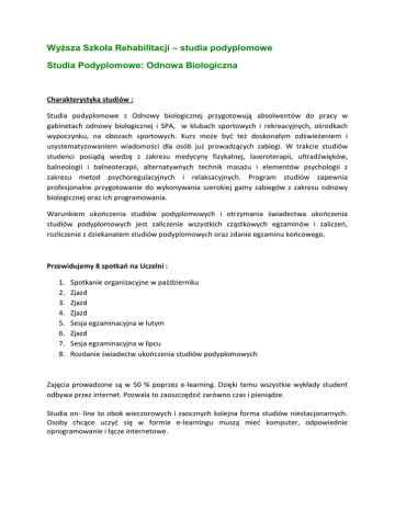 Wyższa Szkoła Rehabilitacji – studia podyplomowe Studia Podyplomowe: Odnowa Biologiczna Charakterystyka studiów : Studia podyplomowe z Odnowy biologicznej przygotowują absolwentów do pracy w gabinetach odnowy biologicznej i SPA, w klubach sportowych i rekreacyjnych, ośrodkach wypoczynku, na obozach sportowych. Kurs może być też doskonałym odświeżeniem i usystematyzowaniem wiadomości dla osób już prowadzących zabiegi. W trakcie studiów studenci posiądą wiedzę z zakresu medycyny fizykalnej, laseroterapii, ultradźwięków, balneologii i balneoterapii, alternatywnych technik masażu i elementów psychologii z zakresu metod psychoregulacyjnych i relaksacyjnych. Program studiów zapewnia profesjonalne przygotowanie do wykonywania szerokiej gamy zabiegów z zakresu odnowy biologicznej oraz ich programowania. Warunkiem ukończenia studiów podyplomowych i otrzymania świadectwa ukończenia studiów podyplomowych jest zaliczenie wszystkich cząstkowych egzaminów i zaliczeń, rozliczenie z dziekanatem studiów podyplomowych oraz zdanie egzaminu końcowego. Przewidujemy 8 spotkań na Uczelni : 1. 2. 3. 4. 5. 6. 7. 8. Spotkanie organizacyjne w październiku Zjazd Zjazd Zjazd Sesja egzaminacyjna w lutym Zjazd Sesja egzaminacyjna w lipcu Rozdanie świadectw ukończenia studiów podyplomowych Zajęcia prowadzone są w 50 % poprzez e-learning. Dzięki temu wszystkie wykłady student odbywa przez internet. Pozwala to zaoszczędzić zarówno czas i pieniądze. Studia on- line to obok wieczorowych i zaocznych kolejna forma studiów niestacjonarnych. Osoby chcące uczyć się w formie e-learningu muszą mieć komputer, odpowiednie oprogramowanie i łącze internetowe. Adresaci: Studia podyplomowe kierowane są do absolwentów studiów wyższych o kierunkach: medycznych, fizjoterapia, turystyka i rekreacja oraz wychowanie fizyczne. Wykładowcy : Naszą kadrę tworzą fizjoterapeuci oraz lekarze z wieloletnim doświadczeniem zawodowym. Współpracujemy z najlepszymi ośrodkami rehabilitacyjnymi w Polsce. Pozyskaliśmy najwybitniejszą kadrę, kontynuującą w praktyce i dydaktyce tradycje słynnej na cały świat konstancińskiej szkoły rehabilitacji. Oferujemy studentom naukę na najwyższym poziomie. Na naszej uczelni wykładają najbardziej znani lekarze i specjaliści w dziedzinie rehabilitacji i fizjoterapii, m.in.: o o o o o o o o o o o o o o o o o o o o o prof. zw. dr hab. n.med. Jerzy Kiwerski prof. dr hab. n.med. Krystyna Księżopolska-Orłowska prof. zw. dr hab. n.med. Jan Haftek prof. zw. dr hab. n.med. Ryszard Piotrowicz prof. dr hab. n.med. Anna Doboszyńska dr hab. n.med. Wojciech Mikuła dr hab. Janusz Bronarski dr n.med. Paweł Baranowski dr n.med. Adam Ogonowski dr Marek Łyp dr Romuald Kaczorowski dr Iwona Stanisławska dr Hanna Lewandowska dr Sławomir Grzeszczyk dr Ryszard Kaczor dr Justyna Karbownik-Kopacz dr Katarzyna Kiwerska-Jagodzińska dr Janusz Kołakowski dr Piotr Tederko dr Krzysztof Wasiak dr Lidia Zając Kierownik merytoryczny studiów: Mgr Anna Kopiczko Pełnomocnik Dziekana ds. studiów podyplomowych, kursów i szkoleń : mgr Gabriela Nowińska [email protected] 604217400 Zasady naboru: Studenci przyjmowani są według kolejności zgłoszeń Warunki przyjęcia: 1. Warunkiem koniecznym do zapisania się na Uczelnię jest rejestracja online 2. Złożenie wymaganych dokumentów w ciągu 14 dni od momentu zalogowania się Wymagane dokumenty: 1. 2. 3. 4. 5. 6. 7. 8. Karta ewidencyjna drukowana po zakończeniu rekrutacji online Podanie ( pobierz >>> ) Dyplom ukończenia studiów lub odpis Kserokopia dowodu wniesienia wpisowego oraz opłaty rekrutacyjnej Cztery fotografie o wymiarze 37x52 bez nakrycia głowy, na jasnym tle Kserokopia dowodu osobistego Deklaracja płatności ( pobierz >>> ) Dwa egzemplarze umowy o warunkach płatności ( pobierz >>> ) liczba miejsc: 30 W przypadku zebrania się grupy poniżej 15 osób studia mogą zostać odwołane ( opłata rekrutacyjna i wpisowe podlegają zwrotowi ) lub koszty studiów mogą ulec podwyższeniu po wcześniejszej konsultacji telefonicznej z każdym kandydatem. Opłata: Wpisowe: 100 zł Opłata rekrutacyjna: 50zł Opłata za cały rok studiów: 4320 zł Opłata za semestr: 2400zł 10 rat : 530 zł od 15 października do 15 lipca Program ramowy : Czas trwania : 2 semestry Ilość godzin : 285 w tym 150h praktyk i ćwiczeń SEMESTR PRZEDMIOT Anatomia wykłady poprzez elearning Ortopedia i traumatologia wykłady poprzez e-learning Masaż ILOŚĆ GODZIN 10 FORMA ZALICZENIA EGZ 10 EGZ 10+ 30 ZAL 10 +20 EGZ 10 ZAL 20 ZAL 10 ZAL 15 ZAL 10 ZAL 10 EGZ 15 ZAL 1 Masaż klasyczny Masaż niemowląt z elementami rehabilitacji dziecięcej Masaż limfatyczny Masaż segmentarny Masaż sportowy Masaż twarzy Masaż odchudzający Masaż relaksacyjny Wykład poprzez e-learning + ćwiczenia praktyczne Fizykoterapia wykłady poprzez elearning oraz ćwiczenia Fizjologia wysiłku fizycznego wykłady poprzez e-learning Metodyka nauczania ruchu ćwiczenia Podstawy fizjoterapii wykłady poprzez e-learning Kinezjologiczne uwarunkowania odnowy biologicznej wykłady poprzez e-learning Razem w 1 semestrze : 145 Metody refleksoterapii wykłady poprzez e-learning Teoria i programowanie odnowy biologicznej, wykłady poprzez elearning Balneoterapia i leczenie uzdrowiskowe- wykłady poprzez elearning 2 Zabiegi kosmetyczne w odnowie biologicznej wykłady poprzez elearning 10 ZAL Psychologia sportu i odnowy biologicznej wykłady poprzez elearning Techniki relaksacyjne ćwiczenia 10 EGZ 10 ZAL Nowoczesne formy fitness ćwiczenia Dietetyka i doping w sporcie wykłady poprzez e-learning Zabiegi fizykalne w odnowie biologicznej ćwiczenia 10 ZAL 6 ZAL 10 ZAL Nowoczesna aparatura Spa i Wellness wykłady poprzez elearning Praktyki 4 ZAL 50 ZAL RAZEM W 2 SEMESTRZE : 140 Podczas całego toku studiów mogą się Państwo z nami kontaktować : W sprawach formalnych związanych z tokiem studiów : mgr inż. Cezary Dytman, [email protected] , 22 6310575 wew.