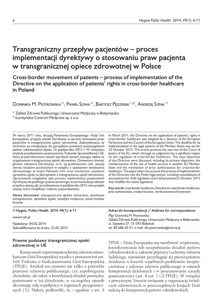 Hygeia Public Health 2014, 49(1): 6-11 Transgraniczny przepływ pacjentów – proces implementacji dyrektywy o stosowaniu praw pacjenta w transgranicznej opiece zdrowotnej w Polsce Cross-border movement of patients – process of implementation of the Directive on the application of patients’ rights in cross-border healthcare in Poland Dominika M. Piotrowska 1/, Paweł Sowa 1/, Bartosz Pędziński 1,2/, Andrzej Szpak 1/ 1/ 2/ Zakład Zdrowia Publicznego, Uniwersytet Medyczny w Białymstoku Łomżyńskie Centrum Medyczne sp. z o.o. W marcu 2011 roku, decyzją Parlamentu Europejskiego i Rady Unii Europejskiej, przyjęta została Dyrektywa w sprawie stosowania praw pacjentów w transgranicznej opiece zdrowotnej. Zadecydowano, że terminem jej transpozycji do porządków prawnych poszczególnych państw członkowskich będzie 25 października 2013 r. W niniejszym artykule przedstawiono postanowienia Trybunału Sprawiedliwości UE, który za pośrednictwem swoich wyroków wywarł znaczący wpływ na uregulowanie transgranicznej opieki zdrowotnej. Omówiono również główne założenia Dyrektywy, m.in. jej podstawowe cele, zasady zwrotu kosztów poniesionych w związku z uzyskaniem świadczenia zdrowotnego w innym Państwie Unii oraz mechanizm uzyskania uprzedniej zgody na skorzystanie z transgranicznej opieki zdrowotnej. Opracowanie uwzględnia opis procesu implementacji postanowień Dyrektywy do polskiego systemu prawnego, w tym konsultacje założeń projektu ustawy, jak i przedstawiony w październiku 2013 roku projekt ustawy, który modyfikuje rodzime ustawodawstwo. Słowa kluczowe: transgraniczna opieka zdrowotna, dyrektywa transgraniczna, uprzednia zgoda, turystyka medyczna, zwrot kosztów leczenia In March 2011, the Directive on the application of patients’ rights in cross-border healthcare was adopted by a decision of the European Parliament and the Council of the European Union. The deadline for its implementation in the legal systems of the Member States was set for 25 October 2013. This article presents the case law of the Court of Justice of the EU, which, through its judgments has a significant impact on the regulation of cross-border healthcare. The main objectives of the Directive were discussed, including its primary objectives, the reimbursement of the use of health services in another EU Member State and the mechanism of prior authorization for cross-border healthcare. The paper takes into account the process of implementation of the Directive into the Polish legal system, including consultations of assumptions for draft legislation and a bill presented in October 2013 that modifies the native legislation. Key words: cross-border healthcare, Directive on cross-border healthcare, prior authorization, medical tourism, reimbursement of treatment © Hygeia Public Health 2014, 49(1): 6-11 Adres do korespondencji / Address for correspondence www.h-ph.pl Mgr Dominika M. Piotrowska Zakład Zdrowia Publicznego, Uniwersytet Medyczny w Białymstoku ul. Szpitalna 37, 15-295 Białystok tel. 85 686 50 51, e-mail: [email protected] Nadesłano: 04.02.2014 Zakwalifikowano do druku: 25.02.2014 Prawne podstawy transgranicznej opieki zdrowotnej w UE Konieczność zapewnienia ochrony zdrowia miesz‑ kańcom Unii Europejskiej wynika z postanowień art. 168 Traktatu o funkcjonowaniu Unii Europejskiej (TFUE). Artykuł ten stanowi nie tylko o potrzebie poprawy zdrowia publicznego, czy zapobieganiu chorobom, ale także o koordynacji działań pomiędzy państwami w tej dziedzinie, w szczególny sposób akcentując rolę współpracy w regionach przygranicz‑ nych [1]. Należy podkreślić, że – zgodnie z art. 6 TFUE – Unia Europejska ma możliwość wspierania, koordynowania lub uzupełniania działań państw członkowskich w zakresie poprawy i ochrony zdrowia ludzkiego, natomiast przysługuje jej pierwszeństwo działania w kwestii wspólnych problemów bezpie‑ czeństwa z zakresie zdrowia publicznego w ramach kompetencji dzielonych i w poszanowaniu zasady pomocniczości (art. 4 ust. 1 i 2 TFUE). W związku z powyższym, kwestie związane z organizacją świad‑ czeń zdrowotnych w poszczególnych krajach Unii należą do kompetencji państw członkowskich. Piotrowska DM i wsp. Transgraniczny przepływ pacjentów – proces implementacji dyrektywy o stosowaniu praw ... Dokumentem, który przyczynił się do koordynacji systemów zabezpieczenia społecznego, a zatem uregu‑ lował kwestie związane z możliwością uzyskania opie‑ ki zdrowotnej w innym kraju UE, było rozporządzenie Rady (EWG) nr 1408/71 z dnia 14 czerwca 1971 r. w sprawie stosowania systemów zabezpieczenia społecznego do pracowników najemnych i ich rodzin przemieszczających się we Wspólnocie [2]. Powyższy akt nie umożliwił jednak pełnego dostępu do świad‑ czeń zdrowotnych w innym kraju członkowskim, co skutkowało niechęcią państw do pokrywania kosztów usług medycznych uzyskanych za granicą. W związku z tym pojawiło się wiele wątpliwości odnośnie trans‑ granicznego świadczenia usług zdrowotnych, które znalazły swoje wyjaśnienie w postanowieniach Euro‑ pejskiego Trybunał Sprawiedliwości (ETS), obecnie Trybunału Sprawiedliwości UE (TSUE). Transgraniczna opieka zdrowotna została w dużym stopniu uregulowana za pośrednictwem orzecznictwa TSUE. Opowiedział się on za zwrotem kosztów opieki zdrowotnej świadczonej w państwie członkowskim innym niż kraj zamieszkania osoby korzystającej z opieki. Przełomowymi wyrokami w tym obszarze stały się sprawy obywateli Luksemburga – Kohlla [3] i Deckera [4] z 1998 r. Raymond Kohll wystąpił do Trybunału przeciwko Zjednoczeniu Kas Chorych w Luksemburgu. Sprawa dotyczyła przeprowadzenia leczenia ortodontycznego jego córki w Niemczech. W tym celu zwrócił się do kasy chorych w swoim kraju, aby jako jego ubezpie‑ czyciel wydała zgodę na leczenie za granicą. Kasa cho‑ rych odmówiła zgody na refundację, uzasadniają