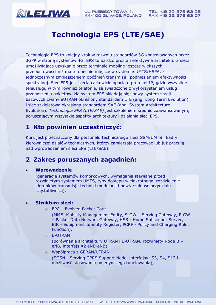 Technologia EPS (LTE/SAE) Technologia EPS to kolejny krok w rozwoju standardów 3G kontrolowanych przez 3GPP w stronę systemów 4G. EPS to bardzo prosta i efektywna architektura sieci umożliwiająca uzyskanie przez terminale mobilne jeszcze większych przepustowości niż ma to obecnie miejsce w systemie UMTS/HSPA, z jednoczesnym zmniejszeniem opóźnień transmisji i podniesieniem efektywności spektralnej. Sieć EPS jest siecią całkowicie opartą o protokół IP, gdzie wszystkie teleusługi, w tym również telefonia, są świadczone z wykorzystaniem usług przenoszenia pakietów. Na system EPS składają się: nowy system stacji bazowych zwany eUTRAN określony standardem LTE (ang. Long Term Evolution) i sieć szkieletowa określona standardem SAE (ang. System Architecture Evolution). Technologia EPS (LTE/SAE) jest szkoleniem średnio zaawansowanym, poruszającym wszystkie aspekty architektury i działania sieci EPS. 1 Kto powinien uczestniczyć: Kurs jest przeznaczony dla personelu technicznego sieci GSM/UMTS i kadry kierowniczej działów technicznych, którzy zamierzają pracować lub już pracują nad wprowadzeniem sieci EPS (LTE/SAE). 2 Zakres poruszanych zagadnień: • Wprowadzenie (generacje systemów komórkowych, wymagania stawiane przed rozwiniętym systemem UMTS, typy dostępu wielokrotnego, rozdzielenie kierunków transmisji, techniki modulacji i powtarzalność przydziału częstotliwości), • Struktura sieci: o o o EPC – Evolved Packet Core (MME -Mobility Management Entity, S-GW – Serving Gateway, P-GW – Packet Data Network Gateway, HSS - Home Subscriber Server, EIR - Equipment Identity Register, PCRF - Policy and Charging Rules Function), E-UTRAN (porównanie architektury UTRAN i E-UTRAN, rozwinięty Node B – eNB, interfejs X2 eNB-eNB), Współpraca z GERAN/UTRAN (SGSN - Serving GPRS Support Node, interfejsy: S3, S4, S12 i możliwość stosowania pojedynczego tunelowania), o o o o o • Roaming międzynarodowy (trasowanie ruchu poprzez sieć macierzystą, lokalne połączenie z sieciami zewnętrznymi), Współpraca z systemami dostępowymi spoza 3GPP (WLAN, WiMax) (zaufany i niezaufany system dostępowy spoza 3GPP, ePDG evolved Packet Data Gateway, AAA - Authentication Authorisation and Accounting), Interfejsy i stosy protokołów, Geograficzna struktura sieci (TA - Tracking Area i rejestracja do listy TA), Numery identyfikacyjne (IMSI, MSISDN, IMEI, adres PDP, GUTI, S-TMSI, M-TMSI), OFDMA and SC-FDMA (Transformata Fouriera, Dyskretna Transformata Fouriera, ortogonalność częstotliwości, rozdzielenie kanałów w FDMA i OFDMA, przykład transmisji, budowa nadajnika i odbiornika, zalety i wady OFDM, OFDMA, SC-FDMA), • E-UTRAN o o o o o o o o • Zakresy częstotliwości, Interferencje międzykomórkowe (randomizacja, likwidacja, koordynacja i unikanie interferencji), Rozdzielenie kierunków transmisji (rozdzielenie kierunków transmisji w dziedzinie częstotliwość i dziedzinie czasu), Podstawowe struktury czasowe i parametry (siatka zasobów, blok zasobów, ramka radiowa, symbole referencyjne), Usługa MBMS (MBMS w pojedynczej i w wielu komórkach), Kanały (kanały logiczne, transportowe, fizyczne i radiowe oraz ich charakterystyka, porównanie kanałów UTRAN i E-UTRAN), Poszukiwanie komórki, synchronizacja i procedura dostępu, Proces transmisji (wyznaczanie kolejności transmisji w kierunku w górę i kierunku w dół, potwierdzenia i retransmisje HARQ), Sieć szkieletowa o MME w puli (obszar puli, selekcja i adresowanie MME, rozkład ruchu, kontrola przeciążeń), o o o • Transport sygnalizacji - SIGTRAN (protokół SCTP, multihoming, strumienie, porównanie protokołu zorientowanego na strumienie i wiadomości, bezpieczeństwo, porównanie SIGTRAN w sieciach GSM/UMTS I w sieci EPS), Transfer ruchu (tunelowanie, protokół eGTP, nawiązanie tunelu, MIP i PMIP), Jakość usług przenoszenia (domyślna usługa przenoszenia EPS, dedykowana usługa przenoszenia EPS, parametry jakości usługi, wymiana parametrów określających jakość usługi przenoszenia pomiędzy zewnętrznymi serwerami usług i siecią EPS), Kontrola polityk i taryfikacji (PCC – Policy Control and Charging) (PCC w UMTS R5-, R6 i UMTS/EPS R8, PDF - Policy Decision Function, CRF Charging Rules Function, PCRF - Policy and Charging Rules Function, interakcje z usługami), • Procedury sygnalizacyjne (stany EMM, ECM i RRC, dołączenie do sieci, aktualizacja obszaru TA, żądanie usługi przez terminal/sieć, zwolnienie połączenia interfejsu S1, aktywacja dedykowanej usługi przenoszenia, przeniesienie połączenia pomiędzy komórkami, przeniesienie połączenia do innego systemu), • Usługi (system IMS, przykładowe usługi IMS: telefonia, usługa obecności, wiadomości błyskawiczne, wiadomości przesyłane poprzez oddzielną sesję połączenia). 3 Wymagania wstępne: Ukończenie jednego ze szkoleń: • Technologia UMTS (KUMA 2102), • Interfejs radiowy WCDMA (KUMA 2103), lub posiadanie ogólnej wiedzy na temat UMTS. 4 Metoda szkolenia: Wykład. 5 Czas trwania: Dwa dni.