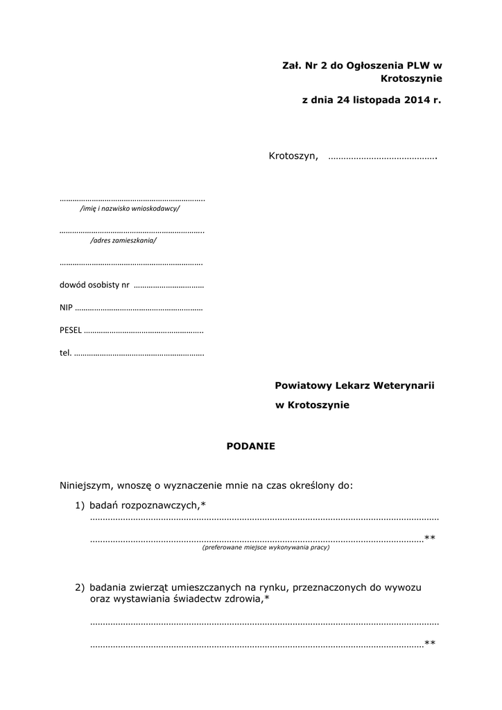 Zał. Nr 2 do Ogłoszenia PLW w Krotoszynie z dnia 24 listopada 2014 r. Krotoszyn, ……………………………………. ………………………………………………………….. /imię i nazwisko wnioskodawcy/ ………………………………………………………….. /adres zamieszkania/ …………………………………………………………. dowód osobisty nr …………………………… NIP …………………………………………………… PESEL ……………………………………………….. tel. ……………………………………………………. Powiatowy Lekarz Weterynarii w Krotoszynie PODANIE Niniejszym, wnoszę o wyznaczenie mnie na czas określony do: 1) badań rozpoznawczych,* ………………………………………………………………………………………………………………………… ……………………………………………………………………………………………………………………** (preferowane miejsce wykonywania pracy) 2) badania zwierząt umieszczanych na rynku, przeznaczonych do wywozu oraz wystawiania świadectw zdrowia,* ………………………………………………………………………………………………………………………… ……………………………………………………………………………………………………………………** (preferowane miejsce wykonywania pracy) 3) sprawowania nadzoru nad ubojem zwierząt rzeźnych, w tym badania przedubojowego i poubojowego, oceny mięsa i nadzoru nad przestrzeganiem przepisów o ochronie zwierząt w trakcie uboju, * ………………………………………………………………………………………………………………………… ………………………………………………………………………………………………………………………… ………………………………………………………………………………………………………………………… ……………………………………………………………………………………………………………………** (preferowane miejsce wykonywania pracy) 4) sprawowania nadzoru nad rozbiorem, przetwórstwem lub przechowywaniem mięsa i wystawiania wymaganych świadectw zdrowia,* ………………………………………………………………………………………………………………………… ………………………………………………………………………………………………………………………… ………………………………………………………………………………………………………………………… ………………………………………………………………………………………………………………………… ………………………………………………………………………………………………………………………… ………………………………………………………………………………………………………………………… ……………………………………………………………………………………………………………………** (preferowane miejsce wykonywania pracy) 5) sprawowania nadzoru nad przetwórstwem mleka oraz przechowywaniem produktów mleczarskich,* ………………………………………………………………………………………………………………………… ………………………………………………………………………………………………………………………… ………………………………………………………………………………………………………………………… ……………………………………………………………………………………………………………………** (preferowane miejsce wykonywania pracy) 6) pobierania próbek do badań,* ………………………………………………………………………………………………………………………… ………………………………………………………………………………………………………………………… ……………………………………………………………………………………………………………………** (preferowane miejsce wykonywania pracy) 7) badania laboratoryjnego mięsa na obecność włośni,* ………………………………………………………………………………………………………………………… ………………………………………………………………………………………………………………………… ……………………………………………………………………………………………………………………** (preferowane miejsce wykonywania pracy) 8) badania poubojowego mięsa na terenie gospodarstw na wniosek posiadacza zwierząt przy produkcji mięsa na użytek własny ………………………………………………………………………………………………………………………… ……………………………………………………………………………………………………………………** (preferowane miejsce wykonywania pracy) Oświadczam, że: • nie jestem pracownikiem Inspekcji Weterynaryjnej, • posiadam prawo wykonywania zawodu lekarza weterynarii, • posiadam warunki i środki techniczne do wykonywania powyżej wymienionych czynności, • posiadam pełną znajomość przepisów prawodawstwa weterynaryjnego w rozumieniu art. 2 ustawy z dnia 29 stycznia 2004 r. o Inspekcji Weterynaryjnej (tekst jednolity: Dz. U. z 2010 r. Nr 112, poz. 744), a w szczególn