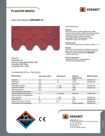OPIS PRODUKTU Materiał Masa bitumiczna - asfalt modyfikowany SBS. Osnowa-welon szklany. Wierzchnia strona pokryta posypką mineralną. Spodnia strona pokryta samowulkanizującą masą bitumiczną zawierającą SBS i zabezpieczona przed sklejaniem w paczkach folią PE. Zastosowanie Jako materiał pokryciowy na dachy o spadku > 11o. Montaż Mocowane mechanicznie do podłoża z desek lub płyty, przy użyciu specjalnych gwoździ do gontu. Zalecane ocynkowane gwoździe KERABIT o profilu spiralnym. Kolory cieniowane jasnoszary/czarny; czerwony/czarny; zielony/czarny;brązowy/czarny ATESTY Certyfikat CE Norma europejska PN-EN 544 Certyfikat ISO 9001 Certyfikat ISO 14001 CHARAKTERYSTYKA PRODUKTU Właściwości Jednostka miary Wymagania Długość Szerokość Grubość Gramatura osnowy Zawartość asfaltu Gramatura gontu Siła zrywająca w kierunku z długością/szerokością gontu Wytrzymałość na rozdzieranie przez gwóźdź Nasiąkliwość o Spływność w tem. 90 C/2h Rozprzestrzenianie płomieni mm mm mm 2 g/m 2 g/m 2 g/m ±3 ±3 _ > 100 _ > 1300 Wartość deklarowana 1000 317,5 3,3 + klej 120 2000 4000 Metoda badań PN-EN 544 PN-EN 544 PN-EN 544 PN-EN 544 N _ > 600/400 800/700 PN-EN 544 N % mm _ > 100 < _ 1,0 0,0 150 0,16 0,0 Trudno zapalne PN-EN 544 PN-EN 544 PN-EN 544 PN-EN 544 GONTY KERABIT MODYFIKOWANE SBS KERABIT Sp. z o.o. ul..Bobrowiecka 3 lok.189, 00-728 Warszawa tel. (22) 403 02 02 fax (22) 403 02 12 www.kerabit.pl e-mail: [email protected] KERABIT LAT