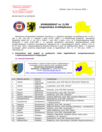 PAŃSTWOWY WOJEWÓDZKI INSPEKTOR SANITARNY w Gdańsku dla województwa pomorskiego 80-211 Gdańsk, ul. Dębinki Gdańsk, dnia 19 czerwca 2009 r. SE.NS-30/4711/10/MS/09 KOMUNIKAT nr 2/09 (kąpieliska śródlądowe) Państwowy Wojewódzki Inspektor Sanitarny w Gdańsku działając na podstawie art. 4 ust 1 pkt 1, art. 12a ust. 3 Ustawy z dnia 14.03. 1985 r. o Państwowej Inspekcji Sanitarnej (jednolity tekst Dz. U. Nr 122 z 2006 r. poz. 851 z późn. zm.), § 9 Rozporządzenia Rady Ministrów z dnia 6.05.1997 r. w sprawie określenia warunków bezpieczeństwa osób przebywających w górach, pływających, kąpiących się i uprawiających sporty wodne ( Dz. U. Nr 57 poz. 358 ), Rozporządzenia Ministra Zdrowia z dnia 16 października 2002 r. w sprawie wymagań, jakim powinna odpowiadać woda w kąpieliskach (Dz. U. nr 183 poz. 1530 ) – informuje że: 1. Dozwolona jest kąpiel w podanych i wykorzystywanych tradycyjnie: niżej kąpieliskach zorganizowanych a) powiat bytowski Komunikaty w trakcie trwania sezonu kąpielowego w przypadku zmiany jakości wody wydawać będzie Państwowy Powiatowy Inspektor Sanitarny w Bytowie tel. (059) 822-36–85 e-mail: [email protected] http://www.wrotapomorza.pl/pl/bip/psse/psse_bytow L.p. Nazwa jeziora 1 Jasień 2 Jasień 3 Jasień 4 5 6 7 Mausz Mausz Czarne Dąbrówno Studzieniczno Gmina Czarna Dąbrówka Czarna Dąbrówka Czarna Dąbrówka Parchowo Parchowo Studzienice Studzienice 8 Studzienice Studzienice 9 10 11 12 13 Kłączno Ryńskie Dywan Jeleń Dywan Studzienice Studzienice Studzienice Bytów Studzienice 14 Lednik Miastko 15 16 Głębokie Bobęcińskie Miastko Miastko Lokalizacja Łupawsko, przy OW Stoczni Marynarki Wojennej Łupawsko, przy OW „Wrzos” Zawiaty, przy OW PKS Zawiaty Frydrychowo, przy OW „Dal-Sol” Grabowo, przy OW „Skierka” Czarna Dąbrowa, przy OW „Grzybia Dąbrowa” Studzienice, przy OW „Cefarm” Studzienice przy OW „EG Centrum Szkoleń i Wypoczynku” Kłączno, przy OW „Szreder” Kłączno-Osowo, przy ośrodku kolonijno – wczasowym Sominy, przy OW „Uroczysko” Jeleń k/Bytowa, przy OW „Jeleń” Sominy, przy OW „Kaszubski Bór” Miastko, kąpielisko miejskie (teren wolny poza miastem), ul. Jeziorna Świeszyno, przy OW „Słoneczny Stok” Bobęcino, przy Harcerskim Ośrodku Wypoczynkowym b) powiat chojnicki Komunikaty w trakcie trwania sezonu kąpielowego w przypadku zmiany jakości wody wydawać będzie Państwowy Powiatowy Inspektor Sanitarny w Chojnicach tel. (052) 397-63-95 e-mail: [email protected] www.chojniceinfo.net/sanepid L.p. 1. 2. Nazwa jeziora Charzykowskie Charzykowskie Gmina Chojnice Chojnice 3. Charzykowskie Chojnice 4. Charzykowskie Chojnice 5. 6. Dybrzk Karsińskie Brusy Chojnice 7. Kosobudno Brusy 8. 9. Niedźwiedź Ostrowite Chojnice Czersk Lokalizacja Charzykowy Małe Swornegacie Funka przy Harcerskim Centrum Edukacji Ekologicznej Bachorze przy Ośrodku RehabilitacyjnoWypoczynkowym „Natura’ Czernica Swornegacie Czernica przy Akademickim Ośrodku Szkoleniowym AMW „CYRANKA” Chojniczki Ostrowite c) powiat człuchowski Komunikaty w trakcie trwania sezonu kąpielowego w przypadku zmiany jakości wody wydawać będzie Państwowy Powiatowy Inspektor Sanitarny w Człuchowie tel. (059) 834-11-42 e-mail: [email protected] http://www.wsse.gda.pl/bip_czluchow L.p. 1 2 3 4 5 6 7 8 Nazwa jeziora Rychnowskie WOPR Rychnowskie OSiR Miejskie Gronowskie Dymno Dymno Szczytno Końskie OSiR Gmina Człuchów Człuchów Debrzno Debrzno Koczała Koczała Rzeczenica Przechlewo Lokalizacja Człuchów, przy ośrodku treningowym WOPR Człuchów, przy OSiR Człuchów Debrzno, przy domkach wczasowych Debrzno, przy parku leśnym Dymin, koło Koczały Dymin, kąpielisko Urzędu Gminy w Koczale Rzewnica przy OW Rzewnica Przechlewo, przy OSiR Przechlewo d) miasto Gdańsk Komunikaty w trakcie trwania sezonu kąpielowego w przypadku zmiany jakości wody wydawać będzie Państwowy Powiatowy Inspektor Sanitarny w Gdańsku tel. (058) 320-08-00 www.psse.gda.pl, pssegdansk.pis.gov.pl e-mail: [email protected] L.p. 1 Nazwa jeziora Wysockie Gmina Gdańsk Lokalizacja Gdańsk - Osowa e) powiat gdański Komunikaty w trakcie trwania sezonu kąpielowego w przypadku zmiany jakości wody wydawać będzie Państwowy Powiatowy Inspektor Sanitarny w Pruszczu Gdańskim tel. (058) 683-54-12 e-mail: [email protected] http://www.wsse.gda.pl/bip_pruszcz L.p. 1 2 3 Nazwa jeziora Przywidzkie Łapińskie Łapińskie Gmina Przywidz Kolbudy Kolbudy 4 Łapińskie Kolbudy 5 Otomińskie Kolbudy 6 7 Otomińskie Rzeka Radunia Kolbudy Pruszcz Gd. Lokalizacja Przywidz, kąpielisko gminne Łapino, przy Hotelu „Venus” Łapino, przy Ośrodku Wypoczynkowym „Roma” Łapino, przy Ośrodku WypoczynkowoSzkoleniowym „Dorota” Otomin, przy Ośrodku Wypoczynkowo – Szkoleniowym „Geovita Otomin, przy leśniczówce Pruszcz Gdański, ul. Dworcowa f) powiat kartuski Komunikaty w trakcie trwania sezonu kąpielowego w przypadku zmiany jakości wody wydawać będzie Powiatowa Stacja Sanitarno-Epidemiologiczna w Kartuzach tel. (0-58) 681-07-21 e-mail: [email protected] http://www.wsse.gda.pl/bip_kartuzy L.p. 1 2 3 Nazwa jeziora Kłodno Kłodno Bukszyno Gmina Chmielno Chmielno Chmielno 4 Białe Kartuzy 5 6 7 Mausz Mausz Węgorzyno Sulęczyno Sulęczyno Sulęczyno 8 Ostrzyckie Somonino 9 Ostrzyckie Stężyca 10 11 12 13 14 15 16 Ostrzyckie Raduńskie Górne Raduńskie Górne Raduńskie Dolne Raduńskie Górne Patulskie Dąbrowskie Stężyca Stężyca Stężyca Stężyca Stężyca Stężyca Stężyca 17 Gowidlińskie Sierakowice 18 Gowidlińskie Sierakowice Lokalizacja Chmielno, kąpielisko gminne Chmielno, przy OW „Krefta” Czapielski Młyn, przy OW „Elf” Sitna Góra, kąpielisko gminne (wschodni brzeg jeziora Białego) Mausz, przy OW „Mausz” Kłodno, przy OW „U Mietka” Sulęczyno, kąpielisko gminne Przy polu namiotowym „Stolemek” w Ostrzycach Wieżyca, przy Centrum Wypoczynkowym „Wieżyca” Krzeszna, przy OW Zakłady E