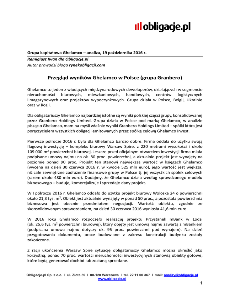 Grupa kapitałowa Ghelamco – analiza, 19 października 2016 r. Remigiusz Iwan dla Obligacje.pl Autor prowadzi bloga rynekobligacji.com Przegląd wyników Ghelamco w Polsce (grupa Granbero) Ghelamco to jeden z wiodących międzynarodowych deweloperów, działających w segmencie nieruchomości biurowych, mieszkaniowych, handlowych, centrów logistycznych i magazynowych oraz projektów wypoczynkowych. Grupa działa w Polsce, Belgii, Ukrainie oraz w Rosji. Dla obligatariuszy Ghelamco najbardziej istotne są wyniki polskiej części grupy, konsolidowanej przez Granbero Holdings Limited. Grupa działa w Polsce pod marką Ghelamco, w analizie pisząc o Ghelamco, mam na myśli właśnie wyniki Granbero Holdings Limited – spółki która jest poręczycielem wszystkich obligacji emitowanych przez spółkę celową Ghelamco Invest. Pierwsze półrocze 2016 r. było dla Ghelamco bardzo dobre. Firma oddała do użytku swoją flagową inwestycję – kompleks biurowy Warsaw Spire. z 220 metrami wysokości i około 109 000 m2 powierzchni biurowej. Jeszcze przed oficjalnym otwarciem inwestycji firma miała podpisane umowy najmu na ok. 80 proc. powierzchni, a aktualnie projekt jest wynajęty na poziomie ponad 90 proc. Projekt ten stanowi największą wartość w księgach Ghelamco (wycena na dzień 30 czerwca 2016 r. w kwocie 525 mln euro), jego wartość jest większa, niż całe zewnętrzne zadłużenie finansowe grupy w Polsce tj. jej wszystkich spółek celowych (razem około 480 mln euro). Dodajmy, że Ghelamco działa według sprawdzonego modelu biznesowego – buduje, komercjalizuje i sprzedaje dany projekt. W I półroczu 2016 r. Ghelamco oddało do użytku projekt biurowy Wołoska 24 o powierzchni około 21,3 tys. m2. Obiekt jest aktualnie wynajęty w ponad 50 proc., a pozostała powierzchnia biznesowa jest obecnie przedmiotem negocjacji. Wartość obiektu, zgodnie ze skonsolidowanym sprawozdaniem, na dzień 30 czerwca 2016 wyniosła 41,6 mln euro. W 2016 roku Ghelamco rozpoczęło realizację projektu Przystanek mBank w Łodzi (ok. 25,6 tys. m2 powierzchni biurowej), który objęty jest umową najmu zawartą z mBankiem (podpisana umowa najmu dotyczy ok. 95 proc. powierzchni pod wynajem). Na dzień przygotowania dokumentu, prace budowlane z zakresu konstrukcji budynku zostały zakończone. Z racji ukończenia Warsaw Spire sytuację obligatariuszy Ghelamco można określić jako korzystną, ponad 70 proc. wartości nieruchomości inwestycyjnych stanowią obiekty gotowe, które będą generować dochód lub zostaną sprzedane. Obligacje.pl Sp. z o.o. I ul. Złota 59 I 00-120 Warszawa I tel. 22 11 00 367 I mail: [email protected] www.obligacje.pl 1 Analiza wyników I półrocza 2016 W przypadku Ghelamco w zasadzie jest już tradycją, że wyniki generowane przez grupę to przede wszystkim efekt wzrostu wartości posiadanych projektów. Wraz z postępem budowy zwiększa się wartość godziwa danego obiektu, a kluczowa aktualizacja wartości ma miejsce po oddaniu obiektu do użytku. Nie inaczej jest i tym razem, oddanie do użytku Warsaw Spire spowodowało aktualizację w górę wartości obiektu i wygenerowało imponujący wynik dla grupy. Dodajmy, że do tej pory wyceny końcowe obiektów posiadanych przez Ghelamco, co do zasady były potwierdzane przy transakcjach sprzedaży obiektów. Dla pełnego obrazu podam, że przychody za pierwsze półrocze 2016 r. wyniosły 6,768 mln euro i dotyczyły głównie sprzedaży mieszkań (typu soft loft) w ramach projektu Woronicza Qbik, zlokalizowanego na warszawskim Mokotowie (4,5 mln euro), oraz przychodów z najmu (głównie powierzchni dostępnej w ramach projektu Warsaw Spire). Co jest pozytywne, to fakt, że w projekcie mieszkaniowym Woronicza Qbik sprzedanych zostało około 92 proc. dostępnych mieszkań typu soft loft. Na koniec czerwca zysk z aktualizacji wyceny nieruchomości wyniósł 125 mln euro, na co oczywiście największy wpływ miało oddanie do użytkowania obiektu Warsaw Spire. W efekcie zysk netto grupy za I półrocze 2016 wyniósł imponujące 114 mln euro. Zysk netto grupy Ghelamco (w tys. euro) Źródło: raporty finansowe emitenta. Obligacje.pl Sp. z o.o. I ul. Złota 59 I 00-120 Warszawa I tel. 22 11 00 367 I mail: [email protected] www.obligacje.pl 2 Warto dodać, że od momentu oddania do użytkowania Warsaw Spire, odsetki od kredytów, które wcześniej powiększały wartość inwestycji, księgowane są już w koszty, czyli pomniejszają zysk netto. Co do wyników, grupie Ghelamco nie można nic zarzucić, pozostaje sprawdzić, jak wygląda sytuacja bilansowa grupy. Analiza bilansu Tradycyjnie już zaczniemy od spojrzenia na aktywa pracujące grupy, za które uważam nieruchomości inwestycyjne i zapasy (czyli projekty biurowe, handlowe i mieszkaniowe). Nieruchomości inwestycyjne i zapasy Źródło: raporty finansowe emitenta. Największą część aktywów (60 proc.) stanowią nieruchomości inwestycyjne, których wartość wzrosła z poziomu 660 mln euro na koniec 2015 r. do 829 mln euro na koniec czerwca 2016 r. Było to głównie efektem nakładów poniesionych w okresie (49 mln euro) oraz korekty wartości godziwej (125 mln euro). Kolejne 4 proc. wartości aktywów stanowią środki pieniężne. Warto zauważyć, że Ghelamco niezmiennie utrzymuje wysoki stan środków finansowych (wszystkie kwoty prezentowane są w euro). Obligacje.pl Sp. z o.o. I ul. Złota 59 I 00-120 Warszawa I tel. 22 11 00 367 I mail: [email protected] www.obligacje.pl 3 Środki pieniężne i ich ekwiwalenty Źródło: raporty finansowe emitenta. Niestety, typową dla Ghelamco jest sytuacja, że sporą część aktywów stanowią te niepracujące, czyli pożyczki udzielone do podmiotów spoza polskiej części grupy Ghelamco. Nie jest to ulubiona przeze mnie sytuacja, gdy część środków funkcjonuje poza grupą, ale oddając sprawiedliwość, warto zauważyć, że: saldo netto pożyczek udzielonych i otrzymanych jest stabilne w ostatnich okr