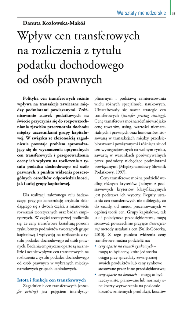 Warsztaty menedżerskie Danuta Kozłowska-Makóś Wpływ cen transferowych na rozliczenia z tytułu podatku dochodowego od osób prawnych Polityka cen transferowych różnie wpływa na transakcje zawierane między podmiotami powiązanymi. Zróżnicowanie stawek podatkowych na świecie przyczynia się do rozpowszechniania zjawiska przerzucania dochodu między uczestnikami grupy kapitałowej. W związku ze złożonością zagadnienia powstaje problem sprowadzający się do wyznaczenia optymalnych cen transferowych i przeprowadzenia oceny ich wpływu na rozliczenia z tytułu podatku dochodowego od osób prawnych, z punktu widzenia poszczególnych ośrodków odpowiedzialności, jak i całej grupy kapitałowej. Dla realizacji założonego celu badawczego przyjęto konstrukcję artykułu składającego się z dwóch części, a mianowicie rozważań teoretycznych oraz badań empirycznych. W części teoretycznej podkreśla się, że ceny transferowe kształtują poziom zysku brutto podmiotów tworzących grupę kapitałową i wpływają na rozliczenia z tytułu podatku dochodowego od osób prawnych. Badania empiryczne oparte są na analizie i ocenie wpływu cen transferowych na rozliczenia z tytułu podatku dochodowego od osób prawnych w wybranych międzynarodowych grupach kapitałowych. Istota i funkcje cen transferowych Zagadnienie cen transferowych (transfer pricing) jest pojęciem interdyscy- plinarnym i podstawą zainteresowania wielu różnych specjalności naukowych. Ukształtowały się nawet strategie cen transferowych (transfer pricing strategy). Cenę transferową można zdefiniować jako cenę towarów, usług, wartości niematerialnych i prawnych oraz honorariów, stosowaną w transakcjach między przedsiębiorstwami powiązanymi i różniącą się od cen wynegocjowanych na wolnym rynku, zawartą w warunkach porównywalnych przez podmioty niebędące podmiotami powiązanymi [Międzynarodowy Słownik Podatkowy, 1997]. Ceny transferowe można podzielić według różnych kryteriów. Jednym z podstawowych kryteriów klasyfikacyjnych jest podstawa ich wyceny. Reguły ustalania cen transferowych nie odbiegają, co do zasady, od metod prezentowanych w ogólnej teorii cen. Grupy kapitałowe, tak jak i pojedyncze przedsiębiorstwa, mogą stosować powszechnie przyjęte (teoretyczne) metody ustalania cen [Sulik-Górecka, 2010]. Z tego punktu widzenia ceny transferowe można podzielić na: • ceny oparte na cenach rynkowych – mogą to być ceny, które jednostka osiąga przy sprzedaży zewnętrznej swoich produktów lub ceny rynkowe stosowane przez inne przedsiębiorstwa; • ceny oparte na kosztach – mogą to być rzeczywiste, planowane lub normatywne koszty wytworzenia na poziomie kosztów zmiennych produkcji, kosztów 65 66 KWARTALNIK NAUK O PRZEDSIĘBIORSTWIE — 2016 / 4 pełnych lub ceny typu „koszt ... plus marża”; • ceny umowne (wynegocjowane) – kształtują się one w rezultacie negocjacji między samodzielnymi jednostkami; • ceny podwójne – ustalane na różnych poziomach dla sprzedającego i kupującego. Nie można ich zastosować w stosunku do dwóch samodzielnych podmiotów powiązanych kapitałowo [Sojak, 2001]. To, która z tych formuł ustalania ceny zostanie wybrana, zależy m.in. od jej wpływu na osiągniecie zgodności celów poszczególnych ośrodków odpowiedzialności i maksymalizację zysków całej grupy kapitałowej, czy też wpływu na mierniki oceny działalności poszczególnych podmiotów powiązanych [Sojak, 2003]. Ceny w danym czasie i w danym miejscu (rynku) nieustannie się zmieniają. Trudno byłoby więc mówić o sztywnej cenie jako parametrze obiektywnym, do którego można byłoby odnieść cenę (ceny) stosowaną przez daną spółkę. Nie oznacza to jednak, że cena transferowa może być ustalona w dowolnej wysokości. Wszystkie powinny odpowiadać następującym założeniom: • maksymalna cena transferowa nie powinna być wyższa od najniższej ceny rynkowej, za jaką jednostka kupująca może nabywać produkty lub usługi na rynku zewnętrznym, • minimalna cena transferowa nie powinna być niższa niż suma kosztów krańcowych produkcji jednostki sprzedającej, powiększonych o koszty utraconych korzyści [Sojak, 2003]. Granice ceny transferowej przedstawiono na rysunku 1. Każda cena transferowa ustalana w tak wyznaczonych granicach z ekonomicznego punktu widzenia jest uważana za właściwą, chociaż nie musi być ceną optymalną. Koszty krańcowe przez ekonomistów traktowane są jako koszty wyprodukowania dodatkowej jednostki produkcji. Wykorzystując kryterium podziału kosztów stosowane w rachunkowości zarządczej można stwierdzić, że są one sumą kosztów zmiennych i stałych. Poziom kosztów krańcowych zależy od stopnia zdolności produkcyjnych i najczęściej są to koszty zmienne w przypadku istnienia wolnych mocy produkcyjnych. W przypadku braku mocy produkcyjnych dochodzą do nich dodatkowe koszty stałe lub koszty utraconych korzyści (utracona marża wynikająca z zaniechania jednego działania na rzecz realizacji innego) [Sojak, 2003]. W obrocie gospodarczym stosunkowo często dochodzi do transakcji pomiędzy podmiotami powiązanymi, które dokonywane są na podstawie cen transferowych. Wyróżnić można trzy podstawowe funkcje cen transferowych: decyzyjna, oceniająco-kontrolna, dochodowa. W ramach pierwszej funkcji cena transferowa jest narzędziem służącym do podejmowania decyzji przez wyodrębnione ośrodki odpowiedzialności. W przypadku, gdy podmiot powiązany jest dostawcą dóbr i usług, cena transferowa wpływa na wybór kierunków sprzedaży na rzecz innych jednostek grupy kapitałowej. Natomiast w przypadku spółki-odbiorcy, cena determinuje wybór źródeł zaopatrzenia w dobra (usługi) wewnątrz grupy kapitałowej. Rysunek 1 Zakres wyboru ceny transferowej górny limit = najniższa cena uzyskana od zewnętrznego sprzedawcy Zakres wyboru ceny transferowej dolny limit = krańcowy