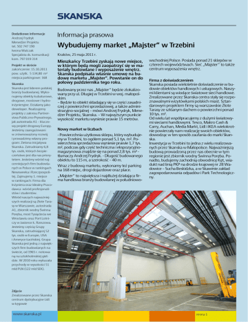 Dodatkowe informacje Andrzej Frydryk Menedżer Projektu tel. 502 747 190 Iwona Walczak Specjalista ds. komunikacji kom. 797 019 314 Projekt w skrócie zakończenie: 15.10.2011 pow. użytk. 5 134,80 m² miejsca parkingowe: 168 Skanska Skanska jest liderem polskiej branży budowlanej. Wykonujemy obiekty kubaturowe, drogowe, mostowe i hydroinżynieryjne. Działamy jako deweloper. Realizujemy projekty z zakresu Partnerstwa Publiczno-Prywatnego, jak autostrada A1 – kluczowy projekt drogowy Europy. Jesteśmy zaangażowani w zrównoważony rozwój i prowadzimy własny program: Zielona inicjatywa Skanska. Zatrudniamy 6,8 tys. osób, których bezpieczeństwo jest dla nas priorytetem. Jesteśmy wśród najcenniejszych firm budowlanych w Polsce w rankingach Newsweeka i Rzeczpospolitej. Zajmujemy 1. miejsce w rankingach: Firma dla Inżyniera oraz Idealny Pracodawca wśród profesjonalistów i studentów. Wśród naszych najważniejszych realizacji są Złote Tarasy w Warszawie, autostrada A1, zbiornik wodny Świnna Poręba, most Tysiąclecia we Wrocławiu oraz Port Lotniczy w Jasionce k. Rzeszowa. Jesteśmy częścią Grupy Skanska, zatrudniającej 52 tys. osób w Europie, USA i Ameryce Łacińskiej. Grupa Skanska jest jedną z największych firm budowlanych na świecie, od 1965 r. notowaną na sztokholmskiej giełdzie. W 2010 roku wykazała przychody w wysokości 51 mld PLN (122 mld SEK). Informacja prasowa Wybudujemy market „Majster” w Trzebini Kraków, 25 maja 2011 r. Mieszkańcy Trzebini zyskają nowe miejsce, w którym będą mogli zaopatrzyć się w materiały budowlane i wyposażenie wnętrz. Skanska podpisała właśnie umowę na budowę marketu „Majster”. Powstanie on do połowy października tego roku. Budowany przez nas „Majster” będzie zlokalizowany przy ul. Długiej w Trzebini w woj. małopolskim. – Będzie to obiekt składający się w części zasadniczej z powierzchni sprzedażowej, a także administracyjno-socjalnej – mówi Andrzej Frydryk, Menedżer Projektu, Skanska. – W najwyższym punkcie wysokość marketu wyniesie prawie 15 metrów. Nowy market w liczbach - Powierzchnia użytkowa sklepu, który wybudujemy w Trzebini, to ogółem ponad 5,1 tys. m². Powierzchnia sprzedażowa wyniesie prawie 1,7 tys. m², podczas gdy część techniczna i ekspozycyjnomagazynowa znajdzie się na ponad 2,8 tys. m² tłumaczy Andrzej Frydryk. - Długość budowanego obiektu to 115 m, a szerokość – 40 m. Wraz z budową marketu, wykonamy też parking na 168 miejsc, drogi dojazdowe oraz place. „Majster” to największa i najdłużej działająca firma handlowa branży budowlanej w południowo- wschodniej Polsce. Posiada ponad 21 sklepów w czterech województwach. Sieć „Majster” to także centrum wyposażenia wnętrz. Firma z doświadczeniem Skanska posiada wieloletnie doświadczenie w budowie obiektów handlowych i usługowych. Naszymi klientami są wiodące światowe sieci handlowe. Zrealizowane przez Skanska centra stały się rozpoznawalnymi wizytówkami polskich miast. Sztandarowym projektem firmy są warszawskie Złote Tarasy ze szklanym dachem o powierzchni ponad 10 tys. m². Od wielu lat współpracujemy z dużymi światowymi sieciami handlowymi. Tesco, Makro Cash & Carry, Auchan, Media Markt, Lidl i IKEA wielokrotnie powierzały nam realizację swoich obiektów, dowodząc w ten sposób zaufania do marki Skanska. Inwestycja w Trzebini to jedna z wielu realizowanych przez Skanska w Małopolsce. Najważniejszą budową prowadzoną przez nas obecnie w tym regionie jest zbiornik wodny Świnna Poręba. Ponadto, budujemy zachodnią obwodnicę Kęt, wiadukt nad linią PKP na drodze krajowej nr 28 Wadowice – Sucha Beskidzka, a w Skawinie zakład zagospodarowania odpadów i Park Technologiczny. Zdjęcie Zrealizowane przez Skanska centrum dystrybucyjne Lidl w Łęgowie www.skanska.pl strona 1