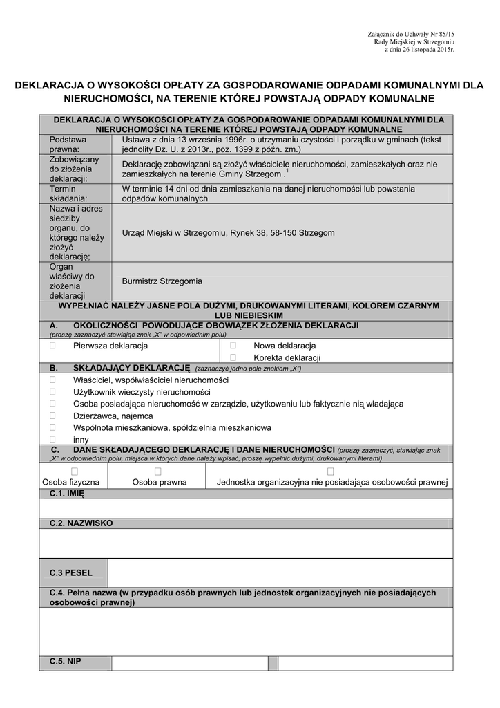 Załącznik do Uchwały Nr 85/15 Rady Miejskiej w Strzegomiu z dnia 26 listopada 2015r. DEKLARACJA O WYSOKOŚCI OPŁATY ZA GOSPODAROWANIE ODPADAMI KOMUNALNYMI DLA NIERUCHOMOŚCI, NA TERENIE KTÓREJ POWSTAJĄ ODPADY KOMUNALNE DEKLARACJA O WYSOKOŚCI OPŁATY ZA GOSPODAROWANIE ODPADAMI KOMUNALNYMI DLA NIERUCHOMOŚCI NA TERENIE KTÓREJ POWSTAJĄ ODPADY KOMUNALNE Podstawa Ustawa z dnia 13 września 1996r. o utrzymaniu czystości i porządku w gminach (tekst prawna: jednolity Dz. U. z 2013r., poz. 1399 z późn. zm.) Zobowiązany Deklarację zobowiązani są złożyć właściciele nieruchomości, zamieszkałych oraz nie do złożenia zamieszkałych na terenie Gminy Strzegom .1 deklaracji: Termin W terminie 14 dni od dnia zamieszkania na danej nieruchomości lub powstania składania: odpadów komunalnych Nazwa i adres siedziby organu, do Urząd Miejski w Strzegomiu, Rynek 38, 58-150 Strzegom którego należy złożyć deklarację; Organ właściwy do Burmistrz Strzegomia złożenia deklaracji WYPEŁNIAĆ NALEŻY JASNE POLA DUŻYMI, DRUKOWANYMI LITERAMI, KOLOREM CZARNYM LUB NIEBIESKIM A. OKOLICZNOŚCI POWODUJĄCE OBOWIĄZEK ZŁOŻENIA DEKLARACJI (proszę zaznaczyć stawiając znak „X” w odpowiednim polu) Pierwsza deklaracja B. C. Nowa deklaracja Korekta deklaracji SKŁADAJĄCY DEKLARACJĘ (zaznaczyć jedno pole znakiem „X”) Właściciel, współwłaściciel nieruchomości Użytkownik wieczysty nieruchomości Osoba posiadająca nieruchomość w zarządzie, użytkowaniu lub faktycznie nią władająca Dzierżawca, najemca Wspólnota mieszkaniowa, spółdzielnia mieszkaniowa inny DANE SKŁADAJĄCEGO DEKLARACJĘ I DANE NIERUCHOMOŚCI (proszę zaznaczyć, stawiając znak „X” w odpowiednim polu, miejsca w których dane należy wpisać, proszę wypełnić dużymi, drukowanymi literami) Osoba fizyczna C.1. IMIĘ Osoba prawna Jednostka organizacyjna nie posiadająca osobowości prawnej C.2. NAZWISKO C.3 PESEL C.4. Pełna nazwa (w przypadku osób prawnych lub jednostek organizacyjnych nie posiadających osobowości prawnej) C.5. NIP C.6. Numer telefonu C.7 E-mail C.8. ADRES NIERUCHOMOŚCI, KTÓREJ DOTYCZY DEKLARACJA Gmina Miejscowość Kod pocztowy Poczta Ulica Nr lokalu C.9. ADRES ZAMIESZKANIA (LUB ADRES SIEDZIBY SKŁADAJĄCEGO DEKLARACJĘ) Nr domu Adres zamieszkania składającego deklarację (lub adres siedziby składającego deklarację) jest taki sam jak adres nieruchomości, której dotyczy deklaracja (proszę zaznaczyć znak „X” i pominąć pozostałą część punktu C.8.) Gmina Miejscowość Kod pocztowy Poczta Ulica Nr lokalu Nr domu D. SPOSÓB ZBIERANIA ODPADÓW Odpady komunalne będą zbierane w sposób selektywny zgodnie z regulaminem utrzymania czystości i porządku na terenie Gminy Strzegom 2 Odpady komunalne nie będą zbierane w sposób selektywny 3 E. Opłata za gospodarowanie odpadami komunalnymi – nieruchomość zamieszkała 3 Liczba mieszkańców zamieszkujących nieruchomość wskazaną w części C8 Liczba faktycznie zamieszkałych osób Miesięczna stawka opłaty określona w Uchwale Rady Miejskiej w sprawie wyboru metody ustalenia opłaty za gospodarowanie odpadami komunalnymi oraz ustalenia wysokości tej opłaty 1. 2 selektywnie nieselektywnie Wysokość miesięcznej opłaty 3. ilość osób ogółem: ……………. w tym: ilość osób w gospodarstwie domowym liczącym: - od 1 do 4 osób ………….. ……………….zł - od 5 do 7 osób…………… ……………….zł - powyżej 7 osób…………… ...……………..zł Ilość osób…………. …………….zł ………….zł Prowadzenie kompostownika na nieruchomości (proszę zaznaczyć, stawiając znak „X” w odpowiednim polu) Deklaruję, że na terenie nieruchomości, której dotyczy deklaracja, prowadzić będę kompostownik Deklaruję, że na terenie nieruchomości, której dotyczy deklaracja, nie będę prowadzić kompostownika, a odpady zielone zbierać będą w worku i przekazywać do odbioru F. Opłata za gospodarowanie odpadami komunalnymi – nieruchomość niezamieszkała 4 Pojemność pojemnika Stawka opłaty Liczba Wysokość Odpady segregowane Odpady niesegregowane pojemników miesięcznej opłaty 120 l 240 l 1100 l 7000 l Razem miesięczna opłata: G. Opłata za gospodarowanie odpadami komunalnymi – nieruchomość mieszana – w części zamieszkała a w części nie zamieszkała 4 Miesięczna opłata części nieruchomości zamieszkałej określona w pkt E Miesięczna opłata części nie zamieszkałej nieruchomości określona w pkt F Wysokość miesięcznej opłaty suma E+F Wysokość opłaty za gospodarowanie odpadami komunalnymi (opłata do zapłaty) obliczona samodzielnie przez właściciela nieruchomości, zgodnie ze złożoną deklaracją, ponoszona będzie zgodnie z uchwałą Rady Miejskiej w Strzegomiu w sprawie określenia terminu, częstotliwości i trybu uiszczania opłaty za gospodarowanie odpadami komunalnymi. H. DEKLARACJA ZAPOTRZEBOWANIA NA POJEMNIKI I WORKI DLA POSZCZEGÓLNYCH RODZAJÓW ODPADÓW: 5 H.1. ZABUDOWA JEDNORODZINNA Deklaruję następującą ilość pojemników przeznaczonych do zbierania zmieszanych odpadów komunalnych 60l Deklaruję następującą ilość pojemników (worków) przeznaczonych do zbierania odpadów surowcowych (suchych) 60l 120l 120l 240l 240l Deklaruję następującą ilość pojemników (worków) przeznaczonych do zbierania odpadów ulegających biodegradacji H.2. ZABUDOWA WIELORODZINNA Deklaruję następującą ilość pojemników przeznaczonych do zbierania zmieszanych odpadów komunalnych 120l Deklaruję następującą ilość pojemników przeznaczonych do zbierania odpadów surowcowych (suchych) 240l 120l 240l 1100l 1100l 7000l 7000l I. PRZYCZYNY WPROWADZENIA ZMIAN DANYCH W DEKLARACJI: J. PODPIS SKŁADAJĄCEGO DEKLARACJĘ Data wypełnienia deklaracji Podpis składającego deklarację POUCZENIE W przypadku nie wpłacenia w określonych ustawowo terminach miesięcznej opłaty lub wpłacenia jej w niepełnej wyso