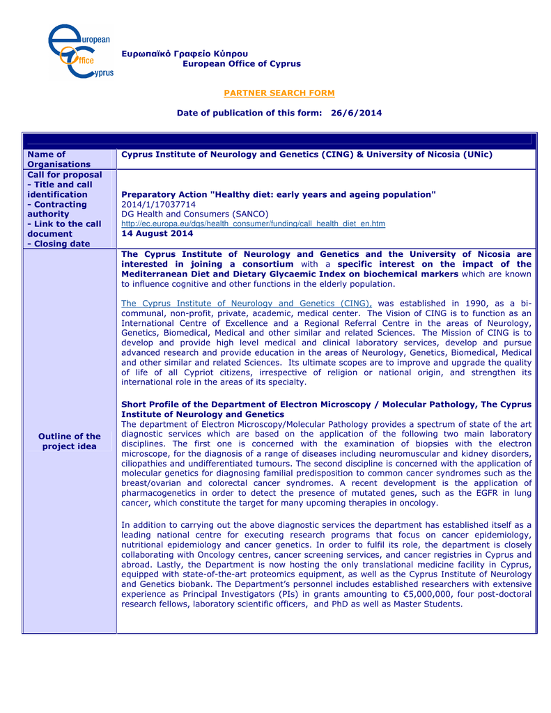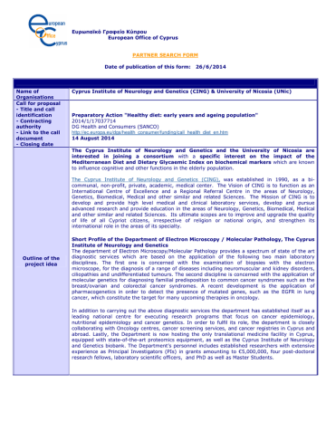 Ευρωπαϊκό Γραφείο Κύπρου European Office of Cyprus PARTNER SEARCH FORM Date of publication of this form: Name of Organisations Call for proposal - Title and call identification - Contracting authority - Link to the call document - Closing date 26/6/2014 Cyprus Institute of Neurology and Genetics (CING) & University of Nicosia (UNic) Preparatory Action "Healthy diet: early years and ageing population" 2014/1/17037714 DG Health and Consumers (SANCO) http://ec.europa.eu/dgs/health_consumer/funding/call_health_diet_en.htm 14 August 2014 The Cyprus Institute of Neurology and Genetics and the University of Nicosia are interested in joining a consortium with a specific interest on the impact of the Mediterranean Diet and Dietary Glycaemic Index on biochemical markers which are known to influence cognitive and other functions in the elderly population. The Cyprus Institute of Neurology and Genetics (CING), was established in 1990, as a bicommunal, non-profit, private, academic, medical center. The Vision of CING is to function as an International Centre of Excellence and a Regional Referral Centre in the areas of Neurology, Genetics, Biomedical, Medical and other similar and related Sciences. The Mission of CING is to develop and provide high level medical and clinical laboratory services, develop and pursue advanced research and provide education in the areas of Neurology, Genetics, Biomedical, Medical and other similar and related Sciences. Its ultimate scopes are to improve and upgrade the quality of life of all Cypriot citizens, irrespective of religion or national origin, and strengthen its international role in the areas of its specialty. Outline of the project idea Short Profile of the Department of Electron Microscopy / Molecular Pathology, The Cyprus Institute of Neurology and Genetics The department of Electron Microscopy/Molecular Pathology provides a spectrum of state of the art diagnostic services which are based on the application of the following two main laboratory disciplines. The first one is concerned with the examination of biopsies with the electron microscope, for the diagnosis of a range of diseases including neuromuscular and kidney disorders, ciliopathies and undifferentiated tumours. The second discipline is concerned with the application of molecular genetics for diagnosing familial predisposition to common cancer syndromes such as the breast/ovarian and colorectal cancer syndromes. A recent development is the application of pharmacogenetics in order to detect the presence of mutated genes, such as the EGFR in lung cancer, which constitute the target for many upcoming therapies in oncology. In addition to carrying out the above diagnostic services the department has established itself as a leading national centre for executing research programs that focus on cancer epidemiology, nutritional epidemiology and cancer genetics. In order to fulfil its role, the department is closely collaborating with Oncology centres, cancer screening services, and cancer registries in Cyprus and abroad. Lastly, the Department is now hosting the only translational medicine facility in Cyprus, equipped with state-of-the-art proteomics equipment, as well as the Cyprus Institute of Neurology and Genetics biobank. The Department’s personnel includes established researchers with extensive experience as Principal Investigators (PIs) in grants amounting to €5,000,000, four post-doctoral research fellows, laboratory scientific officers, and PhD as well as Master Students. The University of Nicosia, the largest private university in Cyprus, aspires to be a leading contributor to excellence in education and research. Over the years, it has adopted a dynamic research strategy, with an aim of reaching out to all its stakeholders, to work with them in developing ideas for academic and applied research, to better the community, country and wider region. The University is currently involved in funded projects at the national, EU and international level. Since 2007, UNic faculty and researchers have been actively involved in projects, in a range of fields, funded from national, EU and international grant programmes, with a total budget of over thirty two million Euros. Nutrition and dietetics researchers are interested in nutrition for disease prevention and specifically nutrition education and carbohydrate manipulation in relation to cognitive function, heart disease and obesity prevention. Foreseen duration of the project 18 months Consortium Position within consortium √ Join an existing consortium √ As a partner Role √ Public Body √ SME/SME association Partner Sought √ Non profit Organization √ Regional Body Agency Answers expected before As soon as possible Contact Persons - Name, Surname: - E-mail: Dr Christiana DEMETRIOU [email protected] Dr Elena PHILIPPOU [email protected] √ Other private actor