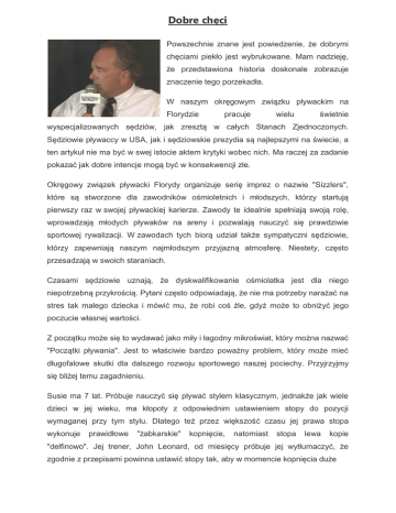 Dobre chęci Powszechnie znane jest powiedzenie, że dobrymi chęciami piekło jest wybrukowane. Mam nadzieję, że przedstawiona historia doskonale zobrazuje znaczenie tego porzekadła. W naszym okręgowym związku pływackim na Florydzie pracuje wielu świetnie wyspecjalizowanych sędziów, jak zresztą w całych Stanach Zjednoczonych. Sędziowie pływaccy w USA, jak i sędziowskie prezydia są najlepszymi na świecie, a ten artykuł nie ma być w swej istocie aktem krytyki wobec nich. Ma raczej za zadanie pokazać jak dobre intencje mogą być w konsekwencji złe. Okręgowy związek pływacki Florydy organizuje serię imprez o nazwie "Sizzlers", które są stworzone dla zawodników ośmioletnich i młodszych, którzy startują pierwszy raz w swojej pływackiej karierze. Zawody te idealnie spełniają swoją rolę, wprowadzają młodych pływaków na areny i pozwalają nauczyć się prawdziwie sportowej rywalizacji. W zawodach tych biorą udział także sympatyczni sędziowie, którzy zapewniają naszym najmłodszym przyjazną atmosferę. Niestety, często przesadzają w swoich staraniach. Czasami sędziowie uznają, że dyskwalifikowanie ośmiolatka jest dla niego niepotrzebną przykrością. Pytani często odpowiadają, że nie ma potrzeby narażać na stres tak małego dziecka i mówić mu, że robi coś źle, gdyż może to obniżyć jego poczucie własnej wartości. Z początku może się to wydawać jako miły i łagodny mikroświat, który można nazwać "Początki pływania". Jest to właściwie bardzo poważny problem, który może mieć długofalowe skutki dla dalszego rozwoju sportowego naszej pociechy. Przyjrzyjmy się bliżej temu zagadnieniu. Susie ma 7 lat. Próbuje nauczyć się pływać stylem klasycznym, jednakże jak wiele dzieci w jej wieku, ma kłopoty z odpowiednim ustawieniem stopy do pozycji wymaganej przy tym stylu. Dlatego też przez większość czasu jej prawa stopa wykonuje prawidłowe "żabkarskie" kopnięcie, natomiast stopa lewa kopie "delfinowo". Jej trener, John Leonard, od miesięcy próbuje jej wytłumaczyć, że zgodnie z przepisami powinna ustawić stopy tak, aby w momencie kopnięcia duże palce obu stóp ustawione były "na zewnątrz", jednak Susie nie widzi ani nie czuje różnicy. Nie widzi jej także Mama Suzie. Kilka miesięcy później mama Susie zapisuje ją na zawody z serii Sizzlers w stylu klasycznym. Jest to ulubiony styl Susie, a ponieważ jej mama nie widzi szczególnej różnicy między techniką zgodną z przepisami, a tą, która jest niedopuszczalna, nie przejmuje się zbytnio wcześniejszymi słowami trenera. Szkoleniowiec natomiast, dowiedziawszy się, że Susie wystartuje w stylu klasycznym, nie uznał za konieczne ingerowanie w decyzji mamy. Uznał, że kiedy sędzia zdyskwalifikuje młodą pływaczkę, obie dostaną nauczkę. W tym momencie bystry czytelnik może już przewidzieć do czego zmierza ta historia. Dokładnie tak - Susie trafiła na miłego sędziego, który nie zdyskwalifikował jej pomimo ewidentnych błędów technicznych. Po zawodach dziewczynka podeszła do trenera, żeby pochwalić się wygraną w mitingu niebieską wstążką i kuponem na 6 puszek coca-coli. Jeżeli w takim momencie trener powiedziałby: "wiesz, Susie, wszystko ładnie, pięknie, ale płynęłaś niezgodnie z przepisami, nie powinnaś jedną nogą robić ruchu delfinowego", dziewczynka mogłaby, słusznie zresztą, odpowiedzieć: "Oj, trenerze, nie zostałam zdyskwalifikowana, więc chyba jednak wszystko jest dobrze". A najgorsze w tym jest to, że odpowiedni moment na naukę został zaprzepaszczony, gdyż pływaczka dostała sygnał, że to, co robi, robi prawidłowo, nie ma się więc czego obawiać. I przez to może już nigdy nie nauczyć się pływać prawidłowo, gdyż pewnych podstawowych ruchów uczymy się w bardzo młodym wieku, a potem nauczone ruchy wchodzą w nawyk. A dziewczynce już weszło w nawyk delfinowe kopnięcie lewej stopy przy stylu klasycznym. Mylne przekonanie o prawidłowości tego ruchu będzie trwało do czasu, gdy Susie skończy 9 lat i wystartuje w "real USAS meet" - zawodach dla nieco starszych zawodników, gdzie w końcu zostanie zdyskwalifikowana za nieprzestrzeganie przepisów. Nasze dobre chęci często mają fatalny skutek dla zawodników. Oczywiście na początku może się to wydawać nieszkodliwe, jednak jest to działanie długofalowe, które może się odbić w późniejszych etapach kariery. Pobłażanie sędziów jest oparte na dwóch błędnych przesłankach. Pierwsza - dzieci nie muszą jeszcze uczyć się prawidłowego wykonywania pewnych czynności, a "prawie dobrze" oznacza dobrze. Każdy doświadczony trener powie Wam, że taki sposób myślenia jest wybitnie szkodliwy dla rozwoju młodego sportowca. Druga przesłanka zakłada, że dziecięca psychika jest tak wrażliwa, że dyskwalifikacja i trenerskie pouczenie może spowodować jakiś uraz w umyśle młodego pływaka. Jest to nonsens. Dzieci powinny usłyszeć szczerą prawdę na temat swojego występu. Trener i rodzice muszą mu wyjaśnić wszystko jak najprościej się da, aby zrozumiało co robi źle i jak może te błędy poprawić. Nasze dzieci są na tyle silne, że dadzą sobie radę z pewnymi rozczarowaniami, zwłaszcza takimi, dzięki którym pomagają im zrozumieć, że to one same muszą kontrolować swoje działania. Dyskwalifikuj, kiedy trzeba. Wykonuj dobrze pracę, która została Ci powierzona jako sędziemu. Ufamy Ci, wierzymy Ci, potrzebujemy Cię. Razem zbudujemy wielką silną drużynę. Tytuł oryginału: Good Intentions Autor: John Leonard Tłumaczenie: Michał Stachowiak