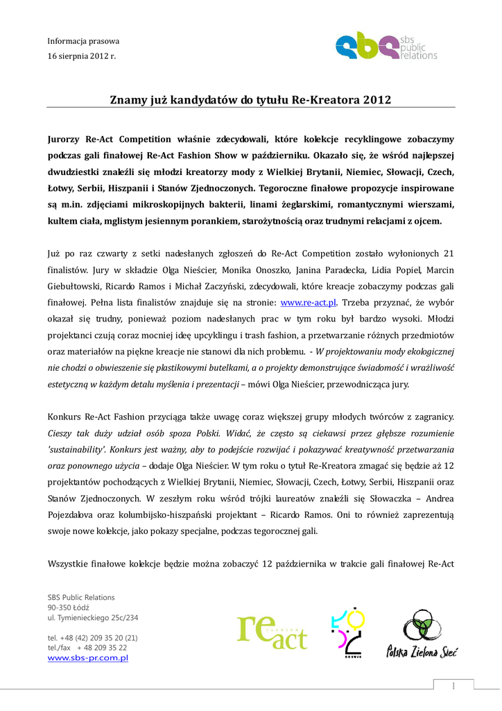 Informacja prasowa 16 sierpnia 2012 r. Znamy już kandydatów do tytułu Re-Kreatora 2012 Jurorzy Re-Act Competition właśnie zdecydowali, które kolekcje recyklingowe zobaczymy podczas gali finałowej Re-Act Fashion Show w październiku. Okazało się, że wśród najlepszej dwudziestki znaleźli się młodzi kreatorzy mody z Wielkiej Brytanii, Niemiec, Słowacji, Czech, Łotwy, Serbii, Hiszpanii i Stanów Zjednoczonych. Tegoroczne finałowe propozycje inspirowane są m.in. zdjęciami mikroskopijnych bakterii, linami żeglarskimi, romantycznymi wierszami, kultem ciała, mglistym jesiennym porankiem, starożytnością oraz trudnymi relacjami z ojcem. Już po raz czwarty z setki nadesłanych zgłoszeń do Re-Act Competition zostało wyłonionych 21 finalistów. Jury w składzie Olga Nieścier, Monika Onoszko, Janina Paradecka, Lidia Popiel, Marcin Giebułtowski, Ricardo Ramos i Michał Zaczyński, zdecydowali, które kreacje zobaczymy podczas gali finałowej. Pełna lista finalistów znajduje się na stronie: www.re-act.pl. Trzeba przyznać, że wybór okazał się trudny, ponieważ poziom nadesłanych prac w tym roku był bardzo wysoki. Młodzi projektanci czują coraz mocniej ideę upcyklingu i trash fashion, a przetwarzanie różnych przedmiotów oraz materiałów na piękne kreacje nie stanowi dla nich problemu. - W projektowaniu mody ekologicznej nie chodzi o obwieszenie się plastikowymi butelkami, a o projekty demonstrujące świadomość i wrażliwość estetyczną w każdym detalu myślenia i prezentacji – mówi Olga Nieścier, przewodnicząca jury. Konkurs Re-Act Fashion przyciąga także uwagę coraz większej grupy młodych twórców z zagranicy. Cieszy tak duży udział osób spoza Polski. Widać, że często są ciekawsi przez głębsze rozumienie 'sustainability'. Konkurs jest ważny, aby to podejście rozwijać i pokazywać kreatywność przetwarzania oraz ponownego użycia – dodaje Olga Nieścier. W tym roku o tytuł Re-Kreatora zmagać się będzie aż 12 projektantów pochodzących z Wielkiej Brytanii, Niemiec, Słowacji, Czech, Łotwy, Serbii, Hiszpanii oraz Stanów Zjednoczonych. W zeszłym roku wśród trójki laureatów znaleźli się Słowaczka – Andrea Pojezdalova oraz kolumbijsko-hiszpański projektant – Ricardo Ramos. Oni to również zaprezentują swoje nowe kolekcje, jako pokazy specjalne, podczas tegorocznej gali. Wszystkie finałowe kolekcje będzie można zobaczyć 12 października w trakcie gali finałowej Re-Act SBS Public Relations 90-350 Łódź ul. Tymienieckiego 25c/234 tel. +48 (42) 209 35 20 (21) tel./fax + 48 209 35 22 www.sbs-pr.com.pl 1 Informacja prasowa 16 sierpnia 2012 r. Fashion Show w Łodzi w Hali Międzynarodowych Targów Łódzkich. Przez kolejne dwa dni osoby zainteresowane recyklingową i odpowiedzialną modą będą mogły odwiedzić Targi odpowiedzialnej mody WearFair organizowane przez Polską Zieloną Sieć. Będzie można na nich kupić odzież wykonaną w sposób ekologiczny i z poszanowaniem praw człowieka. Targom towarzyszyć będą m.in. warsztaty szycia, wymienialnia ubrań, pokaz filmów, kącik eko-malucha oraz debata międzynarodowa z udziałem ekspertów. *** W tym samym czasie i miejscu odbędą się Targi Naturalnej Żywności NATURA FOOD i Targi Ekologicznego Stylu Życia beECO organizowane przez Międzynarodowe Targi Łódzkie Spółka Targowa. Podczas imprez będzie można zapoznać się z szeroką ofertą produktów ekologicznych, dowiedzieć się, jak wybierać wytworzoną etycznie oraz ekologicznie żywność, ubrania, kosmetyki, zabawki, jak kupować z głową i żyć ekologicznie. Nie zabraknie atrakcji – imprezom towarzyszyć będą liczne debaty, spotkania, pokazy filmów i warsztaty związane z tematyką zdrowego odżywiania, Fair Trade, recyklingu i upcyklingu. Gośćmi specjalnymi będą: Reni Jusis, Grzegorz Łapanowski, Wojciech Modest Amaro. SBS Public Relations 90-350 Łódź ul. Tymienieckiego 25c/234 tel. +48 (42) 209 35 20 (21) tel./fax + 48 209 35 22 www.sbs-pr.com.pl 2