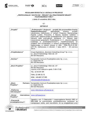 „Profesjonalni i skuteczni - projekt dla pracowników branży telekomunikacyjnej” REGULAMIN REKRUTACJI I UDZIAŁU W PROJEKCIE „PROFESJONALNI I SKUTECZNI – PROJEKT DLA PRACOWNIKÓW BRANŻY TELEKOMUNIKACYJNEJ” z dnia 21 września 2012 roku §1 DEFINICJE „Projekt” „Profesjonalni i skuteczni - projekt dla pracowników branży telekomunikacyjnej” ogólnopolski otwarty projekt szkoleniowy realizowany w ramach Programu Operacyjnego Kapitał Ludzki, Priorytetu II Rozwój zasobów ludzkich i potencjału adaptacyjnego przedsiębiorstw oraz poprawa stanu zdrowia osób pracujących (Działanie 2.1. Rozwój kadr nowoczesnej gospodarki, Poddziałanie 2.1.1. „Rozwój kapitału ludzkiego w przedsiębiorstwach”), współfinansowany ze środków Unii Europejskiej w ramach Europejskiego Funduszu Społecznego, w ramach umowy nr UDA – POKL.02.01.01-00A77/10, realizowany w okresie: 1 lipca 2011r. – 30 czerwca 2013r. „Projektodawca” Grupa Kapitałowa „Business Consulting Group” Sp. z o.o. ul. Jana III Sobieskiego 102A lok. U7 00-764 Warszawa „Partner” Europejskie Centrum Przedsiębiorczości Sp. z o.o. ul. Kopernika 34 00-336 Warszawa „Biuro Projektu” ul. Jana III Sobieskiego 102A lok. U7 00-764 Warszawa czynne w dni robocze w godz. 9.00-17.00 TEL: 22 55 09 109 FAKS: 22 696 52 72 KOM: +48 600 317 095 [email protected] „Biuro Projektu” Partnera Europejskie Centrum Przedsiębiorczości Sp. z o.o. ul. Kopernika 34 00-336 Warszawa „Platforma rekrutacyjna” „Strona Projektu” www.rekrutacja.cyfryzacja.eu internetowa www.cyfryzacja.eu „Pracownik przedsiębiorstwa”/ Zgodnie z art. 5 Załącznika 1 rozporządzenia Komisji (WE) nr 800/2008 za pracowników przedsiębiorstwa uznawane są następujące osoby, pod warunkiem, że są uwzględniane przy „Profesjonalni i skuteczni - projekt dla pracowników branży telekomunikacyjnej” „Kandydat”/ „Uczestnik” obliczaniu progu zatrudnienia dla ustalania statusu przedsiębiorcy (mikro, mały lub średni przedsiębiorca): pracownicy zatrudnieni na podstawie umowy o pracę właściciele-kierownicy oraz partnerzy (wspólnicy) prowadzący regularną działalność w przedsiębiorstwie i czerpiący z niego korzyści finansowe, o ile nie można ich zaliczyć do przedsiębiorców. „Samozatrudniony” osoba fizyczna prowadząca zatrudniająca pracowników działalność gospodarczą nie „Mikroprzedsiebiorstwo” przedsiębiorstwo zatrudniające do 9 pracowników, którego roczny obrót oraz/lub całkowity bilans roczny nie przekracza 2 milionów euro. Przedsiębiorstwo spełnia kryteria określone w kwalifikatorze dostępnym na stronie Polskiej Agencji Rozwoju Przedsiębiorczości: http://www.parp.gov.pl/index/index/1408. „Małe przedsiębiorstwo” przedsiębiorstwo zatrudniające od 10 do 49 pracowników, którego roczny obrót oraz/lub całkowity bilans roczny nie przekracza 10 milionów euro. Przedsiębiorstwo spełnia kryteria określone w kwalifikatorze dostępnym na stronie Polskiej Agencji Rozwoju Przedsiębiorczości: http://www.parp.gov.pl/index/index/1408 „Średnie przedsiębiorstwo” przedsiębiorstwo zatrudniające od 50 do 249 pracowników, którego roczny obrót nie przekracza 50 mln euro oraz/lub całkowity bilans roczny nie przekracza 43 milionów euro. Przedsiębiorstwo spełnia kryteria określone w kwalifikatorze dostępnym na stronie Polskiej Agencji Rozwoju Przedsiębiorczości: http://www.parp.gov.pl/index/index/1408 „Próg zatrudnienia” liczba „rocznych jednostek roboczych” (RJR) – liczba pracowników zatrudnionych na pełnych etatach w obrębie danego przedsiębiorstwa lub w jego imieniu w ciągu całego roku referencyjnego, który jest brany pod uwagę. Praca osób, które nie przepracowały pełnego roku, które pracowały w niepełnym wymiarze godzin lub pracowników sezonowych, jest obliczana jako część ułamkowa RJR. Do osób zatrudnionych zalicza się: pracowników; osoby pracujące dla przedsiębiorstwa, podlegające mu i uważane za pracowników na mocy prawa krajowego; właścicieli-kierowników; partnerów prowadzących regularną działalność w przedsiębiorstwie i osiągających z niego korzyści finansowe. „Osoby z osoby, które ukończyły: wykształceniem średnim technikum i zdały egzamin techniczny lub technicznym” ukończyły szkołę zawodową i technikum uzupełniające lub ukończyły liceum i technikum uzupełniające, w obszarze zgodnym z profilem technicznym: architektura i urbanistyka, automatyka i robotyka, biocybernetyka „Profesjonalni i skuteczni - projekt dla pracowników branży telekomunikacyjnej” i inżynieria biomedyczna, biotechnologia, budowa i eksploatacja maszyn, budownictwo, elektronika, elektrotechnika, energetyka, geodezja i kartografia, górnictwo i geologia inżynierska, informatyka, inżynieria chemiczna, inżynieria materiałowa, inżynieria produkcji, inżynieria środowiska, mechanika, metalurgia, technologia chemiczna, telekomunikacja, transport, włókiennictwo. „Osoby z osoby, które ukończyły studia (co najmniej dzienne, zaoczne wykształceniem lub podyplomowe) i otrzymały dyplom na jednym z kierunków: wyższym technicznym” architektura i urbanistyka, automatyka i robotyka, biocybernetyka i inżynieria biomedyczna, biotechnologia, budowa i eksploatacja maszyn, budownictwo, elektronika, elektrotechnika, energetyka, geodezja i kartografia, górnictwo i geologia inżynierska, informatyka, inżynieria chemiczna, inżynieria materiałowa, inżynieria produkcji, inżynieria środowiska, mechanika, metalurgia, technologia chemiczna, telekomunikacja, transport, włókiennictwo. „dokumenty aplikacyjne” Zbiór dokumentów jakie ma dostarczyć do Biura Projektu przedsiębiorstwo i jego pracownik/pracownicy lub osoba samozatrudniona: 1. Formularz zgłoszeniowy do projektu (wzór projektowy), 2. Umowa szkoleniowa (wzór projektowy) z załącznikami: Kwestionariusz osobowy uczestnika Projektu (wzór projektowy), Dek
