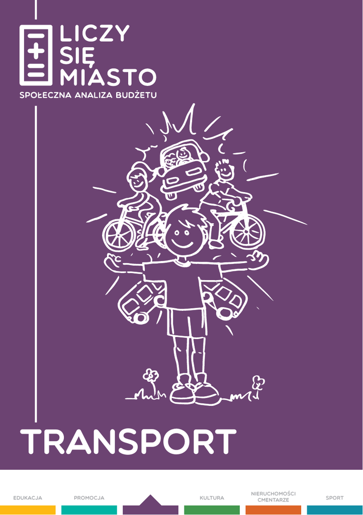 TRANSPORT edukacja promocja kultura nieruchomości cmentarze sport Autor: Dariusz Mencel Korekta: Anna Tabaka, Piotr Bocianowski Konsultacja merytoryczna: Ewelina Dudek, Urząd Miejski w Kaliszu Rysunki: Anekh Linkowska Publikacja powstała w ramach programu Obywatele dla Demokracji, finansowanego z Funduszu EOG. Publikacja jest realizowana w partnerskiej współpracy Kaliskiej Inicjatywy Miejskiej i Miasta Kalisza. Prawa autorskie Publikacja i projekt „Liczy się miasto” są objęte licencją Creative Commons 3.0 Polska: uznanie autorstwa (pełna treść licencji: http://creativecommons.org/ licenses/by/3.0/pl). Oznacza to, że możesz kopiować, rozpowszechniać, odtwarzać i użytkować w sposób komercyjny materiały autorstwa „Liczy się miasto”, w tym niniejszą publikację. Możesz również tworzyć utwory zależne. Jedynym warunkiem jest podanie źródła tych materiałów, czyli: www.liczysiemiasto.pl. 2 Z budżetem miasta jest jak z drobnym drukiem w umowach — wszyscy wiemy, że ta część jest najważniejsza, ale niewielu ją czyta. Nic dziwnego. Samo znalezienie tekstu budżetowej uchwały nie jest prostą czynnością, a lektura tabel i skrótów oraz błądzenie między nimi a listą załączników zniechęci nawet najdociekliwszych mieszkańców. Gwarantowany przez Konstytucję dostęp do materiałów źródłowych to za mało, aby partnersko rozmawiać o budżecie. Taki sam efekt uzyskamy, jeśli zorganizujemy przyjęcie, na które wyślemy zaproszenia zredagowane w nienagannym japońskim: nikt nie skorzysta, bo nikt niczego nie przeczyta. Ostatnie lata pokazują wyraźny wzrost zainteresowania mieszkańców sprawami miasta; podobnie jest w Kaliszu. Chcemy wiedzieć, jak „działa” miasto i chcemy częściej niż raz na cztery lata decydować o tym, w którym kierunku ono zmierza. Liczy się miasto. Społeczna analiza budżetu powstało właśnie po to, aby te chęci wesprzeć i zmniejszyć dystans między mieszkańcami a tymi, którzy w ich imieniu podejmują decyzje. „Tłumaczenie” budżetu na przystępny język to nasza propozycja dla jednych i drugich; praca nad solidnymi, zrozumiałymi dla obu stron podstawami do rozmowy o mieście. Oddajemy do waszych rąk sześć zeszytów: Edukację autorstwa Marka Tworka, Kulturę Majki Graf, Nieruchomości Haliny Marcinkowskiej, Promocję Łukasza Jaskóły, Sport Mikołaja Pancewicza i Transport Dariusza Mencla. W publikacjach znajdziecie informacje o kaliskich finansach obejmujących lata 2012-2015. Nie chcieliśmy kurczowo trzymać się danych zawartych w budżecie, bardziej zależało nam na zrozumieniu analizowanego zagadnienia. Każdemu z wybranych tematów poświęcamy osobny zeszyt, a przytaczane dane często wychodzą „poza” budżet. Forma i struktura publikacji jest podobna, choć każdy z autorów wybrał nieco inną drogę. Liczy się miasto ma „odczarować” budżet i ożywić rozmowę o miejskich finansach. Aby to się stało, potrzebne jest przywrócenie głosu mieszkańców w tej rozmowie. Kaliska Inicjatywa Miejska znalazła odważnych, którzy podjęli próbę zrozumienia budżetu swojego miasta. Zrobili to nie po to, by „pobawić się” w eksperta. Autorki i autorzy wybrali temat analiz kierując się zainteresowaniami lub chęcią jego zgłębienia. Nie pretendują przy tym do bycia obiektywnymi i nie kryją swoich opinii. L iczymy jednak, że prezentowane przez nich wnioski i rekomendacje będą początkiem dynamicznej i owocnej dyskusji o mieście. Dyskusji, która wzmocni głos mieszkańców. Kalina Michocka koordynatorka „Liczy się miasto” Kaliska Inicjatywa Miejska słowo wstępne Transport jest jednym z dwudziestu obowiązkowych zadań własnych gminy i powiatu. Oznacza to, że miasto na prawach powiatu – a takim jest Kalisz – musi zajmować się kwestiami transportowymi. Kwestią otwartą pozostaje stopień wywiązywania się z tego zadania. Czy faktycznie podejmowane działania prowadzą do zaspokojenia potrzeb mieszkańców wspólnoty? Najprostszym sposobem sprawdzenia stopnia, w jakim samorząd stara się zaspokoić potrzeby mieszkańców, może się wydawać wysokość kwoty przeznaczanej w budżecie na transport. Jest to jednak wskaźnik dalece niedoskonały, bo duże nakłady nie muszą iść w parze z podejmowaniem racjonalnych i optymalnych decyzji. Liczy się nie tylko, ile wydajemy, ale przede wszystkim - na co i jak. Przyglądając się kwotom, warto również przeanalizować, czy pieniądze wydawane są zgodnie z zasadami zrównoważonego rozwoju, dokumentami strategicznymi przyjętymi przez samorząd oraz czy uwzględniają zróżnicowane oczekiwania mieszkańców. W poniższym raporcie zamieszczam informacje, które ułatwią czytelnikowi sformułować własną opinię na te tematy. Raport rozpoczyna się od przedstawienia wydatków związanych z transportem. Pomijam w nim wpływy do budżetu zawiązane z podatkami. Zamieszczam tylko te pozycje, które są związane z obciążeniami transportu w postaci np. opłat za parkowanie, korzystanie z przystanków, czy za wykorzystywanie pasa drogi. W kolejnej części sygnalizuję tematy, na które należy zwrócić uwagę podczas prac nad kolejnymi budżetami miasta. To mieszkańcy powinni określić, jak należy kształtować wydatki, w tym na transport. W kolejnych latach istnieje możliwość pozyskania dużych funduszy na ten cel z nowej perspektywy finansowej UE. Wszystkie kwoty w tabelach są wyrażone w złotych. 4 streszczenie Transport to jeden z najważniejszych obszarów działania miasta finansowany z budżetu. Nakłady związane z komunikacją publiczną oraz drogami są znaczącą pozycją w budżecie. W 2014 i 2015 roku planowane nakłady w Kaliszu osiągnęły jednak poziom dotąd niespotykany. Duży wzrost wynika przede wszystkim z rozpoczęcia i kontynuowania kosztownych inwestycji drogowych, współfinansowanych przez UE, które wzbudzają kontrowersje wśród mieszkańców. Niniejszy rapo