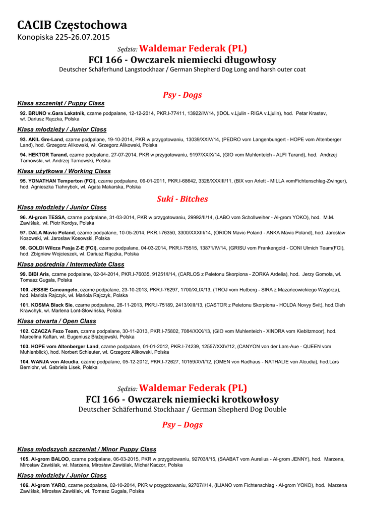 CACIB Częstochowa Konopiska 225-26.07.2015 Sędzia: Waldemar Federak (PL) FCI 166 - Owczarek niemiecki długowłosy Deutscher Schäferhund Langstockhaar / German Shepherd Dog Long and harsh outer coat Psy - Dogs Klasa szczeniąt / Puppy Class 92. BRUNO v.Gara Lakatnik, czarne podpalane, 12-12-2014, PKR.I-77411, 13922/IV/14, (IDOL v.Ljulin - RIGA v.Ljulin), hod. Petar Krastev, wł. Dariusz Rączka, Polska Klasa młodzieży / Junior Class 93. AKIL Gre-Land, czarne podpalane, 19-10-2014, PKR w przygotowaniu, 13039/XXIV/14, (PEDRO vom Langenbungert - HOPE vom Altenberger Land), hod. Grzegorz Alikowski, wł. Grzegorz Alikowski, Polska 94. HEKTOR Tarand, czarne podpalane, 27-07-2014, PKR w przygotowaniu, 9197/XXIX/14, (GIO vom Muhlenteich - ALFI Tarand), hod. Andrzej Tarnowski, wł. Andrzej Tarnowski, Polska Klasa użytkowa / Working Class 95. YONATHAN Temperton (FCI), czarne podpalane, 09-01-2011, PKR.I-68642, 3326/XXXIII/11, (BIX von Arlett - MILLA vomFichtenschlag-Zwinger), hod. Agnieszka Tiahnybok, wł. Agata Makarska, Polska Suki - Bitches Klasa młodzieży / Junior Class 96. Al-grom TESSA, czarne podpalane, 31-03-2014, PKR w przygotowaniu, 29992/II/14, (LABO vom Schollweiher - Al-grom YOKO), hod. M.M. Zawiślak, wł. Piotr Kordys, Polska 97. DALA Mavic Poland, czarne podpalane, 10-05-2014, PKR.I-76350, 3300/XXXIII/14, (ORION Mavic Poland - ANKA Mavic Poland), hod. Jarosław Kosowski, wł. Jaroslaw Kosowski, Polska 98. GOLDI Wilcza Pasja Z-E (FCI), czarne podpalane, 04-03-2014, PKR.I-75515, 13871/IV/14, (GRISU vom Frankengold - CONI Ulmich Team(FCI), hod. Zbigniew Wojcieszek, wł. Dariusz Rączka, Polska Klasa pośrednia / Intermediate Class 99. BIBI Aris, czarne podpalane, 02-04-2014, PKR.I-76035, 91251/I/14, (CARLOS z Peletonu Skorpiona - ZORKA Ardelia), hod. Jerzy Gomoła, wł. Tomasz Gugala, Polska 100. JESSIE Caneangelo, czarne podpalane, 23-10-2013, PKR.I-76297, 1700/XLIX/13, (TROJ vom Hutberg - SIRA z Mazańcowickiego Wzgórza), hod. Mariola Rajczyk, wł. Mariola Rajczyk, Polska 101. KOSMA Black Sie, czarne podpalane, 26-11-2013, PKR.I-75189, 2413/XIII/13, (CASTOR z Peletonu Skorpiona - HOLDA Novyy Svit), hod.Oleh Krawchyk, wł. Marlena Lont-Słowińska, Polska Klasa otwarta / Open Class 102. CZACZA Fezo Team, czarne podpalane, 30-11-2013, PKR.I-75802, 7084/XXX/13, (GIO vom Muhlenteich - XINDRA vom Kiebitzmoor), hod. Marcelina Kaftan, wł. Eugeniusz Błażejewski, Polska 103. HOPE vom Altenberger Land, czarne podpalane, 01-01-2012, PKR.I-74239, 12557/XXIV/12, (CANYON von der Lars-Aue - QUEEN vom Muhlenblick), hod. Norbert Schleuter, wł. Grzegorz Alikowski, Polska 104. WANJA von Alcudia, czarne podpalane, 05-12-2012, PKR.I-72627, 10159/XVI/12, (OMEN von Radhaus - NATHALIE von Alcudia), hod.Lars Bernlohr, wł. Gabriela Lisek, Polska Sędzia: Waldemar Federak (PL) FCI 166 - Owczarek niemiecki krotkowłosy Deutscher Schäferhund Stockhaar / German Shepherd Dog Double Psy – Dogs Klasa młodszych szczeniąt / Minor Puppy Class 105. Al-grom BALOO, czarne podpalane, 06-03-2015, PKR w przygotowaniu, 92703/I/15, (SAABAT vom Aurelius - Al-grom JENNY), hod. Marzena, Mirosław Zawiślak, wł. Marzena, Mirosław Zawiślak, Michał Kaczor, Polska Klasa młodzieży / Junior Class 106. Al-grom YARO, czarne podpalane, 02-10-2014, PKR w przygotowaniu, 92707/I/14, (ILIANO vom Fichtenschlag - Al-grom YOKO), hod. Marzena Zawiślak, Mirosław Zawiślak, wł. Tomasz Gugala, Polska Klasa pośrednia / Intermediate Class 107. EMO z Dubin, czarne podpalane, 06-12-2013, PKR.I-74673, 1627/XLIX/13, (AMMO von Hirschberg - CARMEN z Krywlan), hod. Sławomir Waszczenko, wł. Andrzej Bedkowski, Polska 108. OMEN z Domu Żyrków, czarne podpalane, 22-01-2014, PKR.I-74252, 12022/V/14, (FULZ di Zenevredo - KIA z Domu Żyrków), hod. Józef Żyrek, wł. Józef Żyrek, Polska Klasa otwarta / Open Class 109. WAIKO von der Zenteiche, czarne podpalane, 08-05-2013, PKR.I-73397, 30184/II/13, (OMEN v. Radhaus - ENYA von der Zenteiche), hod. Christoph Ludwig, wł. Alexander Moscoa Zeledon, Polska Klasa użytkowa / Working Class 110. Al-grom LABBO, czarne podpalane, 14-03-2013, PKR.I-72977, 89115/I/13, (LUGER vom Aspenhaus - Al-grom YOKO), hod. M.M. Zawiślak, wł. Izabela Beszlag, Polska 111. LEONARDO Tensor, czarne podpalane, 27-08-2012, PKR.I-71284, 8274/XXIX/12, (BARU di Croce Santo Spirito - EFENDI vom Frankengold), hod. Joanna, Adam Domańscy, wł. Karolina Ciosek, Polska Klasa championów / Champion Class 112. ORLANDO Temperton, czarne podpalane, 08-09-2010, PKR.I-67802, 13228/IV/10, (WARELL v. Contra - JESSICA Temperton), hod. Paweł Tiahnybok, wł. Joanna A. Bartkowska, Paweł Tiahnybok, Polska Suki – Bitches Klasa młodszych szczeniąt / Minor Puppy Class 113. Al-grom BONI, czarne podpalane, 06-03-2015, PKR w przygotowaniu, 92704/I/15, (SAABAT vm Aurelius - Al-grom JENNY), hod. Marzena, Mirosław Zawiślak, wł. Marzena, Mirosław Zawiślak, Izabela Beszlag, Polska Klasa szczeniąt / Puppy Class 114. BRENDA Hodowla z Kożla, czarne podpalane, 22-11-2014, PKR w przygotowaniu, 15322/XV/14, (ODIN z Folinku - KAYA Wawelno), hod. Stanisław Bonczyński, wł. Stanisław Bonczyński, Polska 115. YAGA Igbero, czarne podpalane, 17-12-2014, PKR w przygotowaniu, 9142/XXIX/14, (HIRO Śmiłowickie Wilki - KASTA Igbero), hod. Beata Ignaczak, wł. Beata Ignaczak, Polska Klasa młodzieży / Junior Class 116. CLEO Tombo, czarne podpalane, 16-08-2014, PKR w przygotowaniu, 9213/XXIX/14, (Team Leiksaid KAPITAN - GABI Tombo), hod. Tomasz Bogucki, wł. Karolina Ciosek, Polska 117. DAXI z Osiedla Poraja, czarne podpalane, 20-08-2014, PKR.I-76802, 9045/XXIX/14, (GIO von Muhlenteich - CYTRA z Osiedla Poraja), hod. Andrzej Mizera, wł. Andrzej Mizera, Polska 118. FAJTER Bi - Chelms, czarne podpalane, 22-04-2014, PKR.I-77256, 7202/XXX/14, (RAPTORS Asarko Lordana - ZINNI Asarko Lordana), hod. Adam Krzak, wł. Adam Krzak, Polska 119. GAMA Mis-Maz, czarne podpalane, 15-08-2014, PKR.I-76166, 91374/I/14, (Al-grom ZICO - WEGA Mis-Maz), hod. Waldem