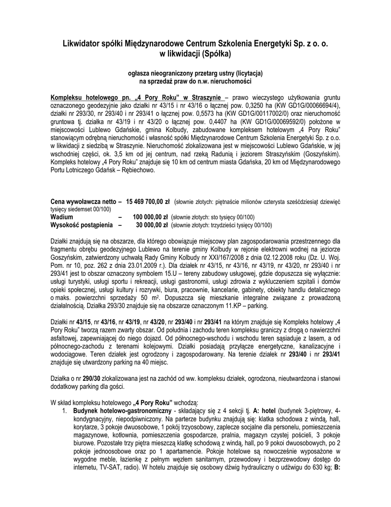 Likwidator spółki Międzynarodowe Centrum Szkolenia Energetyki Sp. z o. o. w likwidacji (Spółka) ogłasza nieograniczony przetarg ustny (licytacja) na sprzedaŜ praw do n.w. nieruchomości Kompleksu hotelowego pn. „4 Pory Roku” w Straszynie – prawo wieczystego uŜytkowania gruntu oznaczonego geodezyjnie jako działki nr 43/15 i nr 43/16 o łącznej pow. 0,3250 ha (KW GD1G/00066694/4), działki nr 293/30, nr 293/40 i nr 293/41 o łącznej pow. 0,5573 ha (KW GD1G/00117002/0) oraz nieruchomość gruntowa tj. działka nr 43/19 i nr 43/20 o łącznej pow. 0,4407 ha (KW GD1G/00069592/0) połoŜone w miejscowości Lublewo Gdańskie, gmina Kolbudy, zabudowane kompleksem hotelowym „4 Pory Roku” stanowiącym odrębną nieruchomość i własność spółki Międzynarodowe Centrum Szkolenia Energetyki Sp. z o.o. w likwidacji z siedzibą w Straszynie. Nieruchomość zlokalizowana jest w miejscowości Lublewo Gdańskie, w jej wschodniej części, ok. 3,5 km od jej centrum, nad rzeką Radunią i jeziorem Straszyńskim (Goszyńskim). Kompleks hotelowy „4 Pory Roku” znajduje się 10 km od centrum miasta Gdańska, 20 km od Międzynarodowego Portu Lotniczego Gdańsk – Rębiechowo. Cena wywoławcza netto – 15 469 700,00 zł (słownie złotych: piętnaście milionów czterysta sześćdziesiąt dziewięć tysięcy siedemset 00/100) Wadium – Wysokość postąpienia – 100 000,00 zł (słownie złotych: sto tysięcy 00/100) 30 000,00 zł (słownie złotych: trzydzieści tysięcy 00/100) Działki znajdują się na obszarze, dla którego obowiązuje miejscowy plan zagospodarowania przestrzennego dla fragmentu obrębu geodezyjnego Lublewo na terenie gminy Kolbudy w rejonie elektrowni wodnej na jeziorze Goszyńskim, zatwierdzony uchwałą Rady Gminy Kolbudy nr XXI/167/2008 z dnia 02.12.2008 roku (Dz. U. Woj. Pom. nr 10, poz. 262 z dnia 23.01.2009 r.). Dla działek nr 43/15, nr 43/16, nr 43/19, nr 43/20, nr 293/40 i nr 293/41 jest to obszar oznaczony symbolem 15.U – tereny zabudowy usługowej, gdzie dopuszcza się wyłącznie: usługi turystyki, usługi sportu i rekreacji, usługi gastronomii, usługi zdrowia z wykluczeniem szpitali i domów opieki społecznej, usługi kultury i rozrywki, biura, pracownie, kancelarie, gabinety, obiekty handlu detalicznego o maks. powierzchni sprzedaŜy 50 m2. Dopuszcza się mieszkanie integralne związane z prowadzoną działalnością. Działka 293/30 znajduje się na obszarze oznaczonym 11.KP – parking. Działki nr 43/15, nr 43/16, nr 43/19, nr 43/20, nr 293/40 i nr 293/41 na którym znajduje się Kompleks hotelowy „4 Pory Roku” tworzą razem zwarty obszar. Od południa i zachodu teren kompleksu graniczy z drogą o nawierzchni asfaltowej, zapewniającej do niego dojazd. Od północnego-wschodu i wschodu teren sąsiaduje z lasem, a od północnego-zachodu z terenami kolejowymi. Działki posiadają przyłącze energetyczne, kanalizacyjne i wodociągowe. Teren działek jest ogrodzony i zagospodarowany. Na terenie działek nr 293/40 i nr 293/41 znajduje się utwardzony parking na 40 miejsc. Działka o nr 290/30 zlokalizowana jest na zachód od ww. kompleksu działek, ogrodzona, nieutwardzona i stanowi dodatkowy parking dla gości. W skład kompleksu hotelowego „4 Pory Roku” wchodzą: 1. Budynek hotelowo-gastronomiczny - składający się z 4 sekcji tj. A: hotel (budynek 3-piętrowy, 4kondygnacyjny, niepodpiwniczony. Na parterze budynku znajdują się: klatka schodowa z windą, hall, korytarze, 3 pokoje dwuosobowe, 1 pokój trzyosobowy, zaplecze socjalne dla personelu, pomieszczenia magazynowe, kotłownia, pomieszczenia gospodarcze, pralnia, magazyn czystej pościeli, 3 pokoje biurowe. Pozostałe trzy piętra mieszczą klatkę schodową z windą, hall, po 9 pokoi dwuosobowych, po 2 pokoje jednoosobowe oraz po 1 apartamencie. Pokoje hotelowe są nowocześnie wyposaŜone w wygodne meble, łazienkę z pełnym węzłem sanitarnym, przewodowy i bezprzewodowy dostęp do internetu, TV-SAT, radio). W hotelu znajduje się osobowy dźwig hydrauliczny o udźwigu do 630 kg; B: recepcja z oranŜerią (budynek parterowy, w którym znajdują się hall, szyb dźwigu, maszynownia, hall recepcyjny, WC, kiosk, centrala klimatyzacyjna, szatnia, kawiarnia); C: restauracja (obiekt jednokondygnacyjny, podpiwniczony z uŜytkowym poddaszem. W piwnicy znajdują się: klatka schodowa, hall, szatnia, WC, zaplecze pubu, pub, hall, sala bilardowa, centrala klimatyzacyjna, pomieszczenie gospodarcze. Na parterze mieszczą się: wiatrołap, hall restauracyjny, klatka schodowa, sala restauracyjna, mała sala restauracyjna, WC, sala bankietowa, rozdzielnia kelnerska, 2 pomieszczenia magazynowe. Na poddaszu: klatka schodowa, hall, szatnia, WC, sala konferencyjna o powierzchni 135 m2, pomieszczenie gospodarcze, pokój kelnerów, pokój lektora, pomieszczenie gospodarcze.); D: kuchnia (obiekt jednokondygnacyjny, w którym znajdują się: pokój biurowy, 4 magazyny, mroźnia, chłodnia, mopping, garmaŜ, 2 przygotowalnie, kuchnia, zmywalnia, rozdzielnia kelnerska, pomieszczenie na odpadki, 2 szatnie, 2 umywalnie, WC, pomieszczenie socjalne, korytarz, komunikacja). W budynku hotelowo-gastronomicznym są następujące instalacje: elektryczna, wodna, kanalizacyjna, c.o. z własnej kotłowni gazowej, grzejniki konwektorowe, alarmowa, klimatyzacyjna, telefoniczna, wentylacyjna grawitacyjna i mechaniczna. Powierzchnia uŜytkowa budynku hotelowo-gastronomicznego wynosi 3 351,69 m2. 2. Budynek pawilonu szkoleniowego - budynek parterowy, niepodpiwniczony o powierzchni uŜytkowej 343,30 m2, w którym znajduje się: 5 sal konferencyjnych (3 sale o powierzchniach 51 m2, 33 m2, 17 m2), korytarz oraz WC. Budynek w konstrukcji betonowej, w którym znajdują się instalacje tj.: elektryczna, wodna, kanalizacyjna, c.o. z własnej kotłowni gazowej, grzejniki Ŝeberkowe, alarmowa, klimatyzacyjna. 3. Budynek chaty biesiadnej Uroczysko – budynek wolnostojący o powierzchni uŜytkowej 378,40 m2, częściow