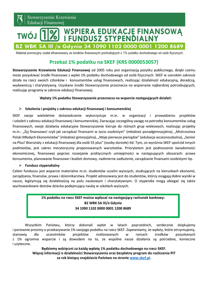 Przekaż 1% podatku na SKEF (KRS 0000053057) Stowarzyszenie Krzewienia Edukacji Finansowej od 2005 roku jest organizacją pożytku publicznego, dzięki czemu może pozyskiwać środki finansowe z wpłat 1% podatku dochodowego od osób fizycznych. SKEF w szerokim zakresie działa na rzecz swoich członków i konsumentów usług finansowych, realizując działalność edukacyjną, doradczą, wydawniczą i charytatywną. Uzyskane środki Stowarzyszenie przeznacza na wspieranie najbardziej potrzebujących, realizując programy w zakresie edukacji finansowej. Wpłaty 1% podatku Stowarzyszenie przeznacza na wsparcie następujących działań: Szkolenia i projekty z zakresu edukacji finansowej i konsumenckiej SKEF swoje wieloletnie doświadczenie wykorzystuje m.in. w organizacji i prowadzeniu projektów i szkoleń z zakresu edukacji finansowej i konsumenckiej. Zwracając szczególną uwagę na potrzeby konsumentów usług finansowych, swoje działania edukacyjne Stowarzyszenie kieruje do różnych grup wiekowych, realizując projekty m.in.: „Żyj finansowo! czyli jak zarządzać finansami w życiu osobistym” (młodzież ponadgimnazjalna), „Mistrzostwa Polski Młodych Ekonomistów” (młodzież gimnazjalna), „Moje pierwsze pieniądze” (edukacja wczesnoszkolna), „Senior na Plus! Warsztaty z edukacji finansowej dla osób 55 plus” (osoby dorosłe) itd. Tym, co wyróżnia SKEF spośród innych podmiotów, jest zakres merytoryczny proponowanych warsztatów. Priorytetem jest podnoszenie świadomości ekonomicznej, finansowej poprzez rozwijanie praktycznych umiejętności w następujących obszarach: prawa konsumenta, planowanie finansowe i budżet domowy, nadmierne zadłużenie, zarządzanie finansami osobistymi itp. Fundusz stypendialny Celem funduszu jest wsparcie materialne m.in. studentów uczelni wyższych, studiujących na kierunkach ekonomii, zarządzania, finansów, prawa i dziennikarstwa. Projekt adresowany jest do studentów, którzy osiągają dobre wyniki w nauce, legitymują się działalnością na polu naukowym i charytatywnym. O stypendia mogą ubiegać się także wychowankowie domów dziecka podejmujący naukę w szkołach wyższych. 1% podatku na rzecz SKEF można wpłacać na następujący rachunek bankowy: BZ WBK SA III/o Gdynia 34 1090 1102 0000 0001 1200 8689 Wszystkim Państwu, którzy dokonali wpłat w latach poprzednich, serdecznie dziękujemy i ponownie prosimy o przekazywanie 1% swojego podatku na rzecz SKEF. Zapewniamy, że wpłaty, które otrzymujemy, stanowią dla uczestników projektów realizowanych w ramach środków pozyskanych z 1% ogromne wsparcie i są dowodem na to, że wspólne nasze działania są potrzebne, konieczne i użyteczne. Będziemy wdzięczni za każdą wpłatę 1% podatku dochodowego na rzecz SKEF. Więcej informacji o działalności Stowarzyszenia oraz bezpłatny program do rozliczenia PIT za rok bieżący znajdziecie Państwo na stronie www.skef.pl.