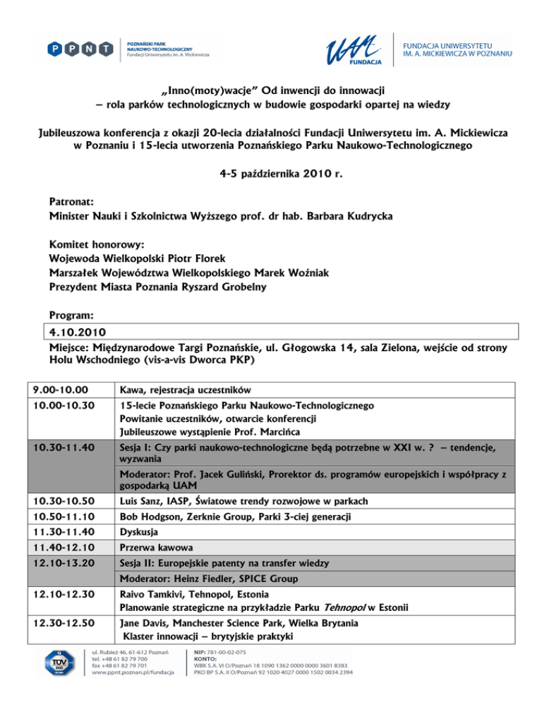 „Inno(moty)wacje” Od inwencji do innowacji – rola parków technologicznych w budowie gospodarki opartej na wiedzy Jubileuszowa konferencja z okazji 20-lecia działalności Fundacji Uniwersytetu im. A. Mickiewicza w Poznaniu i 15-lecia utworzenia Poznańskiego Parku Naukowo-Technologicznego 4-5 października 2010 r. Patronat: Minister Nauki i Szkolnictwa Wyższego prof. dr hab. Barbara Kudrycka Komitet honorowy: Wojewoda Wielkopolski Piotr Florek Marszałek Województwa Wielkopolskiego Marek Woźniak Prezydent Miasta Poznania Ryszard Grobelny Program: 4.10.2010 Miejsce: Międzynarodowe Targi Poznańskie, ul. Głogowska 14, sala Zielona, wejście od strony Holu Wschodniego (vis-a-vis Dworca PKP) 9.00-10.00 Kawa, rejestracja uczestników 10.00-10.30 15-lecie Poznańskiego Parku Naukowo-Technologicznego Powitanie uczestników, otwarcie konferencji Jubileuszowe wystąpienie Prof. Marcińca 10.30-11.40 Sesja I: Czy parki naukowo-technologiczne będą potrzebne w XXI w. ? – tendencje, wyzwania Moderator: Prof. Jacek Guliński, Prorektor ds. programów europejskich i współpracy z gospodarką UAM 10.30-10.50 Luis Sanz, IASP, Światowe trendy rozwojowe w parkach 10.50-11.10 Bob Hodgson, Zerknie Group, Parki 3-ciej generacji 11.30-11.40 Dyskusja 11.40-12.10 Przerwa kawowa 12.10-13.20 Sesja II: Europejskie patenty na transfer wiedzy Moderator: Heinz Fiedler, SPICE Group 12.10-12.30 Raivo Tamkivi, Tehnopol, Estonia Planowanie strategiczne na przykładzie Parku Tehnopol w Estonii 12.30-12.50 Jane Davis, Manchester Science Park, Wielka Brytania Klaster innowacji – brytyjskie praktyki 12.50-13.10 Sten Gunnar Johansson, Mjardevi Science Park, Szwecja Networking lokatorów parków na przykładzie Mjardewi Science Park 13.10-13.20 Dyskusja 13.20-14.10 Lunch 14.10-15.20 Sesja III: Czy polskie parki naukowo-technologiczne zbudują gospodarkę opartą na wiedzy? Moderator: Elżbieta Książek, Poznański Park Naukowo-Technologiczny FUAM 14.10-14.25 System innowacji w Polsce, Krzysztof Gulda, Dyrektor Departamentu Strategii i Rozwoju Nauki, Ministerstwo Nauki i Szkolnictwa Wyższego 14.25-14.40 PARP – działania miękkie (benchmarking) i inwestycyjne (5.3, 5.1 PO IG), Aneta Wilmańska Zastępca Prezesa Polskiej Agencji Rozwoju Przedsiębiorczości 14.40-15.10 Przegląd polskich parków naukowo-technologicznych, Krzysztof B. Matusiak, Prezes Stowarzyszenia Organizatorów Ośrodków Innowacji i Przedsiębiorczości w Polsce 15.10-15.20 Dyskusja 15.20-15.40 Przerwa kawowa 15.40-17.45 Sesja IV: Nauka i biznes – czy jest między nimi chemia? Dobre praktyki krajowe Moderator: Krzysztof Gulda, Dyrektor Departamentu Strategii i Rozwoju Nauki, Ministerstwo Nauki i Szkolnictwa Wyższego 15.40-15.55 Poznański Park Naukowo-Technologiczny FUAM Prof. Bogdan Marciniec, Dyrektor PPNT FUAM 15.55-16.10 Grace Construction Products, Dr Felek Jachimowicz, Wiceprezes ds. badań i rozwoju 16.10-16.25 Centrum Badań DNA, Jacek Wojciechowicz, Wiceprezes Zarządu 16.25-16.40 Wrocławski Park Technologiczny S.A., Marek Winkowski, Wiceprezes Wrocławskiego Parku Technologicznego S.A. 16.40-16.55 Nexwell, Michał Kowalczyk 16.55-17.10 Kriosystem, Grzegorz Michalski 17.10-17.25 Park Naukowo-Technologiczny „Technopark” Gliwice Sp. z o.o., Prof. Jan Kosmol, Prezes „Technoparku” 17.25-17.55 i3D 17.55-18.10 Dyskusja 18.10-18.30 Podsumowanie: 4 moderatorów Spotkanie wieczorne: 20.30, Brovaria, Stary Rynek 5.10.2010 Miejsce: Międzynarodowe Targi Poznańskie 9:00-11:00 Zwiedzanie PPNT Panele dyskusyjne 11.30 – 13.00 Mierzenie efektywności funkcjonowania parków Moderacja: Berenika Marciniec, Zastępca Dyrektora Zespołu Infrastruktury Nowoczesnej Gospodarki, Polska Agencja Rozwoju Przedsiębiorczości Elżbieta Książek, Zastępca Dyrektora Poznańskiego Parku NaukowoTechnologicznego FUAM − − − − Raivo Tamkivi, Tallin, Technopol Luis Sanz, IASP Jane Davis, Manchester Science Park Krzysztof B. Matusiak, Stowarzyszenie Organizatorów Ośrodków Innowacji i Przedsiębiorczości w Polsce − Joanna Podgórska, Zespół Innowacji i Technologii, Polska Agencja Rozwoju Przedsiębiorczości 13.00 – 13.30 Przerwa kawowa 13.30-15.00 Sieciowanie parków i ich promocja Moderacja: Łukasz Sztern, Zespół Innowacji i Technologii Polska Agencja Rozwoju Przedsiębiorczości Anna Tórz, Kierownik Inkubatora Technologicznego Poznańskiego Parku NaukowoTechnologicznego FUAM − − − − − Sten Gunnar Johansson, Mjardevi Science Park Heinz Fiedler, SPICE Group Bob Hodgson, Zernike Group Bronisława Kowalak, ekspert Jacek Kotra, Dyrektor Parku Naukowo-Technologicznego „Technopark” Gliwice Sp. z o.o. (TBC) − Marek Winkowski, Wiceprezes Wrocławskiego Parku Technologicznego S.A. 15:00-16:00 Lunch 16.00-16.30 Zamknięcie konferencji: Luis Sanz, Prof. Bogdan Marciniec Koncert z okazji 20-lecia działalności Fundacji UAM: godz. 19:00, Aula Uniwersytetu im. A. Mickiewicza, ul. Wieniawskiego 1 Organizatorzy zastrzegają sobie prawo wprowadzania zmian do programu.