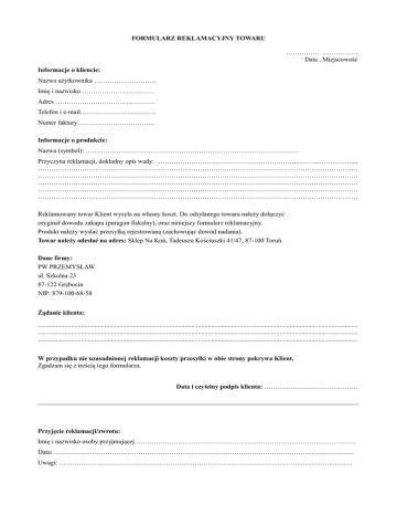 FORMULARZ REKLAMACYJNY TOWARU …………… ….…………. Data , Miejscowość Informacje o kliencie: Nazwa użytkownika ………………………. Imię i nazwisko …………………………… Adres ……………………………………… Telefon i e-mail……………………………. Numer faktury…………………………….. Informacje o produkcie: Nazwa (symbol): …………………………………………………………………………………… Przyczyna reklamacji, dokładny opis wady: ………………………………………………………...……...……...…….... ……………………………………………………………………………………………………………………………… ……………………………………………………………………………………………………………………………… ……………………………………………………………………………………………………………………………… ……………………………………………………………………………………………………………………………… ……………………………………………………………………………………………………………………………… Reklamowany towar Klient wysyła na własny koszt. Do odsyłanego towaru należy dołączyć oryginał dowodu zakupu (paragon fiskalny), oraz niniejszy formularz reklamacyjny. Produkt należy wysłać przesyłką rejestrowaną (zachowując dowód nadania). Towar należy odesłać na adres: Sklep Na Koń, Tadeusza Kościuszki 41/47, 87-100 Toruń. Dane firmy: PW PRZEMYSŁAW ul. Szkolna 23 87-122 Grębocin NIP: 879-100-68-58 Żądanie klienta: ................................................................................................................................................................................................ ................................................................................................................................................................................................ ................................................................................................................................................................................................ W przypadku nie uzasadnionej reklamacji koszty przesyłki w obie strony pokrywa Klient. Zgadzam się z treścią tego formularza. Data i czytelny podpis klienta: …………………………………… Przyjęcie reklamacji/zwrotu: Imię i nazwisko osoby przyjmującej ……………………………………………………………………………………… Data: ……………………………………………………………………………………………………………………… Uwagi: ………………………………………………………………………………………………..…………..………