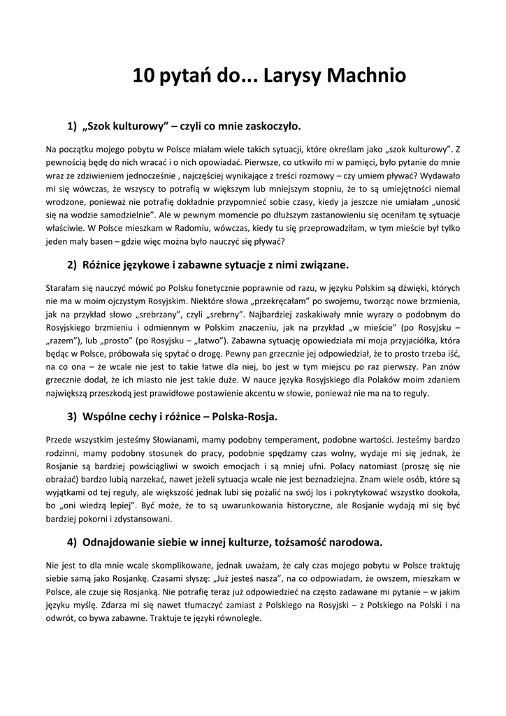 10 pytań do... Larysy Machnio 1) „Szok kulturowy” – czyli co mnie zaskoczyło. Na początku mojego pobytu w Polsce miałam wiele takich sytuacji, które określam jako „szok kulturowy”. Z pewnością będę do nich wracać i o nich opowiadać. Pierwsze, co utkwiło mi w pamięci, było pytanie do mnie wraz ze zdziwieniem jednocześnie , najczęściej wynikające z treści rozmowy – czy umiem pływać? Wydawało mi się wówczas, że wszyscy to potrafią w większym lub mniejszym stopniu, że to są umiejętności niemal wrodzone, ponieważ nie potrafię dokładnie przypomnieć sobie czasy, kiedy ja jeszcze nie umiałam „unosić się na wodzie samodzielnie”. Ale w pewnym momencie po dłuższym zastanowieniu się oceniłam tę sytuacje właściwie. W Polsce mieszkam w Radomiu, wówczas, kiedy tu się przeprowadziłam, w tym mieście był tylko jeden mały basen – gdzie więc można było nauczyć się pływać? 2) Różnice językowe i zabawne sytuacje z nimi związane. Starałam się nauczyć mówić po Polsku fonetycznie poprawnie od razu, w języku Polskim są dźwięki, których nie ma w moim ojczystym Rosyjskim. Niektóre słowa „przekręcałam” po swojemu, tworząc nowe brzmienia, jak na przykład słowo „srebrzany”, czyli „srebrny”. Najbardziej zaskakiwały mnie wyrazy o podobnym do Rosyjskiego brzmieniu i odmiennym w Polskim znaczeniu, jak na przykład „w mieście” (po Rosyjsku – „razem”), lub „prosto” (po Rosyjsku – „łatwo”). Zabawna sytuację opowiedziała mi moja przyjaciółka, która będąc w Polsce, próbowała się spytać o drogę. Pewny pan grzecznie jej odpowiedział, że to prosto trzeba iść, na co ona – że wcale nie jest to takie łatwe dla niej, bo jest w tym miejscu po raz pierwszy. Pan znów grzecznie dodał, że ich miasto nie jest takie duże. W nauce języka Rosyjskiego dla Polaków moim zdaniem największą przeszkodą jest prawidłowe postawienie akcentu w słowie, ponieważ nie ma na to reguły. 3) Wspólne cechy i różnice – Polska-Rosja. Przede wszystkim jesteśmy Słowianami, mamy podobny temperament, podobne wartości. Jesteśmy bardzo rodzinni, mamy podobny stosunek do pracy, podobnie spędzamy czas wolny, wydaje mi się jednak, że Rosjanie są bardziej powściągliwi w swoich emocjach i są mniej ufni. Polacy natomiast (proszę się nie obrażać) bardzo lubią narzekać, nawet jeżeli sytuacja wcale nie jest beznadziejna. Znam wiele osób, które są wyjątkami od tej reguły, ale większość jednak lubi się pożalić na swój los i pokrytykować wszystko dookoła, bo „oni wiedzą lepiej”. Być może, że to są uwarunkowania historyczne, ale Rosjanie wydają mi się być bardziej pokorni i zdystansowani. 4) Odnajdowanie siebie w innej kulturze, tożsamość narodowa. Nie jest to dla mnie wcale skomplikowane, jednak uważam, że cały czas mojego pobytu w Polsce traktuję siebie samą jako Rosjankę. Czasami słyszę: „Już jesteś nasza”, na co odpowiadam, że owszem, mieszkam w Polsce, ale czuje się Rosjanką. Nie potrafię teraz już odpowiedzieć na często zadawane mi pytanie – w jakim języku myślę. Zdarza mi się nawet tłumaczyć zamiast z Polskiego na Rosyjski – z Polskiego na Polski i na odwrót, co bywa zabawne. Traktuje te języki równolegle. 5) Spostrzeganie ludzi i innej kultury – plusy i minusy. Powtórzę się – jesteśmy podobni, więc łatwo mi przyszło komunikowanie się z Polakami. Polacy są chętni do rozmowy, zawsze maja dużo do powiedzenia, uważają się za ekspertów we wszystkich dziedzinach więc ochoczo doradzają. Stwierdzenie „Polak potrafi” jak najbardziej jest trafnym, moim zdaniem. Co nie jest zabronione – jest dozwolone. Bardzo mi się podoba takie podejście do różnych spraw. Bezgraniczna inwencja twórcza – pozytywna cecha Polaków. Jeżeli chodzi o reakcję na moje pochodzenie, to jest różna, ale najczęściej pozytywna. Ludzie zaczynają przypominać sobie wierszyki i piosenki po Rosyjsku nawet ze szkoły podstawowej, zadają dużo pytań, najczęściej pada pytanie „Gdzie jest lepiej?”. Na to pytanie również nie potrafię adekwatnie odpowiedzieć, ponieważ nie mieszkam w Rosji i teraz nie mam porównań „ z dnia codziennego”. Kiedyś próbowała się dostać do pracy do jednej z radomskich firm, usłyszałam pytanie, czy z takim pochodzeniem się nie boje w Radomiu pracować, na co odpowiedziałam, że jeżeli nie boją się państwo ze mną rozmawiać, to raczej nie mam czego się obawiać. To była ostatnia wymiana zdań na rozmowie kwalifikacyjnej w tej firmie. Nie dostałam się. Czasami czuje się taką niechęć do Rosjan, ale w Rosji zdarzyła mi się odwrotna sytuacja. Będąc w zoo rozmawiałam z dziećmi po Polsku, jakiemuś panu to się chyba nie spodobało, rzucał jakieś teksty w temacie okupacji Moskwy przez obce narody. Otrzymał ode mnie krótką ripostę po Rosyjsku o tolerancji i gościnności prawdziwych Rosjan i szybko się zamknął, Naprawdę było mi przykro za Polaków, ale na szczęście był to pojedynczy przypadek. Zawsze w dyskusjach staram się być lojalną, ale jak są słowne ataki na Polaków – bronię Polaków, jak na Rosjan – bronię Rosjan. 6) Na pograniczu kultur – nasi bliscy. Przenikanie dwóch kultur w moim przypadku jest codziennym zjawiskiem, jestem rodowitą Rosjanką, mój mąż zaś – Polakiem. A nasze dzieci? Mamy dwie piękne cudowne córki, obie urodziły się w Rosji i zaczynały swoje zapoznanie się ze światem po Rosyjsku, ale prawie zawsze z domieszką Polskiego.” Ciocia, zrób ciajku” – czyli herbatkę, prosiła moja starsza córka swoją polską ciocie podczas jednych z odwiedzin w kraju nad Wisłą. Szkoła dla moich dzieci zaczęła się już w Polsce, polskość przeważyła i teraz moje dziewczyny uważają się za Polki, tym bardziej, że już od dłuższego czasu nie mamy możliwości jak odwiedzanie najbliższych w Rosji, nad czym b