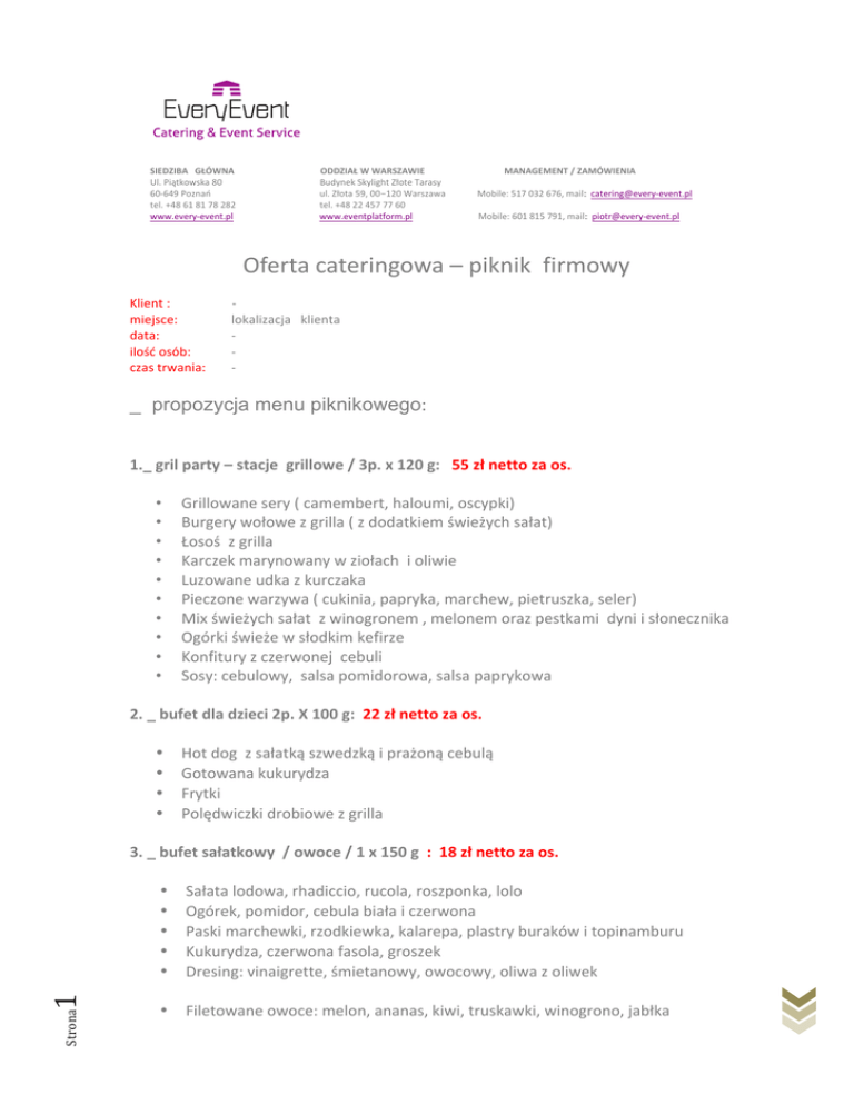 SIEDZIBA GŁÓWNA ODDZIAŁ W WARSZAWIE MANAGEMENT / ZAMÓWIENIA Ul. Piątkowska 80 Budynek Skylight Złote Tarasy 60-‐649 Poznań ul. Złota 59, 00-120 Warszawa Mobile: 517 032 676, mail: catering@every-‐event.pl tel. +48 61 81 78 282 tel. +48 22 457 77 60 www.every-‐event.pl www.eventplatform.pl Mobile: 601 815 791, mail: piotr@every-‐event.pl Oferta cateringowa – piknik firmowy Klient : -‐ miejsce: lokalizacja klienta data: -‐ ilość osób: -‐ czas trwania: -‐ Strona 1 _ propozycja menu piknikowego: 1._ gril party – stacje grillowe / 3p. x 120 g: 55 zł netto za os. • Grillowane sery ( camembert, haloumi, oscypki) • Burgery wołowe z grilla ( z dodatkiem świeżych sałat) • Łosoś z grilla • Karczek marynowany w ziołach i oliwie • Luzowane udka z kurczaka • Pieczone warzywa ( cukinia, papryka, marchew, pietruszka, seler) • Mix świeżych sałat z winogronem , melonem oraz pestkami dyni i słonecznika • Ogórki świeże w słodkim kefirze • Konfitury z czerwonej cebuli • Sosy: cebulowy, salsa pomidorowa, salsa paprykowa 2. _ bufet dla dzieci 2p. X 100 g: 22 zł netto za os. • Hot dog z sałatką szwedzką i prażoną cebulą • Gotowana kukurydza • Frytki • Polędwiczki drobiowe z grilla 3. _ bufet sałatkowy / owoce / 1 x 150 g : 18 zł netto za os. • Sałata lodowa, rhadiccio, rucola, roszponka, lolo • Ogórek, pomidor, cebula biała i czerwona • Paski marchewki, rzodkiewka, kalarepa, plastry buraków i topinamburu • Kukurydza, czerwona fasola, groszek • Dresing: vinaigrette, śmietanowy, owocowy, oliwa z oliwek • Filetowane owoce: melon, ananas, kiwi, truskawki, winogrono, jabłka 4._ słodkie przekąski typu fingerfood 2 x 100 g : 12 zł netto za os. • Wykwintne muffiny czekoladowe z wiśniami • Krążki drożdżowe z jabłkami i cynamonem • Ciasto marchewkowe z dodatkiem chilli • Ciastka owsiane i imbirowe 5._bufet z napojami: 20 zł netto za os. • Lemoniada z naturalnych składników 0,2 l / os • Smoothie truskawkowe i brzoskwiniowe 0,3 l / os • Kawa wg zapotrzebowania -‐ warnik + kawa mielona + kawa rozpuszczalna • Herbata wg zapotrzebowania – warnik + herbaty smakowe – 3 rodzaje • Śmietanki, mleko, cytryna, cukier wg zapotrzebowania (bufet) • Woda mineralna 0,4 l / os • Soki naturalne 0,4 l / os. 6. Zakres usługi w cenie • • • • • • • • transport asortyment wg powyższego menu stoły bufetowe oraz stanowiska grillowe pod namiotami lekkimi profesjonalny sprzęt gastronomiczny zastawa jednorazowego użytku obsługa kelnerska / serwis porządkowy obsługa kucharska obsługa techniczna Strona 2 6._ Opcjonalne ( ceny netto) • Stoły piknikowe z ławami i obrusem z obrusem: 50 zł netto / komplet • Namiot plenerowy: od 30 zł / m 2 • Piwo z beczki: 6 zł / 0, 5 l • Lody tradycyjne: 3,5 zł / porcja ©Wszelkie prawa zastrzeżone Strona 3 _______________________________________________________________________ SIEDZIBA GŁÓWNA ODDZIAŁ W WARSZAWIE MANAGEMENT / ZAMÓWIENIA Ul. Piątkowska 80 Budynek Skylight Złote Tarasy 60-‐649 Poznań ul. Złota 59, 00-120 Warszawa Mobile: 517 032 676, mail: catering@every-‐event.pl tel. +48 61 81 78 282 tel. +48 22 457 77 60 www.every-‐event.pl www.eventplatform.pl Mobile: 601 815 791, mail: piotr@every-‐event.pl