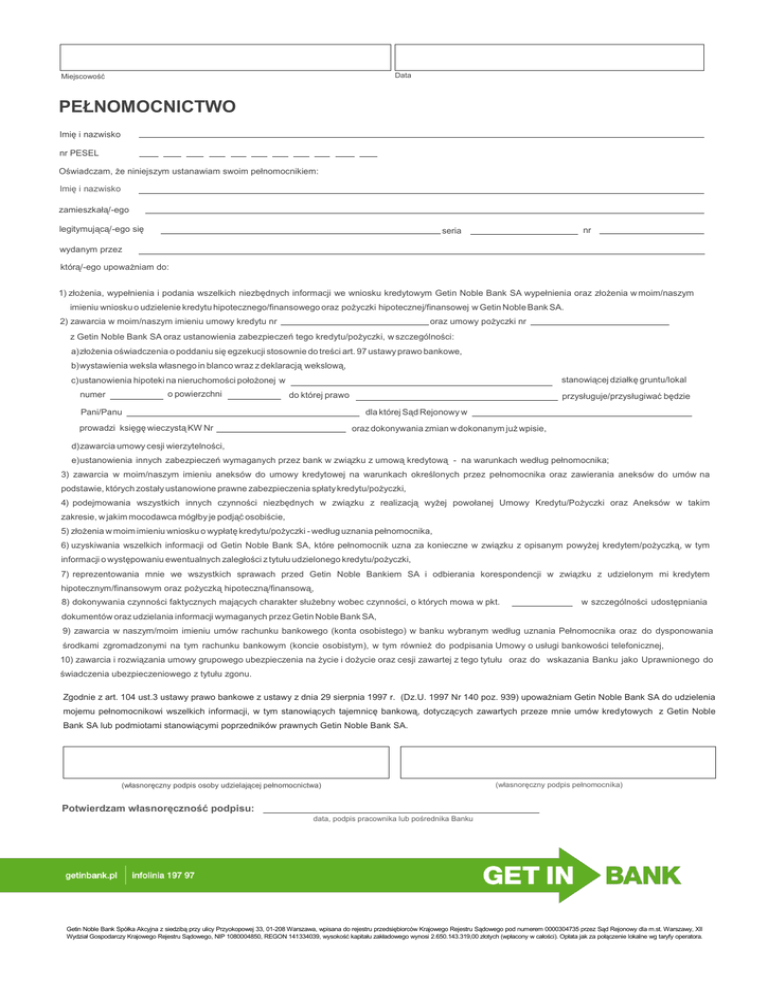 Miejscowość Data PEŁNOMOCNICTWO Imię i nazwisko nr PESEL Oświadczam, że niniejszym ustanawiam swoim pełnomocnikiem: Imię i nazwisko zamieszkałą/-ego legitymującą/-ego się nr seria wydanym przez którą/-ego upoważniam do: 1) złożenia, wypełnienia i podania wszelkich niezbędnych informacji we wniosku kredytowym Getin Noble Bank SA wypełnienia oraz złożenia w moim/naszym imieniu wniosku o udzielenie kredytu hipotecznego/finansowego oraz pożyczki hipotecznej/finansowej w Getin Noble Bank SA. oraz umowy pożyczki nr 2) zawarcia w moim/naszym imieniu umowy kredytu nr z Getin Noble Bank SA oraz ustanowienia zabezpieczeń tego kredytu/pożyczki, w szczególności: a)złożenia oświadczenia o poddaniu się egzekucji stosownie do treści art. 97 ustawy prawo bankowe, b)wystawienia weksla własnego in blanco wraz z deklaracją wekslową, stanowiącej działkę gruntu/lokal c) ustanowienia hipoteki na nieruchomości położonej w o powierzchni numer do której prawo przysługuje/przysługiwać będzie dla której Sąd Rejonowy w Pani/Panu prowadzi księgę wieczystą KW Nr oraz dokonywania zmian w dokonanym już wpisie, d)zawarcia umowy cesji wierzytelności, e)ustanowienia innych zabezpieczeń wymaganych przez bank w związku z umową kredytową - na warunkach według pełnomocnika; 3) zawarcia w moim/naszym imieniu aneksów do umowy kredytowej na warunkach określonych przez pełnomocnika oraz zawierania aneksów do umów na podstawie, których zostały ustanowione prawne zabezpieczenia spłaty kredytu/pożyczki, 4) podejmowania wszystkich innych czynności niezbędnych w związku z realizacją wyżej powołanej Umowy Kredytu/Pożyczki oraz Aneksów w takim zakresie, w jakim mocodawca mógłby je podjąć osobiście, 5) złożenia w moim imieniu wniosku o wypłatę kredytu/pożyczki - według uznania pełnomocnika, 6) uzyskiwania wszelkich informacji od Getin Noble Bank SA, które pełnomocnik uzna za konieczne w związku z opisanym powyżej kredytem/pożyczką, w tym informacji o występowaniu ewentualnych zaległości z tytułu udzielonego kredytu/pożyczki, 7) reprezentowania mnie we wszystkich sprawach przed Getin Noble Bankiem SA i odbierania korespondencji w związku z udzielonym mi kredytem hipotecznym/finansowym oraz pożyczką hipoteczną/finansową, 8) dokonywania czynności faktycznych mających charakter służebny wobec czynności, o których mowa w pkt. w szczególności udostępniania dokumentów oraz udzielania informacji wymaganych przez Getin Noble Bank SA, 9) zawarcia w naszym/moim imieniu umów rachunku bankowego (konta osobistego) w banku wybranym według uznania Pełnomocnika oraz do dysponowania środkami zgromadzonymi na tym rachunku bankowym (koncie osobistym), w tym również do podpisania Umowy o usługi bankowości telefonicznej, 10) zawarcia i rozwiązania umowy grupowego ubezpieczenia na życie i dożycie oraz cesji zawartej z tego tytułu oraz do wskazania Banku jako Uprawnionego do świadczenia ubezpieczeniowego z tytułu zgonu. Zgodnie z art. 104 ust.3 ustawy prawo bankowe z ustawy z dnia 29 sierpnia 1997 r. (Dz.U. 1997 Nr 140 poz. 939) upoważniam Getin Noble Bank SA do udzielenia mojemu pełnomocnikowi wszelkich informacji, w tym stanowiących tajemnicę bankową, dotyczących zawartych przeze mnie umów kredytowych z Getin Noble Bank SA lub podmiotami stanowiącymi poprzedników prawnych Getin Noble Bank SA. (własnoręczny podpis osoby udzielającej pełnomocnictwa) (własnoręczny podpis pełnomocnika) Potwierdzam własnoręczność podpisu: data, podpis pracownika lub pośrednika Banku Getin Noble Bank Spółka Akcyjna z siedzibą przy ulicy Przyokopowej 33, 01-208 Warszawa, wpisana do rejestru przedsiębiorców Krajowego Rejestru Sądowego pod numerem 0000304735 przez Sąd Rejonowy dla m.st. Warszawy, XII Wydział Gospodarczy Krajowego Rejestru Sądowego, NIP 1080004850, REGON 141334039, wysokość kapitału zakładowego wynosi 2.650.143.319,00 złotych (wpłacony w całości). Opłata jak za połączenie lokalne wg taryfy operatora.
