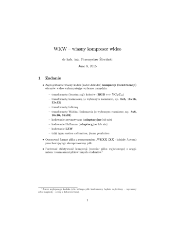 WKW –w÷ asny kompresor wideo dr hab. inz·. Przemys÷ aw Śliwiński June 8, 2015 1 Zadanie Zaprojektować w÷ asny kodek (koder-dekoder) kompresji (bezstratnej!) obrazów wideo wykorzystujac ¾ wybrane narzedzia: ¾ – transformate¾ (bezstratna!) ¾ kolorów (RGB () YCB CR ) – transformate¾ kosinusowa¾ (o wybranym rozmiarze, np. 8x8, 16x16, 32x32) – transformate¾ falkowa¾ – transformate¾ Walsha-Hadamarda (o wybranym rozmiarze, np. 8x8, 16x16, 32x32) – kodowanie arytmetyczne (adaptacyjne lub nie) – kodowanie Hu¤mana (adaptacyjne lub nie) – kodowanie LZW – triki typu motion estimation, frame prediction Opracować format pliku z rozszerzeniem .WKXX (XX - inicja÷y Autora) przechowujacego ¾ skompresowany plik. Porównać efektywność kompresji (rozmiar pliku wyjściowego) z orygina÷ em i rozmiarami plików innych studentów.1 1 Autor najlepszego kodeka (dla którego plik konkursowy b edzie ¾ najkrótszy – wyznaczy sobie nagrod e¾ – ocen e¾ z laboratorium). 1