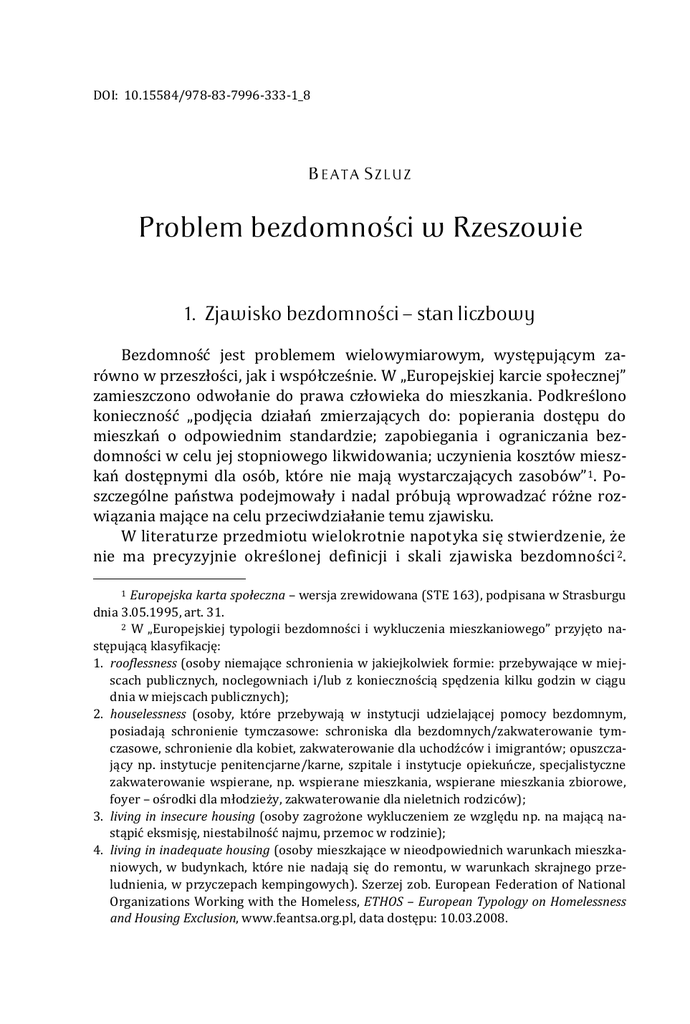 DOI: 10.15584/978-83-7996-333-1_8 Bezdomność jest problemem wielowymiarowym, występującym zarówno w przeszłości, jak i współcześnie. W „Europejskiej karcie społecznej” zamieszczono odwołanie do prawa człowieka do mieszkania. Podkreślono konieczność „podjęcia działań zmierzających do: popierania dostępu do mieszkań o odpowiednim standardzie; zapobiegania i ograniczania bezdomności w celu jej stopniowego likwidowania; uczynienia kosztów mieszkań dostępnymi dla osób, które nie mają wystarczających zasobów”1. Poszczególne państwa podejmowały i nadal próbują wprowadzać różne rozwiązania mające na celu przeciwdziałanie temu zjawisku. W literaturze przedmiotu wielokrotnie napotyka się stwierdzenie, że nie ma precyzyjnie określonej definicji i skali zjawiska bezdomności 2. Europejska karta społeczna – wersja zrewidowana (STE 163), podpisana w Strasburgu dnia 3.05.1995, art. 31. 2 W „Europejskiej typologii bezdomności i wykluczenia mieszkaniowego” przyjęto następującą klasyfikację: 1. rooflessness (osoby niemające schronienia w jakiejkolwiek formie: przebywające w miejscach publicznych, noclegowniach i/lub z koniecznością spędzenia kilku godzin w ciągu dnia w miejscach publicznych); 2. houselessness (osoby, które przebywają w instytucji udzielającej pomocy bezdomnym, posiadają schronienie tymczasowe: schroniska dla bezdomnych/zakwaterowanie tymczasowe, schronienie dla kobiet, zakwaterowanie dla uchodźców i imigrantów; opuszczający np. instytucje penitencjarne/karne, szpitale i instytucje opiekuńcze, specjalistyczne zakwaterowanie wspierane, np. wspierane mieszkania, wspierane mieszkania zbiorowe, foyer – ośrodki dla młodzieży, zakwaterowanie dla nieletnich rodziców); 3. living in insecure housing (osoby zagrożone wykluczeniem ze względu np. na mającą nastąpić eksmisję, niestabilność najmu, przemoc w rodzinie); 4. living in inadequate housing (osoby mieszkające w nieodpowiednich warunkach mieszkaniowych, w budynkach, które nie nadają się do remontu, w warunkach skrajnego przeludnienia, w przyczepach kempingowych). Szerzej zob. European Federation of National Organizations Working with the Homeless, ETHOS – European Typology on Homelessness and Housing Exclusion, www.feantsa.org.pl, data dostępu: 10.03.2008. 1 Podjęto wiele prób mających na celu ustalenie liczby osób bezdomnych, które w Polsce dokonywano różnymi sposobami/metodami, np.: przez policzenie osób, którym została udzielona pomoc w ośrodkach pomocy społecznej; licząc wydane świadectwa Narodowych Funduszy Inwestycyjnych, które przysługiwały także jednostkom bez zameldowania3. W światowej literaturze naukowej podjęto zagadnienie dotyczące metod monitorowania bezdomności (skanowanie miejsc publicznych, pomiar „u wodopoju”, rejestry prowadzone przez usługodawców, badania longitudinalne – w ujęciu P. Rossiego: prospektywne, półretrospektywne i retrospektywne)4. Jeden z algorytmów obliczeń opracował A. Przymeński. Zastosował określenie stopniowalności i wyróżnił cztery sfery tworzące tzw. koncentryczne koła. Zastosował wąskie rozumienie (operacyjne) i szerokie (na użytek polityki społecznej i pomocy społecznej)5. Przyjęcie definicji bezdomności umożliwiło wyjaśnienie rozbieżności w zakresie szacowania liczby bezdomnych. Określił proporcję pomiędzy liczbą bezdomnych schroniskowych i pozaschroniskowych na 1 : 1 i 1 : 2, a następnie pomnożył przez liczbę miejsc w ośrodkach, tj. 15 tys. Uzyskał wynik 30–45 tys. Ten rezultat potwierdził kolejny sposób obliczeń. Cytowany autor oszacował liczbę bezdomnych w czterech województwach: poznańskim, szczecińskim, pilskim i wrocławskim (do końca 1998 r. w Polsce było 49 województw). Następnie policzył, ilu bezdomnych średnio przypada na jedno województwo, i pomnożył przez liczbę województw, uzyskując liczbę 34,3 tys.6 Wynik mieścił się w przedziale, który został określony w poprzednim szacunku. W grudniu 1996 r. Rządowe Centrum Informatyczne PESEL wskazało, że w skali kraju było 173,5 tys. osób bezdomnych (133 tys. wymeldowanych z pobytu stałego decyzją administracyjną oraz 40 tys. wymeldowanych z pobytu stałego i nigdzie niezameldowanych)7. Na przełomie 1997 i 1998 r. W szacowaniu mogły pojawić się nieścisłości wynikające z faktu, iż autorzy najczęściej nie precyzowali metody dokonania obliczeń, jak również nie przytaczali definicji. 4 Szerzej na ten temat zob. m.in.: B. Szluz, Zjawisko bezdomności w Unii Europejskiej. Specyfika i monitorowanie, „Cлoв'янський Вісник. Збірник наукових праць” 18(2014), s. 188–189. 5 Por. A. Przymeński, Bezpieczeństwo socjalne bezdomnych w Polsce [w:] L. Frąckiewicz (red.), Bezpieczeństwo socjalne, Wydawnictwo Akademii Ekonomicznej, Katowice 2003, s. 266. 6 Por. A. Przymeński, Geografia i skala zjawiska bezdomności w Polsce, „Roczniki Naukowe Caritas” 1(1997), s. 50–53; tenże, Skala i geografia zjawiska bezdomności w Polsce w końcu lat dziewięćdziesiątych, „Studia z Etyki i Socjologii Gospodarczej. Zeszyty Naukowe” 270(1998), s. 137–139; tenże, Zjawisko bezdomności w Polsce współczesnej, „Polityka Społeczna” 4(1998), s. 9. 7 Por. K. Grabowska, Bezdomność w Polsce – zjawisko słabo rozpoznane, „Kontrola Państwowa” 6(1997), s. 100. 3 w ujęciu Rady Naczelnej Polskiego Komitetu Pomocy Społecznej liczba bezdomnych została określona na około 58,7 tys. W raporcie Najwyższej Izby Kontroli i wojewodów określono ją na około 18 tys.8 J. Balicki podkreślił, że o skali problemu świadczy informacja, według której świadectwa Programu Powszechnej Prywatyzacji odebrały 34 tys. osób bez stałego miejsca zameldowania9. Departament Pomocy i Integracji Społecznej Ministerstwa Pracy i Polityki Społecznej oszacował liczbę bezdomnych w 2005 r. na 87 238, w tym 55 148 mężczy