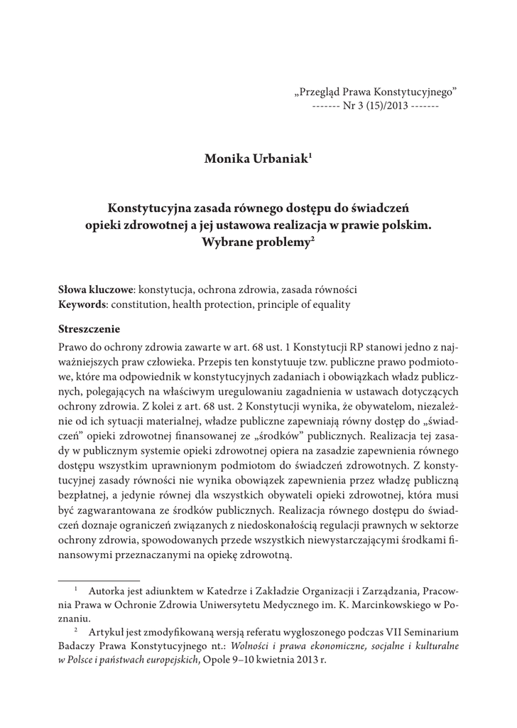 „Przegląd Prawa Konstytucyjnego” ------- Nr 3 (15)/2013 ------- Monika Urbaniak1 Konstytucyjna zasada równego dostępu do świadczeń opieki zdrowotnej a jej ustawowa realizacja w prawie polskim. Wybrane problemy2 Słowa kluczowe: konstytucja, ochrona zdrowia, zasada równości Keywords: constitution, health protection, principle of equality Streszczenie Prawo do ochrony zdrowia zawarte w art. 68 ust. 1 Konstytucji RP stanowi jedno z najważniejszych praw człowieka. Przepis ten konstytuuje tzw. publiczne prawo podmiotowe, które ma odpowiednik w konstytucyjnych zadaniach i obowiązkach władz publicznych, polegających na właściwym uregulowaniu zagadnienia w ustawach dotyczących ochrony zdrowia. Z kolei z art. 68 ust. 2 Konstytucji wynika, że obywatelom, niezależnie od ich sytuacji materialnej, władze publiczne zapewniają równy dostęp do „świadczeń” opieki zdrowotnej finansowanej ze „środków” publicznych. Realizacja tej zasady w publicznym systemie opieki zdrowotnej opiera na zasadzie zapewnienia równego dostępu wszystkim uprawnionym podmiotom do świadczeń zdrowotnych. Z konstytucyjnej zasady równości nie wynika obowiązek zapewnienia przez władzę publiczną bezpłatnej, a jedynie równej dla wszystkich obywateli opieki zdrowotnej, która musi być zagwarantowana ze środków publicznych. Realizacja równego dostępu do świadczeń doznaje ograniczeń związanych z niedoskonałością regulacji prawnych w sektorze ochrony zdrowia, spowodowanych przede wszystkich niewystarczającymi środkami finansowymi przeznaczanymi na opiekę zdrowotną. Autorka jest adiunktem w Katedrze i Zakładzie Organizacji i Zarządzania, Pracownia Prawa w Ochronie Zdrowia Uniwersytetu Medycznego im. K. Marcinkowskiego w Poznaniu. 2 Artykuł jest zmodyfikowaną wersją referatu wygłoszonego podczas VII Seminarium Badaczy Prawa Konstytucyjnego nt.: Wolności i prawa ekonomiczne, socjalne i kulturalne w Polsce i państwach europejskich, Opole 9–10 kwietnia 2013 r. 1 PRZEGLĄD PRAWA KONSTYTUCYJNEGO 2013/3 80 Summary The constitutional principle of equal access to health care services and its statutory implementation in Polish law. Selected problems The right to health contained in art. 68 paragraph 1 of the Constitution is one of the most important human rights. This provision constitutes the so-called public subjective right, which has its equivalent in the constitutional roles and obligations of public authorities, involving the proper settlement of the issues in the laws relating to the protection of health. In turn, art. 68 paragraph 2 of the Constitution reads that citizens, regardless of their financial situation, public authorities provide equal access to health care services financed from public funds. The implementation of this principle in the public health care system is based on the principle of ensuring equal access for all qualified entities to health services. The constitutional principle of equality does not promise the obligation of public authorities to provide free but only equal health care for all citizens, which must be guaranteed by public funds. The implementation of equal access to benefits is limited with imperfect regulation in the health sector, primarily due to insufficient funds allocated to healthcare. * Prawo do ochrony zdrowia wynikające z art. 68 Konstytucji RP stanowi jedno z najważniejszych praw człowieka i zajmuje szczególną pozycję w ustawie zasadniczej. Umieszczone zostało w katalogu praw i wolności ekonomicznych, socjalnych i kulturalnych. Prawo to jest zaliczane do kategorii praw socjalnych, z którym powinno się korzystać bez względu na jakiekolwiek kryteria. Prawa socjalne są to uprawnienia, które gwarantują jednostce podstawowe dobra, niezbędne do godnego życia w społeczeństwie3. Stanowią one prawa szczególnego rodzaju, w celu realizacji których państwo ma obowiązek podejmowania działań pozytywnych, pozwalających jednostce na korzystanie z danego prawa4. J. Karp, Prawa socjalne we współczesnym konstytucjonalizmie. Prolegomena, [w:] Ustroje, doktryny, instytucje polityczne. Księga jubileuszowa Profesora zw. dra hab. Mariana Grzybowskiego, red. J. Czajowski, J. Karp, G. Kuca, A. Kulig, P. Mikuli, A. Opałek, Kraków 2007, s. 150. 4 B. Zawadzka, Prawa ekonomiczne, socjalne i kulturalne, Warszawa 1996, s. 7. 3 Monika Urbaniak • Konstytucyjna zasada równego dostępu do świadczeń opieki... 81 Przedmiotem art. 68 Konstytucji nie jest zdrowie, a wyłącznie jego ochrona. Zauważyć przy tym należy, że ani Konstytucja, ani ustawy zwykłe nie wprowadzają definicji zdrowia. Przy jej ustalaniu należy posłużyć się definicją Konstytucji Światowej Organizacji Zdrowia (WHO) z dnia 22 lipca 1946 r., zgodnie z którą zdrowie to nie tylko całkowity brak choroby, czy kalectwa, ale także stan pełnego, fizycznego, umysłowego i społecznego dobrostanu (dobrego samopoczucia). W zmodyfikowanej definicji zdrowia WHO, która została przyjęta w dniu 12 sierpnia 1978 r. w Ałma-Acie, zaproponowano nowe podejście do zdrowia, określając je jako „stan zupełnej pomyślności fizycznej, psychicznej i społecznej, który pozwala ludziom prowadzić socjalnie i ekonomicznie produktywne życie”. Na podkreślenie zasługuje fakt, że również określenie „opieka zdrowotna” nie jest zdefiniowane w Konstytucji. Termin ten ma charakter ogólny i obejmuje nie tylko czynności medyczne, lecz także inne z zakresu administracji, organizacji, komunikacji, opieki duchowej itp., które łącznie składają się na treść zobowiązania opieki zdrowotnej. Przez termin „ochrona zdrowia” należy rozumieć zatem różne zadania władz publicznych dotyczące zarówno zapewnienia opieki zdrowotnej, jak i promocji zdrowego trybu życia poprzez działania związane z zapobieganiem chorobom i eliminowania zagrożeń dla zdrowia5, a także z osiąganiem optymalnego stanu zdrowia6. Treść art. 68 ust. 1 i 2 Konstytucji nie 