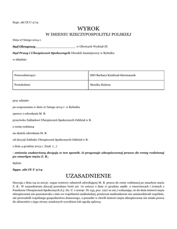 Sygn. akt IX U 2/14 WYROK W IMIENIU RZECZYPOSPOLITEJ POLSKIEJ Dnia 27 lutego 2014 r. Sąd Okręgowy___________________ w Gliwicach Wydział IX Sąd Pracy i Ubezpieczeń Społecznych Ośrodek Zamiejscowy w Rybniku w składzie: Przewodniczący: SSO Barbara Kużdrzał-Kiermaszek Protokolant: Monika Holona przy udziale: po rozpoznaniu w dniu 27 lutego 2014 r. w Rybniku sprawy z odwołania M. B. przeciwko Zakładowi Ubezpieczeń Społecznych Oddział w R. o rentę rodzinną na skutek odwołania M. B. od decyzji Zakładu Ubezpieczeń Społecznych Oddział w R. z dnia 4 grudnia 2013 r. Znak (...) - zmienia zaskarżoną decyzję w ten sposób, iż przyznaje ubezpieczonej prawo do renty rodzinnej po zmarłym mężu Z. B.. Sędzia Sygn. akt IX U 2/14 UZASADNIENIE Decyzją z dnia 04.12.2013r. organ rentowy odmówił odwołującej M. B. prawa do renty rodzinnej po zmarłym mężu Z. B.. W uzasadnieniu decyzji powołano treść art. 70 ustawy z dnia 17 grudnia 1998r. o emeryturach i rentach z Funduszu Ubezpieczeń Społecznych (t.j. Dz. U. z 2009r. Nr 153, poz. 1227 ze zm.) wskazując, że do dnia śmierci męża ubezpieczona nie pozostawała z nim we wspólności małżeńskiej, ponieważ małżonkowie nie zamieszkiwali wspólnie, nie prowadzili wspólnego gospodarstwa domowego, a ponadto w chwili śmierci męża ubezpieczona nie miała prawa do alimentów z jego strony ustalonych wyrokiem lub ugodą sądową. W odwołaniu od powyższej decyzji ubezpieczona domagała się jej zmiany i przyznania prawa do renty rodzinnej podnosząc, iż pobyt męża w (...) był podyktowany brakiem możliwości zapewnienia mu w ostatnich latach życia stałej opieki z jej strony, co było spowodowane stanem zdrowia ubezpieczonej. W odpowiedzi na odwołanie organ rentowy wniósł o jego oddalenie, podtrzymując swoje stanowisko zawarte w uzasadnieniu decyzji. Sąd Okręgowy Sąd Pracy i Ubezpieczeń Społecznych ustalił następujący stan faktyczny: Odwołująca, urodzona (...), złożyła w dniu 13.11.2013r. wniosek o rentę rodzinną po zmarłym w dniu 02.11.2013r. mężu Z. B.. W dniu 04.12.2013r. Zakład Ubezpieczeń Społecznych O/R. wydał zaskarżoną decyzję odmowną, uzasadniając odmowę przyznania świadczenia brakiem wspólności małżeńskiej. Odwołująca w dniu 08.05.1982r. zawarła związek małżeński z Z. B.. Dziewięć miesięcy później mąż zachorował na stwardnienie rozsiane. Małżonkowie zamieszkiwali razem, prowadzili wspólne gospodarstwo domowe. Choroba szybko postępowała i tak już od maja 1985r. był on uprawniony do renty w wysokości odpowiadającej pierwszej grupie inwalidzkiej. Ubezpieczona nie pracowała, sama opiekowała się chorym mężem. W późniejszym okresie pomagała jej dorastająca córka. Mąż ubezpieczonej ważył około 100 kg, ubezpieczona zaś 45 kg. Zamieszkiwali w budynku kolejowym na pierwszym. Miał problem z poruszaniem się. Wychodził z domu tylko w wyjątkowych sytuacjach. Nie potrafił już w ogóle chodzić po schodach, więc siadał na schody a ubezpieczona sama ściągała go za nogi po kolejnych stopniach w dół. Tym samym sposobem wracał do domu, jednak wówczas zawsze musiała prosić o pomoc jeszcze inną osobę. Po latach sprawowania opieki nad chorym mężem ubezpieczona zaczęła odczuwać dolegliwości kręgosłupa. Ból nie pozwalał jej nawet spać. Wówczas Z. B. podjął decyzję o umieszczeniu go w domu opieki. Jego renta inwalidzka nie wystarczała na pokrycie związanych z tym kosztów, więc pozostała część była finansowana przez opiekę społeczną. Ubezpieczona starała się odwiedzać męża jak najczęściej, jednak musiała to pogodzić z opieką nad dziećmi. Mąż ubezpieczonej miał tam zapewnioną całodobową opiekę specjalistyczną, specjalne łóżko, mógł też na wózku wyjeżdżać na dwór. Ubezpieczona również podupadła na zdrowiu. Po wylewie została sparaliżowana. Przez okres sześciu miesięcy nie potrafiła wstać z łóżka, później przez rok poruszała się na wózku. Później ponownie zaczęła odwiedzać męża. Małżonkowie przez cały ten czas utrzymywali kontakt telefoniczny. Wspólnie uzgadniali sprawy dotyczące wychowania dzieci. Z. B. zmarł 02.11.2013r. Ubezpieczona do dnia zgonu męża była zgłoszona przez niego do ubezpieczenia zdrowotnego jako członek rodziny rencisty. Powyższy stan faktyczny Sąd ustalił w oparciu o dokumentację akt organu rentowego, zaświadczenie Domu Pomocy Społecznej (...) z dnia 14.02.2014r. (k.11a.s.), zaświadczenie lekarskie z dnia 10.02.2014r. (k.10 a.s.) oraz zeznania ubezpieczonej (nagranie z rozprawy w dniu 27.02.2014r. minuty od 00:02:55 do 00:13:23). Sąd zważył, co następuje: Odwołanie ubezpieczonej zasługuje na uwzględnienie. Zgodnie z art. 65 ust. 1 ustawy z dnia 17 grudnia 1998r. o rentach i emeryturach z Funduszu Ubezpieczeń Społecznych (tekst jednolity Dz. U. z 2009r., Nr 153, poz. 1227) renta rodzinna przysługuje uprawnionym członkom rodziny osoby, która w chwili śmierci miała ustalone prawo do renty lub emerytury lub spełniała warunki wymagane do uzyskania jednego z tych świadczeń. Wśród osób uprawnionych art. 67 ust.1 pkt 3 wymienia małżonka. Stosownie do treści art. 70 ust. 1 powołanej wyżej ustawy wdowa ma prawo do renty rodzinnej jeżeli: 1)w chwili śmierci męża osiągnęła wiek 50 lat lub była niezdolna do pracy albo 2) wychowuje co najmniej jedno z dzieci, wnuków lub rodzeństwa uprawnione do renty rodzinnej po zmarłym mężu, które nie osiągnęło 16 lat, a jeżeli kształci się w szkole - 18 lat życia, lub jeżeli sprawuje pieczę nad dzieckiem całkowicie niezdolnym do pracy oraz do samodzielnej egzystencji lub całkowicie niezdolnym do pracy, uprawnionym do renty rodzinnej. W myśl ust. 2, prawo do renty rodzinnej nabywa również wdowa, która osiągnęła wiek 50 lat lub stała się niezdolna do pracy po śmierci męża, nie później jednak niż w ciągu 5 lat od jego śmierci lub od z