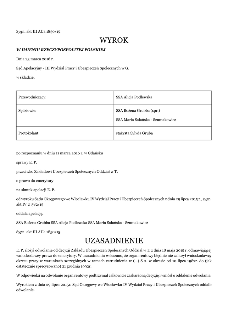 Sygn. akt III AUa 1850/15 WYROK W IMIENIU RZECZYPOSPOLITEJ POLSKIEJ Dnia 23 marca 2016 r. Sąd Apelacyjny - III Wydział Pracy i Ubezpieczeń Społecznych w G. w składzie: Przewodniczący: SSA Alicja Podlewska Sędziowie: SSA Bożena Grubba (spr.) SSA Maria Sałańska - Szumakowicz Protokolant: stażysta Sylwia Gruba po rozpoznaniu w dniu 11 marca 2016 r. w Gdańsku sprawy E. P. przeciwko Zakładowi Ubezpieczeń Społecznych Oddział w T. o prawo do emerytury na skutek apelacji E. P. od wyroku Sądu Okręgowego we Włocławku IV Wydział Pracy i Ubezpieczeń Społecznych z dnia 29 lipca 2015 r., sygn. akt IV U 382/15 oddala apelację. SSA Bożena Grubba SSA Alicja Podlewska SSA Maria Sałańska - Szumakowicz Sygn. akt III AUa 1850/15 UZASADNIENIE E. P. złożył odwołanie od decyzji Zakładu Ubezpieczeń Społecznych Oddział w T. z dnia 18 maja 2015 r. odmawiającej wnioskodawcy prawa do emerytury. W uzasadnieniu wskazano, że organ rentowy błędnie nie zaliczył wnioskodawcy okresu pracy w warunkach szczególnych w ramach zatrudnienia w (...) S.A. w okresie od 10 lipca 1987r. do (jak ostatecznie sprecyzowano) 31 grudnia 1992r. W odpowiedzi na odwołanie organ rentowy podtrzymał całkowicie zaskarżoną decyzję i wniósł o oddalenie odwołania. Wyrokiem z dnia 29 lipca 2015r. Sąd Okręgowy we Włocławku IV Wydział Pracy i Ubezpieczeń Społecznych oddalił odwołanie. Powyższe rozstrzygnięcie Sąd Okręgowy oparł na następujących ustaleniach i rozważaniach: Wnioskodawca urodził się dnia (...) Wnioskodawca pracował w (...) S.A. w okresie od dnia 2 maja 1979 r. do dnia 7 czerwca 1982 r. jako aparatowy produkcji kwasu azotowych, w okresie od dnia 8 czerwca 1982 r. do dnia 31 lipca 1983 r. jako aparatowy procesów polimeryzacji, w okresie od dnia 1 sierpnia 1983 r. do dnia 31 grudnia 1986 r. jako aparatowy procesów kondensacji i polimeryzacji, w okresie od dnia 1 sierpnia 1986 r. do dnia 9 lipca 1987 r. jako aparatowy procesów kondensacji i polimeryzacji – sterowniczy, w okresie od dnia 10 lipca 1987 r. do dnia 31 grudnia 1992 r. jako kierownik magazynu inwestycyjnego (w którym zgromadzone były wszelkie materiały i środki inwestycyjne), w okresie od dnia 1 stycznia 1993 r. do dnia 31 grudnia 1998 r. jako starszy magazynier w tym samym magazynie o takim samym asortymencie (jedynie o zmienionej nazwie),. Wnioskodawca na dzień 1 stycznia 1999 r. legitymował się okresami składkowymi i nieskładkowymi w wymiarze co najmniej 25 lat. W dniu 10 marca 2015 r. wnioskodawca złożył do organu rentowego wniosek o emeryturę. W dniu 18 maja 2015 r. organ rentowy wydał decyzję odmawiającą wnioskodawcy prawa do świadczenia. Wnioskodawca nie jest członkiem otwartego funduszu emerytalnego (dalej OFE). Sąd I instancji zważył, iż żądaniem wnioskodawcy objęte było świadczenie emerytalne uregulowane w art. 184 ust. 1 i 2 w zw. z art. 32 ustawy z dnia 17 grudnia 1998 r. o emeryturach i rentach z Funduszu Ubezpieczeń Społecznych (j. t. Dz. U. z 2015 r., poz. 748; dalej: ustawy o emeryturach i rentach z FUS albo ustawy) w zw. z § 4 ust. 1 pkt. 1 i 3 w zw. z § 2 ust. 1 rozporządzenia Rady Ministrów z dnia 7 lutego 1983 r. w sprawie wieku emerytalnego pracowników zatrudnionych w szczególnych warunkach lub w szczególnym charakterze (Dz. U Nr 8, poz. 43 ze zm.; dalej: rozporządzenia w sprawie wieku emerytalnego). Zgodnie z powołanymi przepisami ubezpieczonemu mężczyźnie urodzonemu po dniu 31 grudnia 1948 r. przysługuje emerytura po osiągnięciu wieku 60 lat, jeżeli do dnia 1 stycznia 1999 r. w wymiarze co najmniej 15 lat wykonywał stale i w pełnym wymiarze czasu pracy obowiązującym na danym stanowisku prace w szczególnych warunkach wymienione w wykazie A, stanowiącym załącznik do rozporządzenia w sprawie wieku emerytalnego oraz osiągnął okres składkowy i nieskładkowy wynoszący 25 lat, a także nie przystąpił do OFE albo złożył wniosek o przekazanie środków zgromadzonych na rachunku w OFE, za pośrednictwem Zakładu, na dochody budżetu państwa. Zgodnie przy tym z § 1 rozporządzenia w sprawie wieku emerytalnego okresami pracy uzasadniającymi prawo do świadczeń na zasadach określonych w tymże rozporządzeniu były okresy, w których praca w szczególnych warunkach lub w szczególnym charakterze była wykonywana stale i w pełnym wymiarze czasu pracy obowiązującym na danym stanowisku pracy. Jednocześnie podkreślić należy, iż nie każda praca – nawet świadczona w trudnych czy też niebezpiecznych lub szkodliwych dla zdrowia warunkach uzasadnia przyznanie emerytury w niższym wieku. Uzasadnia to jedynie wykonywanie stale i w pełnym wymiarze pracy wymienionej w wykazie A stanowiącym załącznik do rozporządzenia w sprawie wieku emerytalnego. Trzeba w tym miejscu nadto podnieść, iż przepisy regulujące materię ubezpieczeń społecznych mają charakter bezwzględnie obowiązujących; oznacza to, iż w sytuacjach w nich określonych muszą być one stosowane przez organ rentowy w sposób ścisły. Niedopuszczalna jest wykładnia rozszerzająca (tak wyrok Sądu Najwyższego z dnia 8 listopada 2006 r., I UK 138/06, Legalis). W świetle przytoczonej regulacji przedmiotem ustaleń Sądu pozostawało spełnienie przez wnioskodawcę wszystkich wskazanych przesłanek nabycia prawa do emerytury w niższym wieku – w pierwszej kolejności w zakresie osiągnięcia wymaganego wieku oraz łącznego stażu ubezpieczeniowego. W tym zakresie wskazany powyżej stan faktyczny ustalony został w znaczącej części na podstawie dokumentów znajdujących się w aktach organu rentowego oraz w aktach osobowych wnioskodawcy dotyczących okresu zatrudnienia w (...) S.A.. Podkreślenia wymaga, że strony postępowania nie kwestionowały autentyczności dokumentów w nich zawartych, a i Sąd nie znalazł podstaw, by zakwestionować ich wiarygodność – poza -częściowo - świadectwem wykonywania pracy w warunkach szczególnych. W świetle 